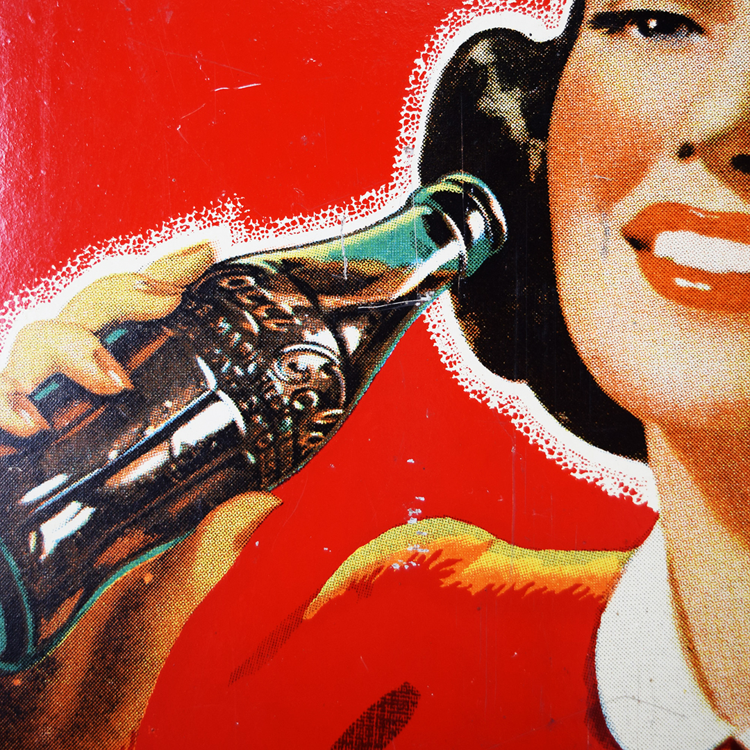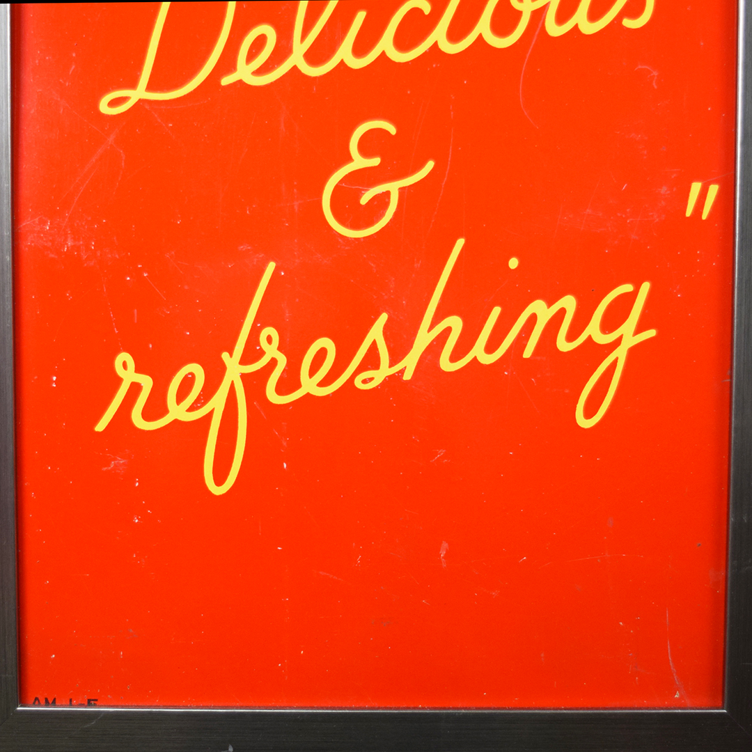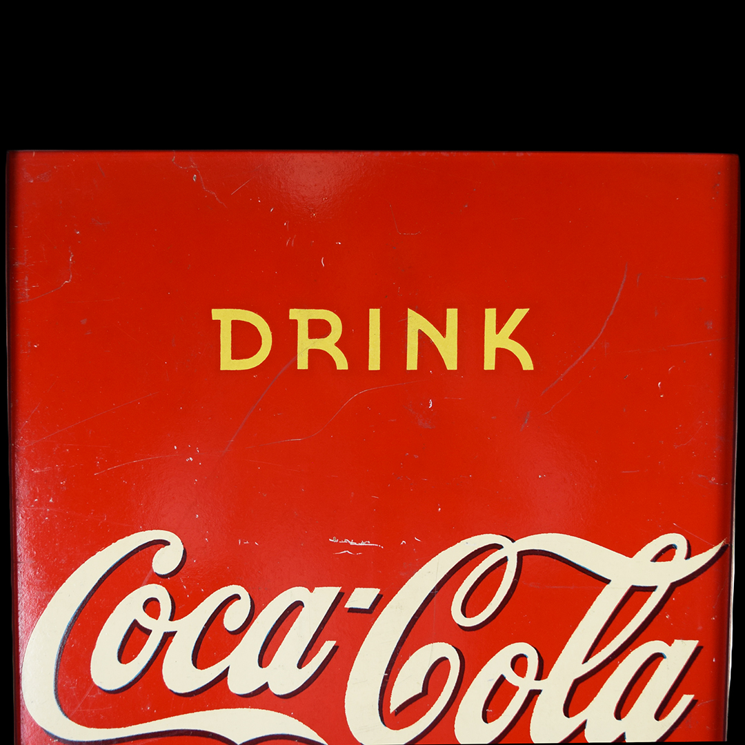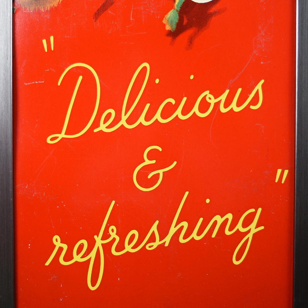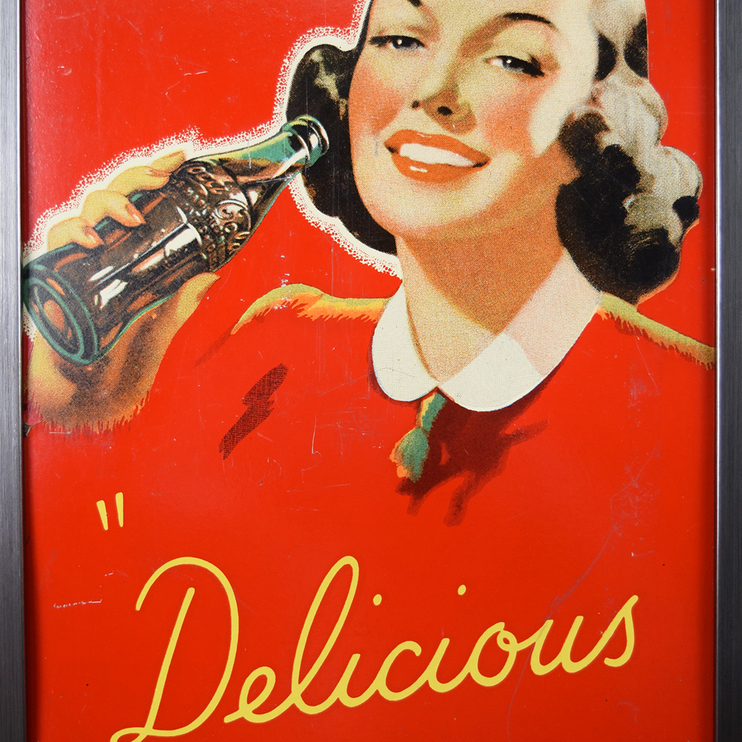 During World War II, metals were needed for military purposes, so sign makers had to adjust the materials that they used. Before the war, all signs were made of tin and other metals, so manufacturers now had to use different materials. Masonite was the choice for Allen Morrison and Coca-Cola on this vertical sign, which features a lady enjoying a bottle of Coca-Cola. The Masonite sign has had a frame added at some point, which allows you to display it nicely in your collection. Minor chips with paint loss are evident on the sign’s face in various places. A few cracks in the Masonite are seen as well. The larger one measures about 3 inches and is on the right side of the sign. A 2-inch one is along the top edge, and a small chip is seen on the left side near her wrist. We do not see any signs of touch-up work, and the gloss is sharp on this 1940s sign. The outer frame measures 52.5 inches tall by 17.75 inches wide. 21567-UEP