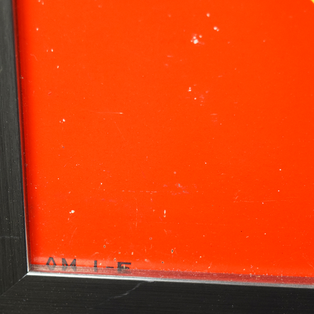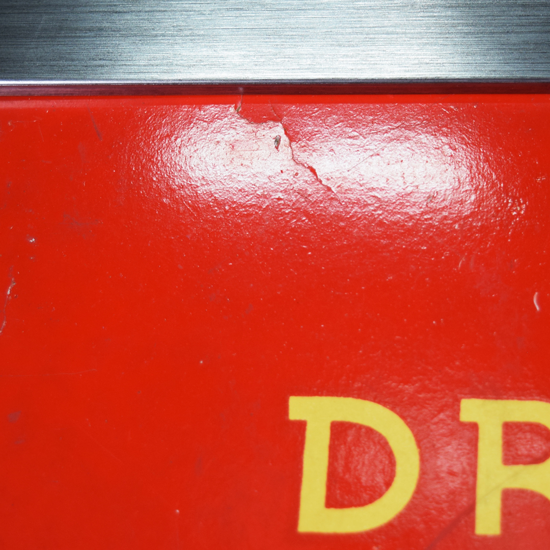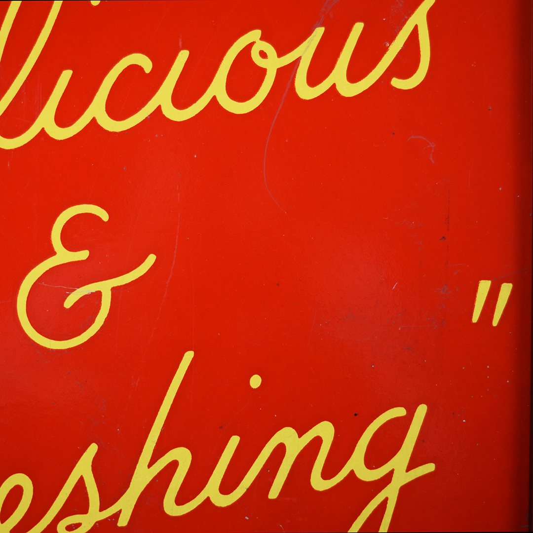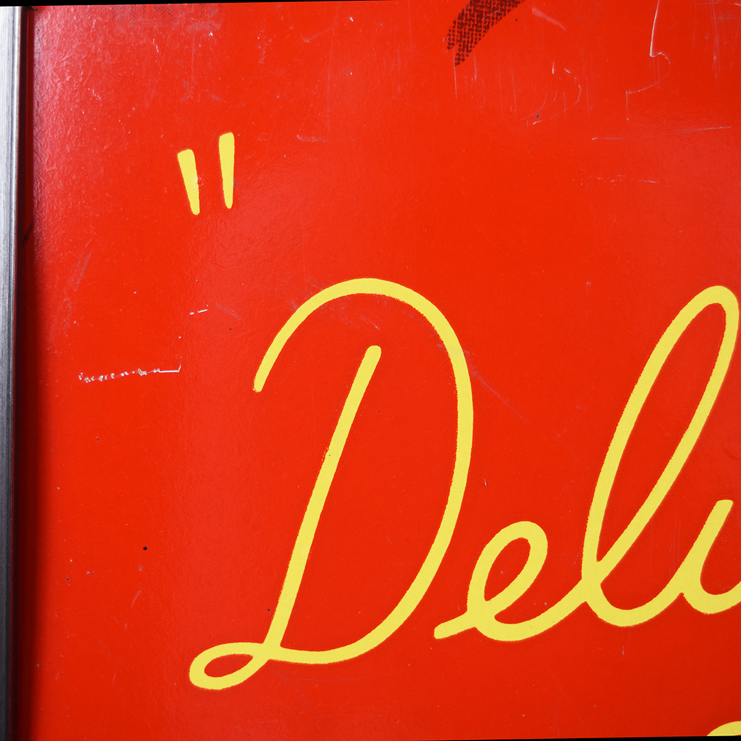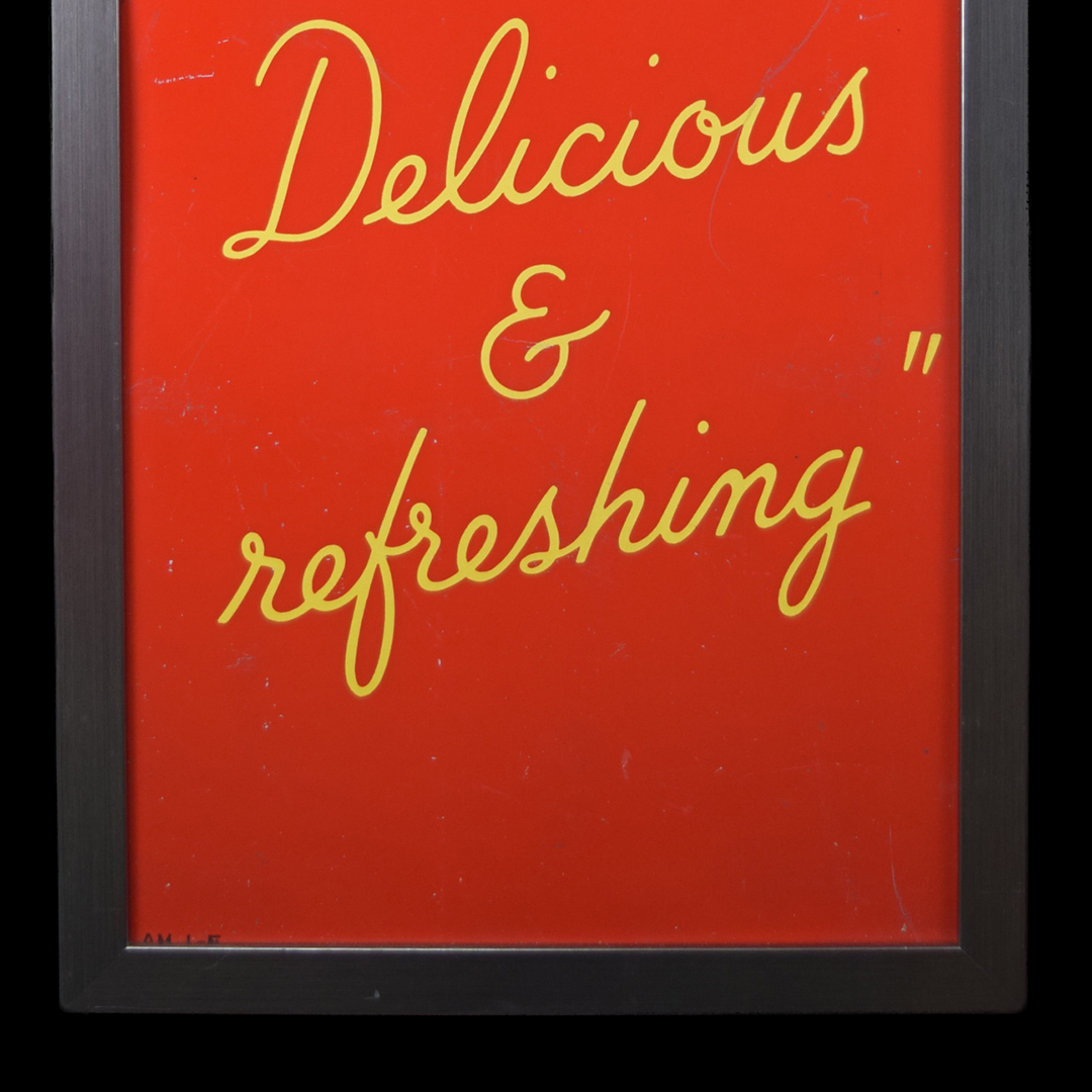 During World War II, metals were needed for military purposes, so sign makers had to adjust the materials that they used. Before the war, all signs were made of tin and other metals, so manufacturers now had to use different materials. Masonite was the choice for Allen Morrison and Coca-Cola on this vertical sign, which features a lady enjoying a bottle of Coca-Cola. The Masonite sign has had a frame added at some point, which allows you to display it nicely in your collection. Minor chips with paint loss are evident on the sign’s face in various places. A few cracks in the Masonite are seen as well. The larger one measures about 3 inches and is on the right side of the sign. A 2-inch one is along the top edge, and a small chip is seen on the left side near her wrist. We do not see any signs of touch-up work, and the gloss is sharp on this 1940s sign. The outer frame measures 52.5 inches tall by 17.75 inches wide. 21567-UEP