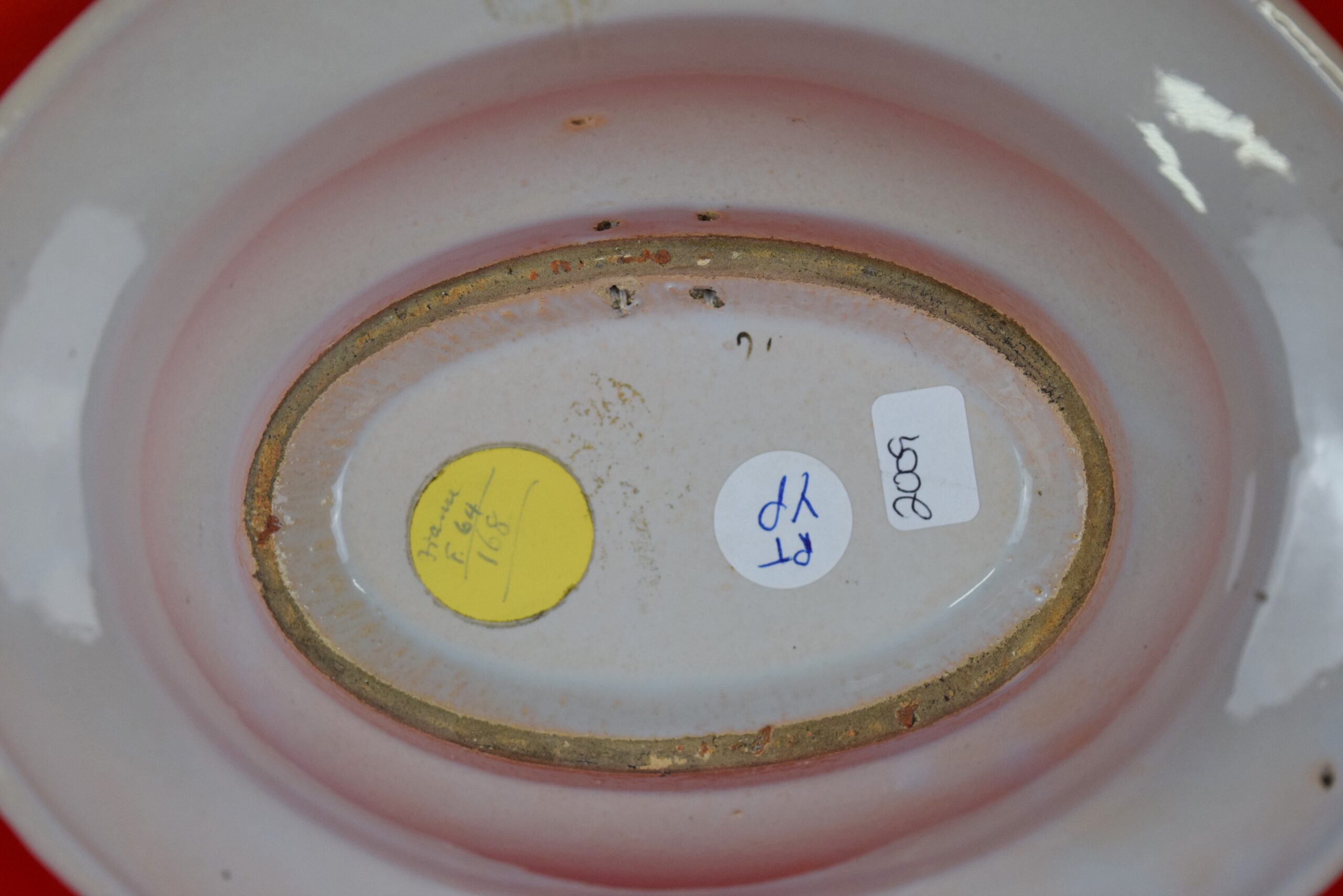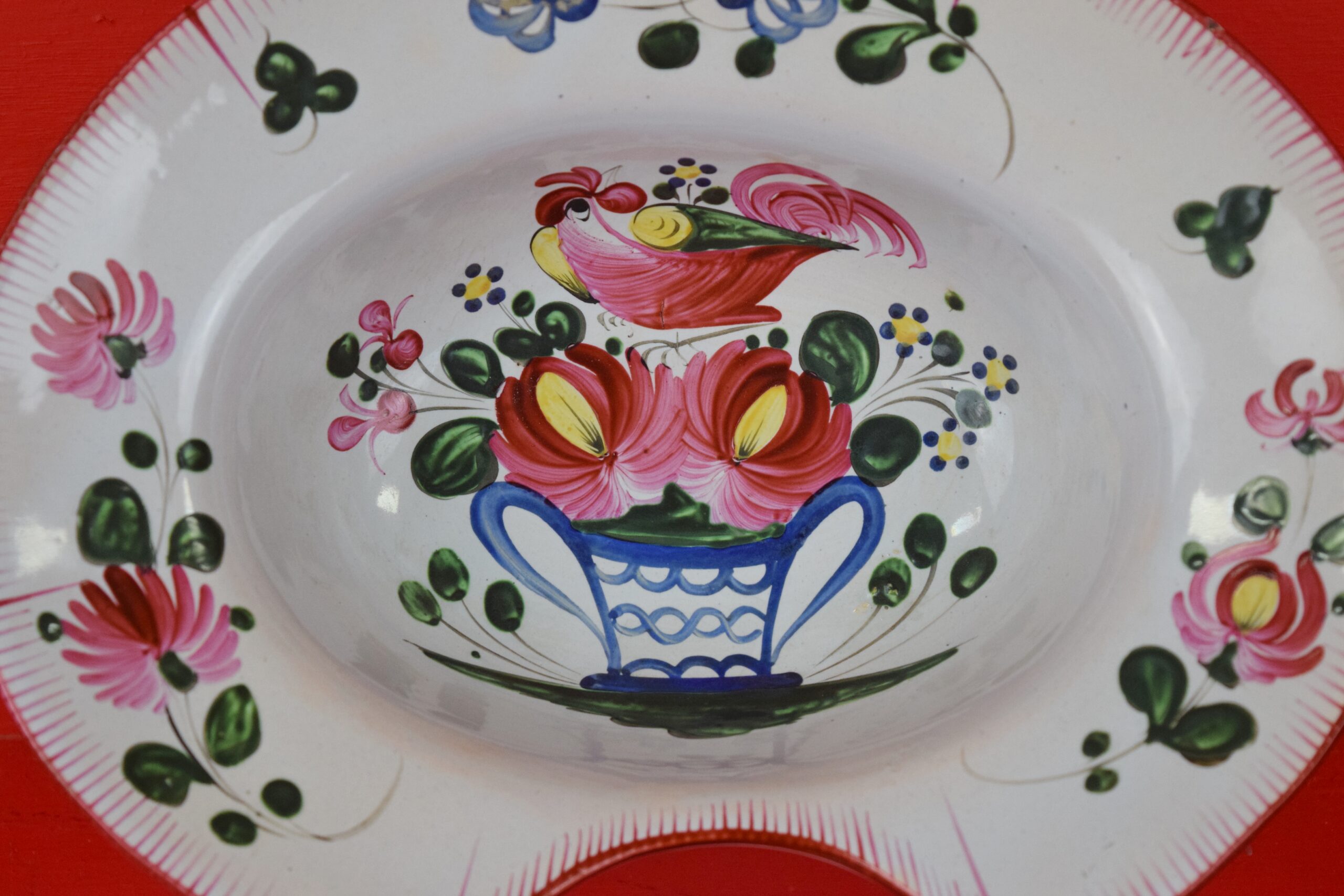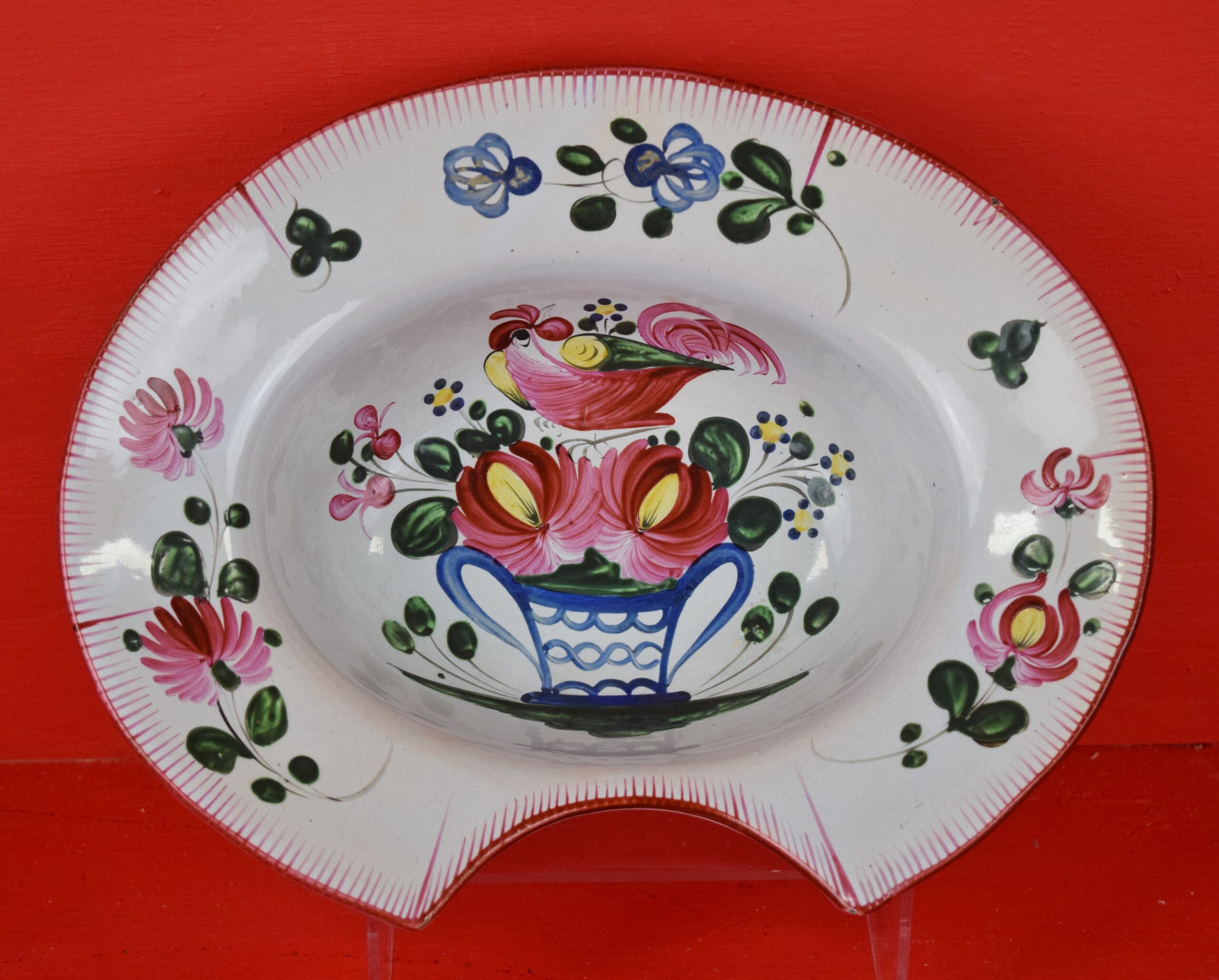 If you look at the history of barbers, you will find that they were similar to doctors in the early years. Known as barber-surgeons, they performed a multitude of tasks, including bloodletting, pulling teeth, setting bones, and treating wounds. This bowl was used for a few purposes, namely bloodletting and pulling teeth. The notch is made to contact the neck, so the bowl would easily hold any blood or fluids that occurred during surgery. The outer lip of the bowl is decorated with flowers along with a nice border artwork. Inside is a two handled cup full of flowers with a bird above it. One small chip is on the outer lip, but no cracks. It also has three mold marks underneath, along with two holes drilled in the base. 2009-YP