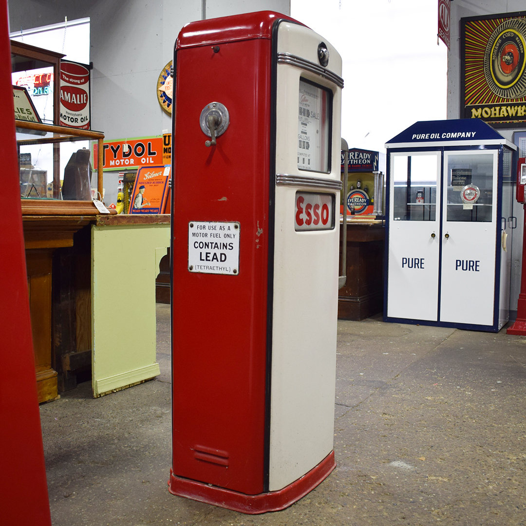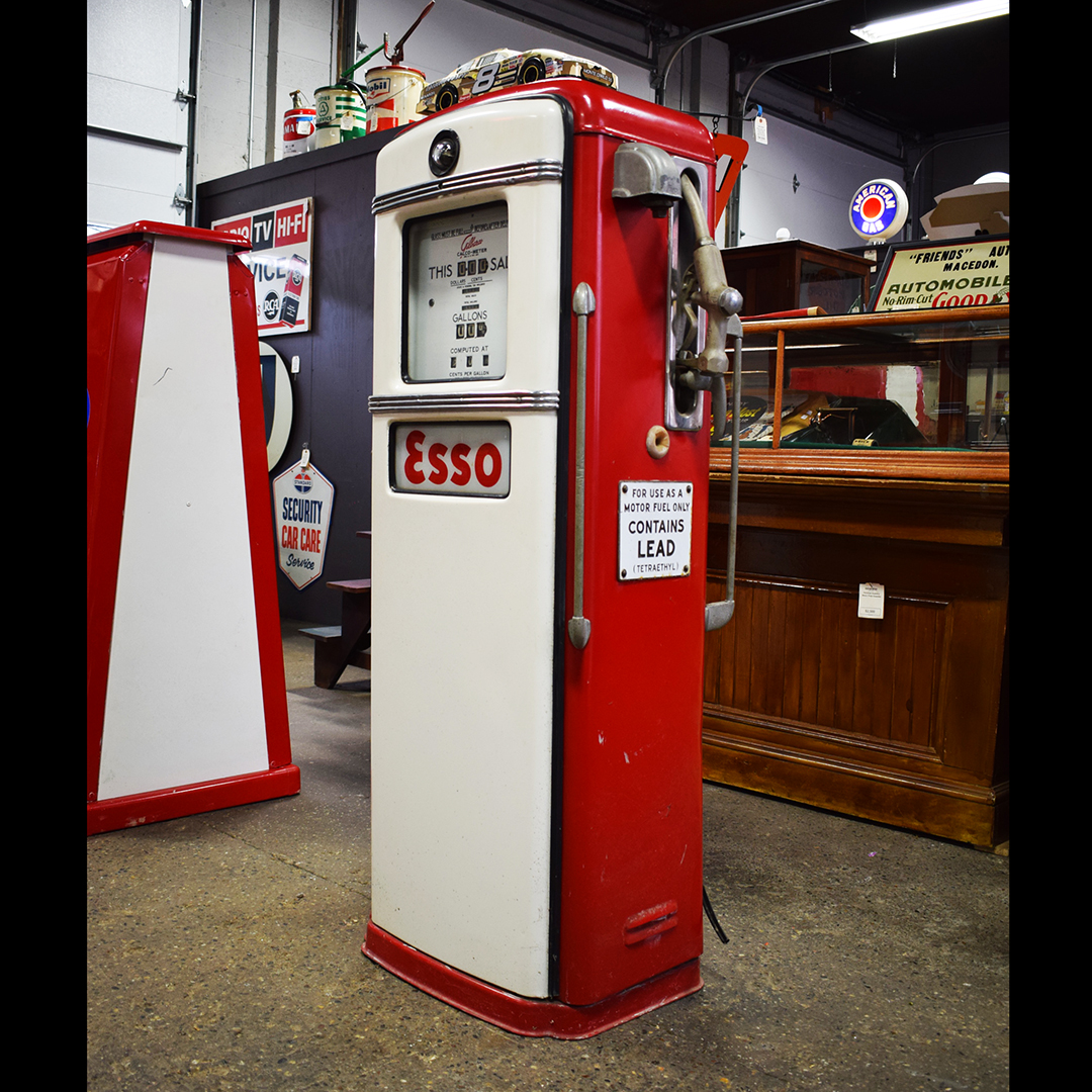 Manufactured by Gilbert & Barker Manufacturing Company, this Gilbarco Model 994A gas pump was used from the late 1940s to the early 1950s and wears Esso colors. We date this pump to 1949 based on the information in “The Gas Pump Bible” book. It stands 58 inches tall by 27 inches wide, and is 18 inches deep. This example does not have a gas globe; it features a plate on top, typical of the model 994. The pump has undergone an older restoration and has held up nicely. Minor chips with paint loss are visible in a few areas. The glasses and signs are original; however, the hose is missing, but the gasoline nozzle is still attached. The chrome handles on the side of the pump have become oxidized over the years, and the aluminum trim has some minor dings. This pump is not a shippable item; it will require pickup at our location in Tasley, Virginia. 21357-QPPP