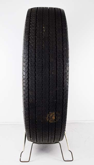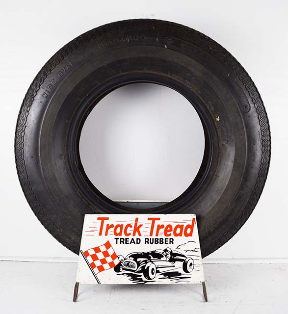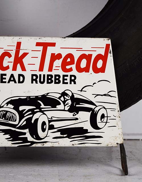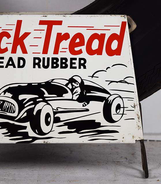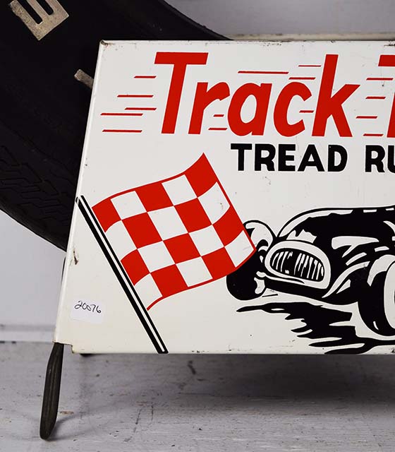 Designed for the racer in mind, this ultra cool Track Tread metal tire stand features a fast race car and driver with a checkered flag in his sight. The black and red graphics look great against the white background. The display is double sided with the same graphic on each side. Some minor wear and chipping can be seen on the outer edges of the metal sign. Included is a raised white letter Gillette Sprint GT tire, size F70-14. Both the stand and the tire are in excellent condition and will look great with your service station display! 20076-RPP