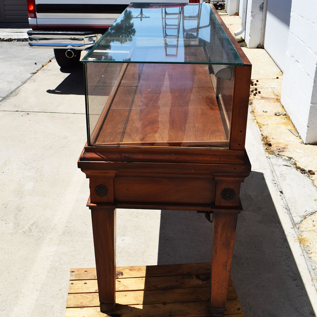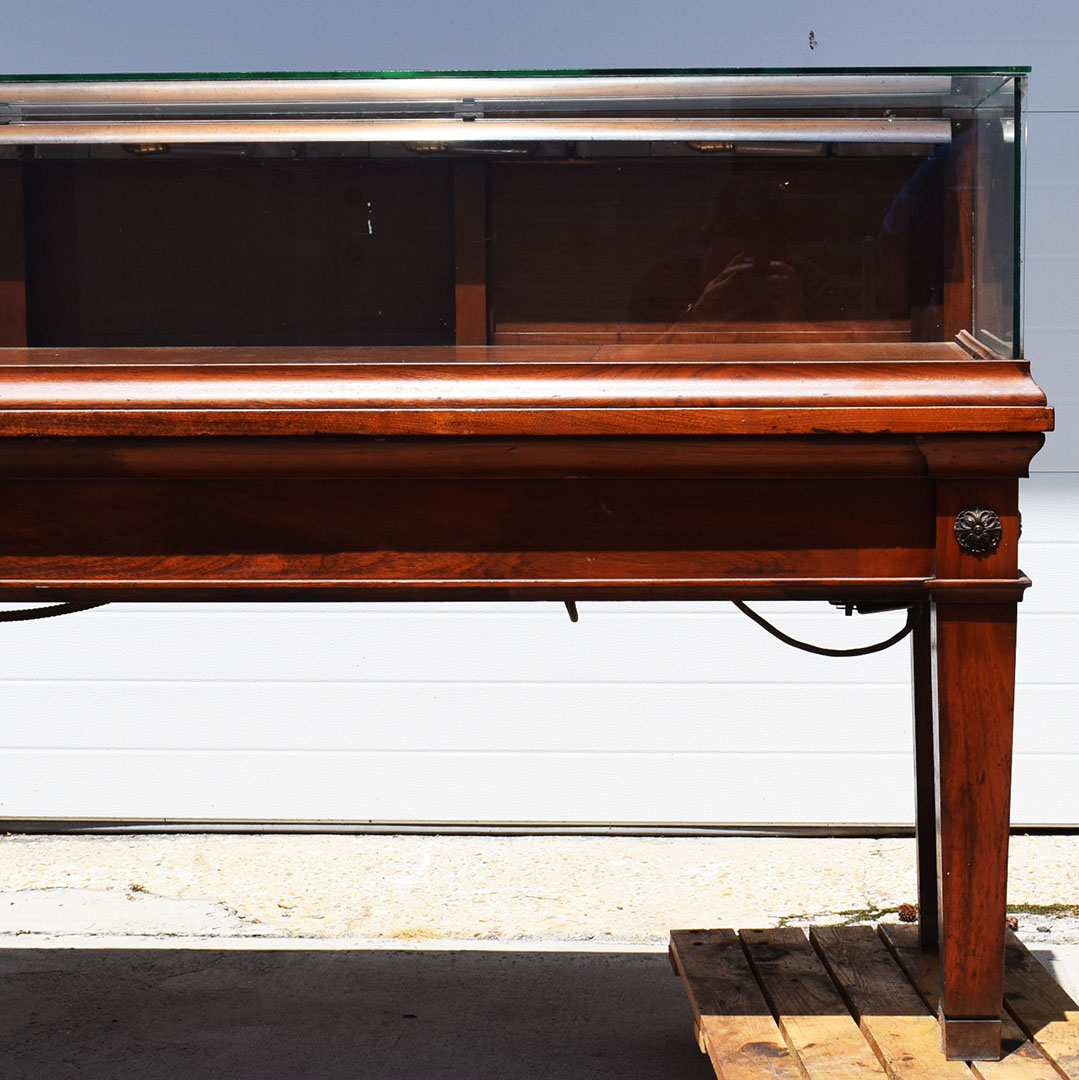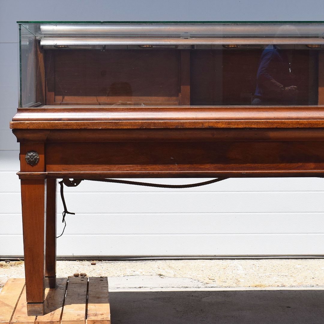 Initially designed for a jewelry store, this beautiful dark Maple glass-top showcase will beautifully display your rare collection. The carved medallion accents on the front add a nice touch of class to this 42-inch tall showcase. It measures 75.5 inches long and 24 inches wide, with an original glass top and sides. Inside, the original lighting system is still intact but needs repair. Three doors in the back slide from side to side to allow access to your display. Below the doors in the back are two drawers for you to use. Due to the size of this fantastic piece, don’t hesitate to contact us for a shipping or delivery quote. 20968-YPP