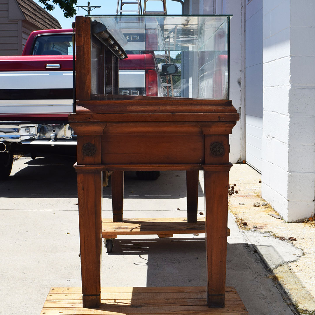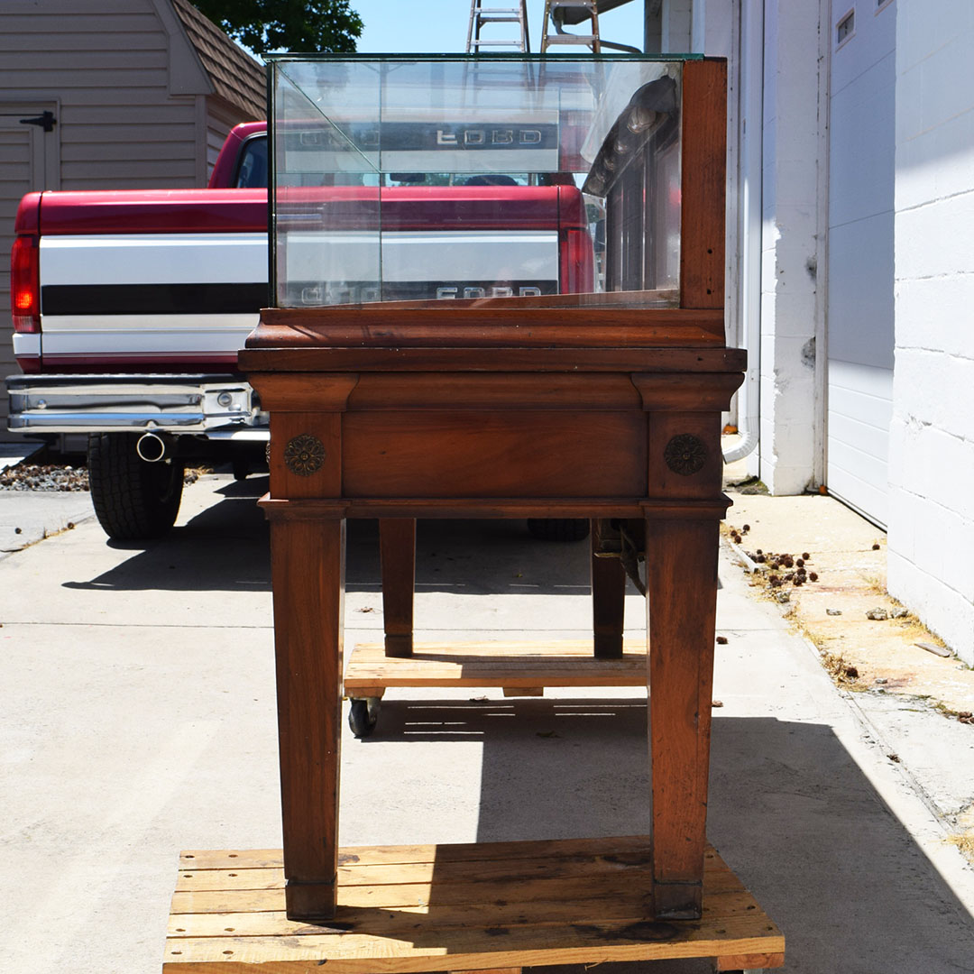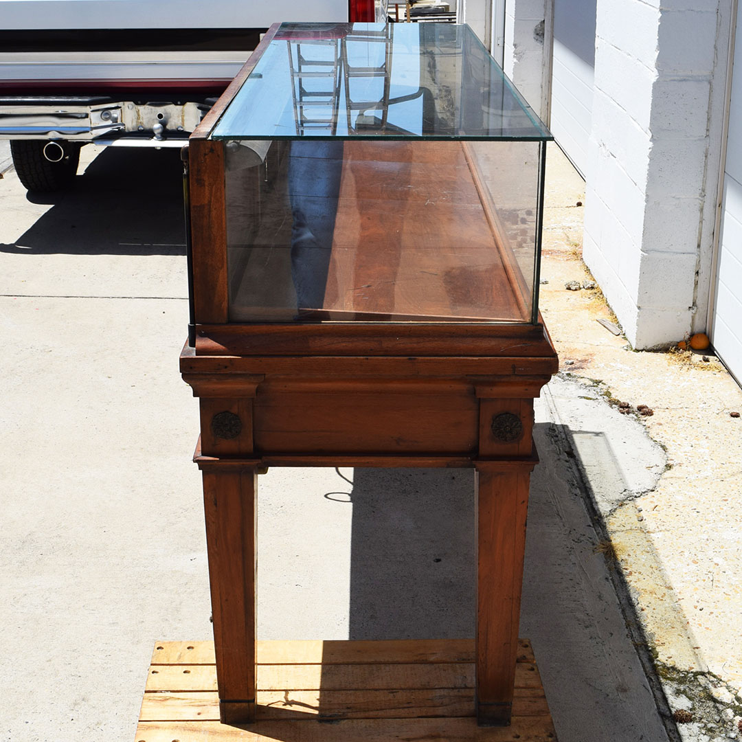 Initially designed for a jewelry store, this beautiful dark Maple glass-top showcase will beautifully display your rare collection. The carved medallion accents on the front add a nice touch of class to this 42-inch tall showcase. It measures 75.5 inches long and 24 inches wide, with an original glass top and sides. Inside, the original lighting system is still intact but needs repair. Three doors in the back slide from side to side to allow access to your display. Below the doors in the back are two drawers for you to use. Due to the size of this fantastic piece, don’t hesitate to contact us for a shipping or delivery quote. 20968-YPP