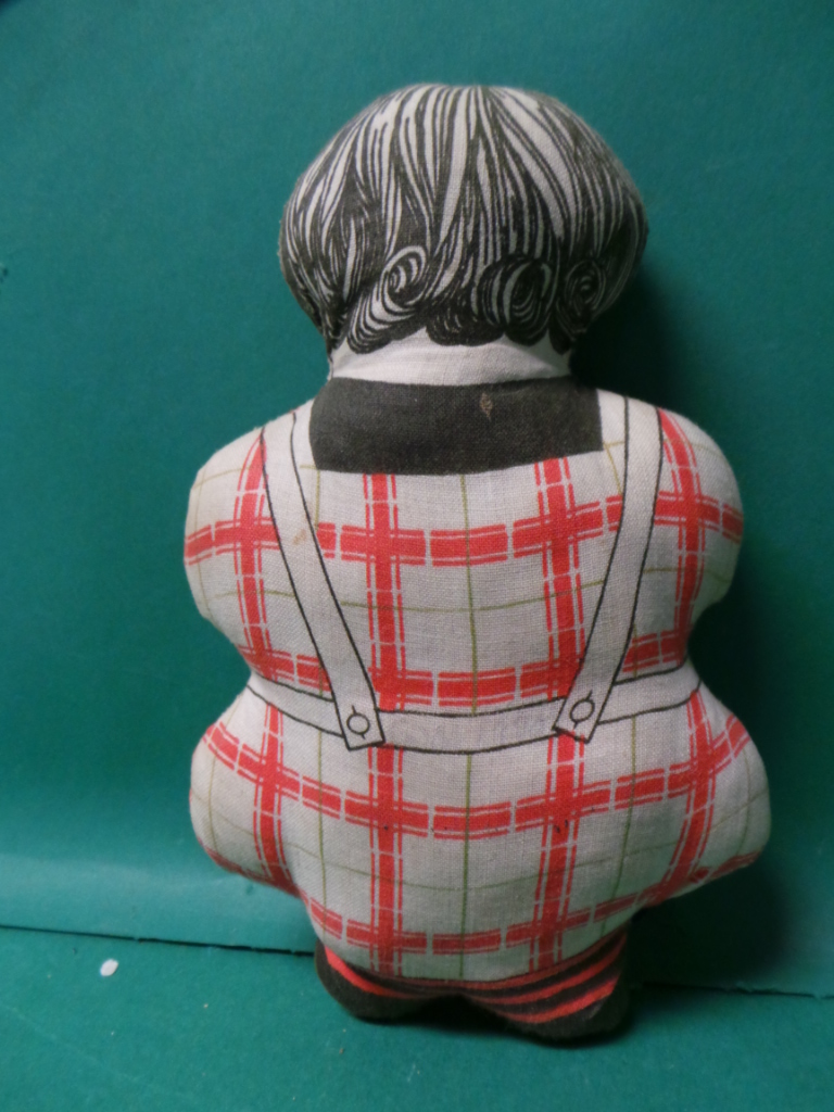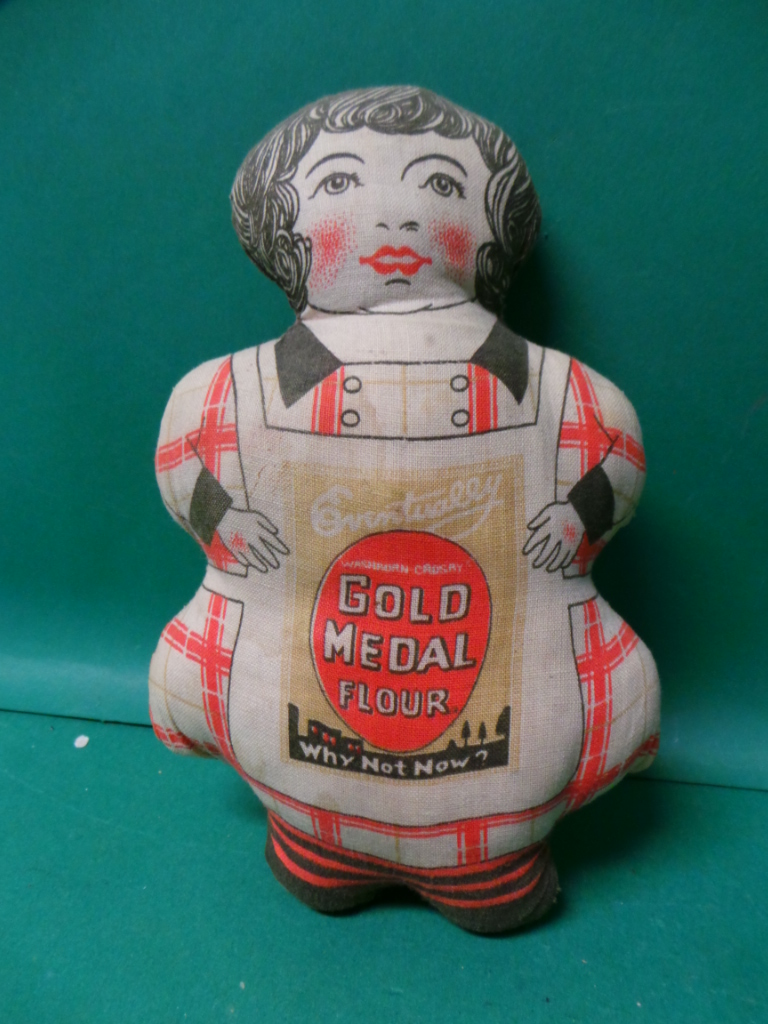 Most likely a free premium given to customers, this scarce little sack cloth doll was made in Germany and dates from the 1920s or 1930s. It is made in the image of a house wife wearing an apron inscribed with the logo “Eventually Gold Medal Flour Why Not Now ?” The doll measures about seven and a half inches tall by five inches wide and is in excellent condition with some light staining and a little fading. 3331-61WT