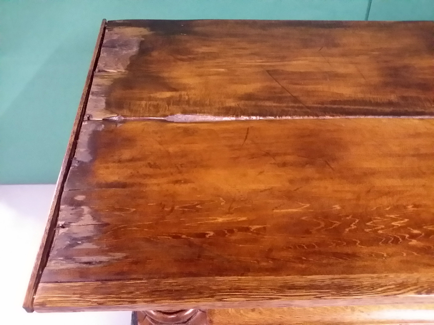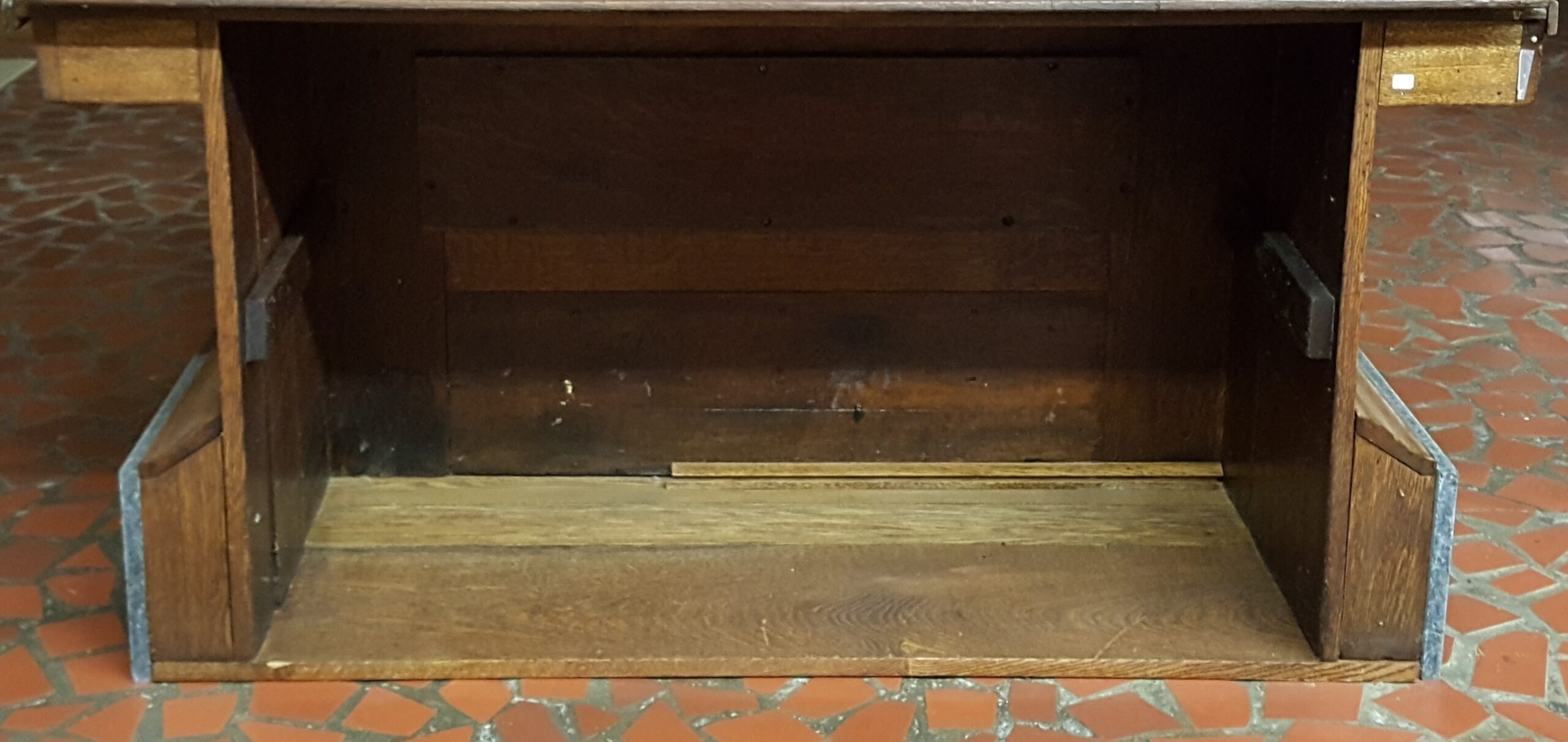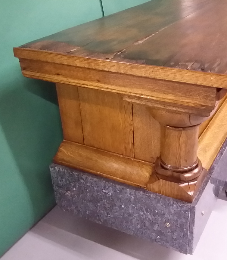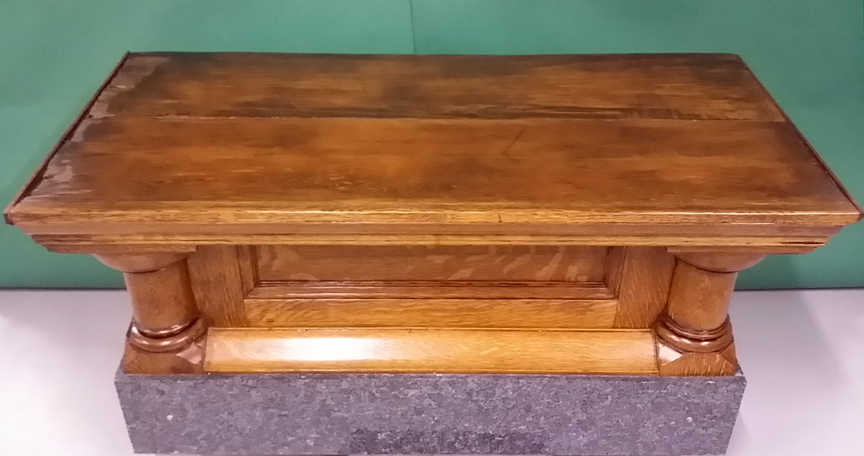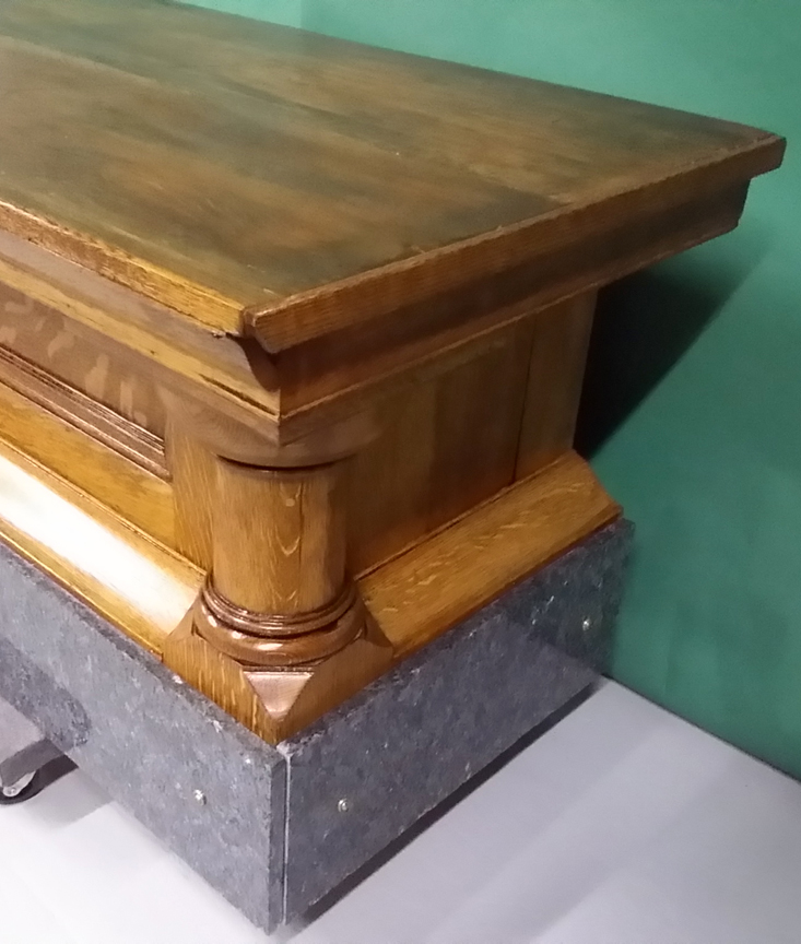 This elegantly styled golden oak counter dates from the 1910’s – 1920’s, it has massive round pillars in the front corners and wide granite baseboards. The top, which was originally covered by a showcase, is made of poplar, and the counter has an open back with a raised floor and brackets for a single shelf. The counter is low and fairly narrow, measuring twenty-eight inches tall by fifty-seven and a half inches wide by twenty-seven and a half inches deep, and is in excellent condition with a recent refinish. There is some moisture damage on one end of the top that has been stabilized and would be covered by a large counter top case. This item will require a 3rd party shipper or pickup. Please contact us for more information. 14852-51IIP