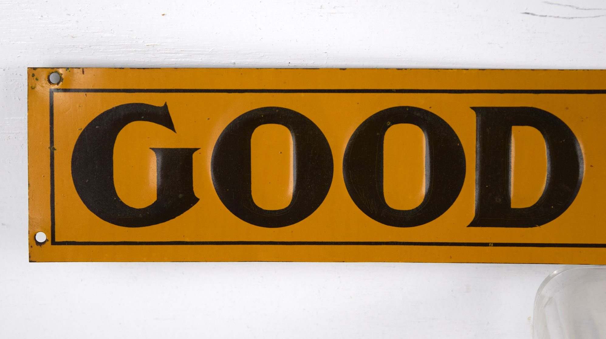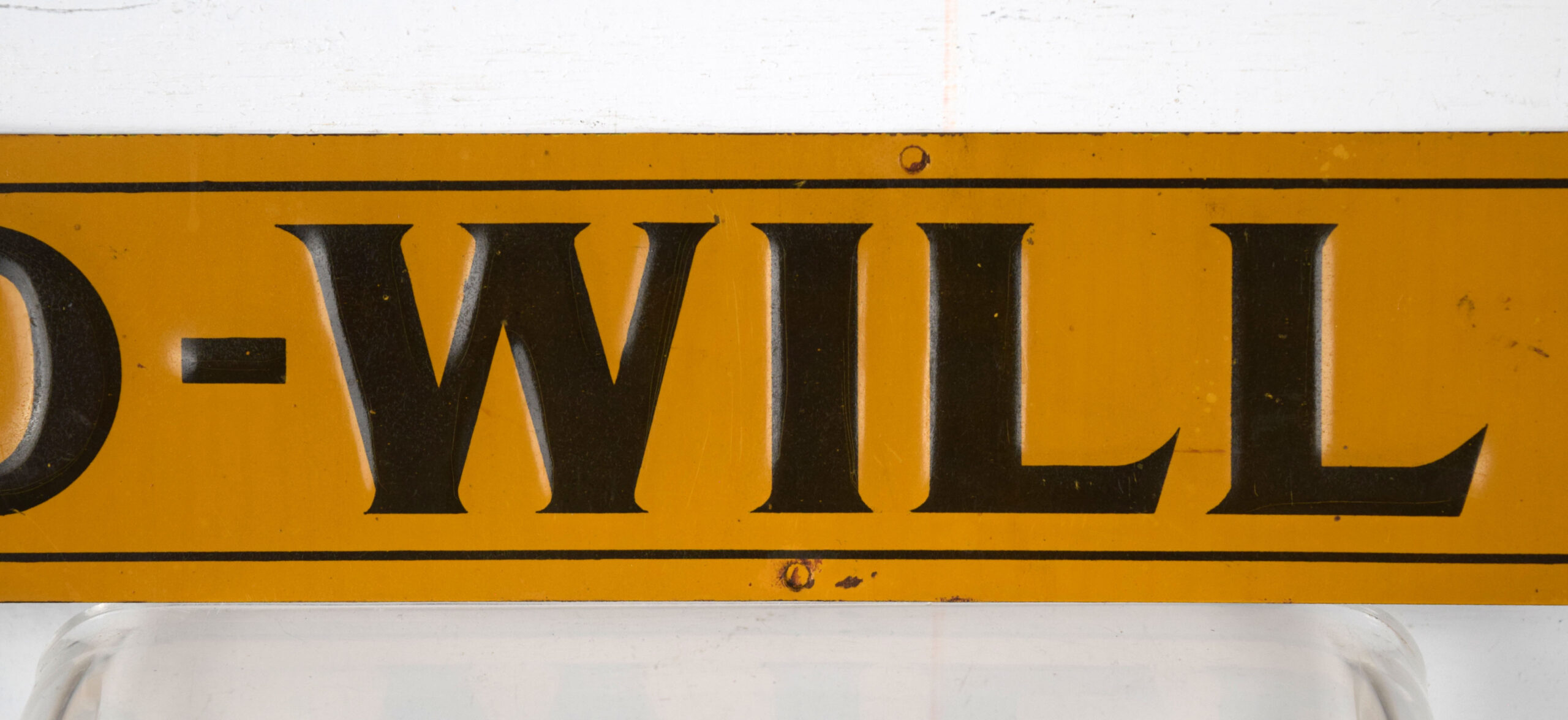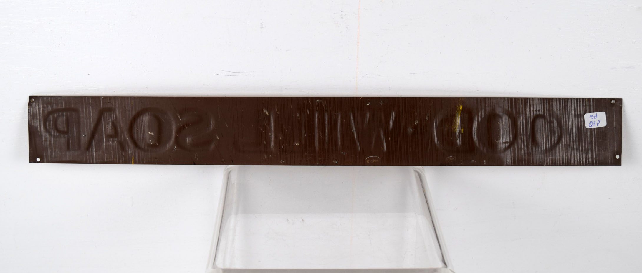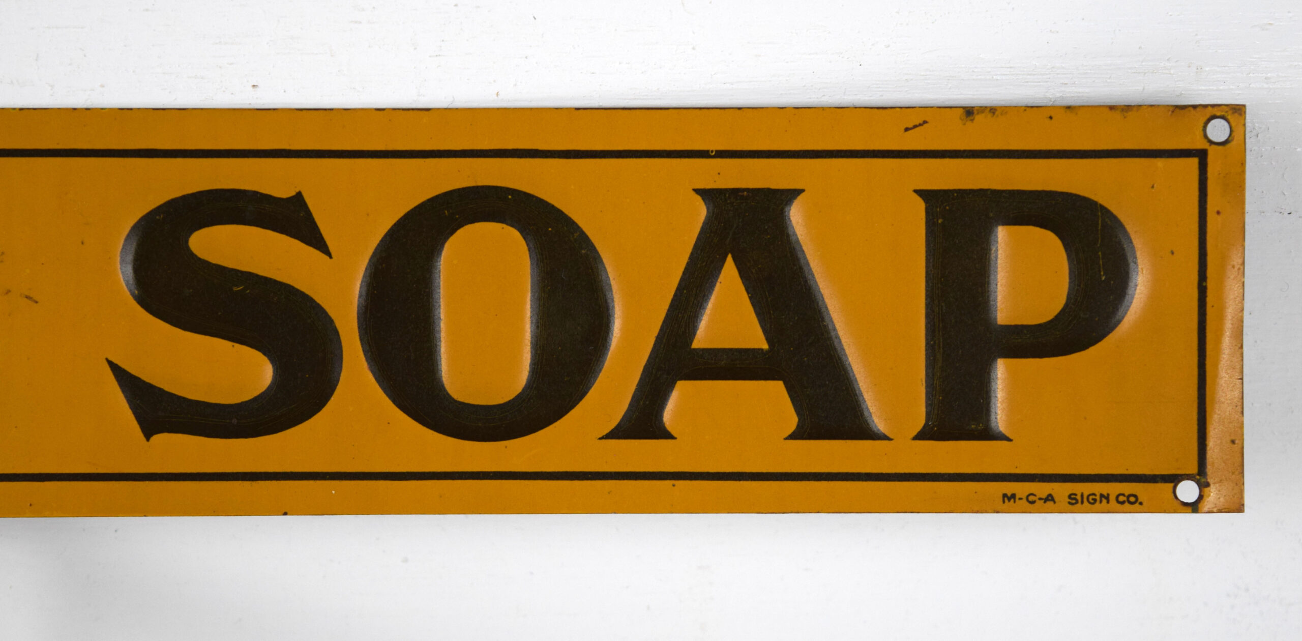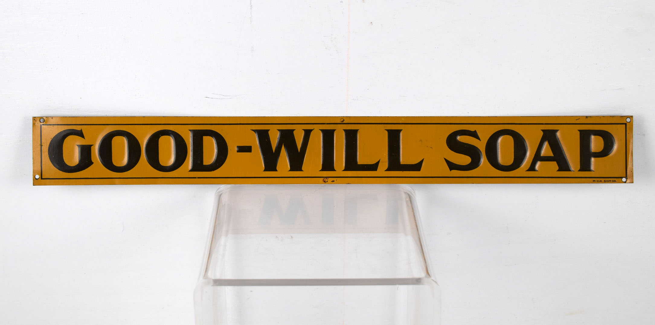 Great for your guest bathroom or laundry room, this “Good-Will Soap” embossed tin tacker sign measures twenty inches long by two and a half inches tall. The letters are embossed, and it is marked “M-C-A Sign Co.” in the lower right corner. Some minor chipping can be seen on the outer edges, with a few marks on the finish. It shines nicely. 19901-QPP