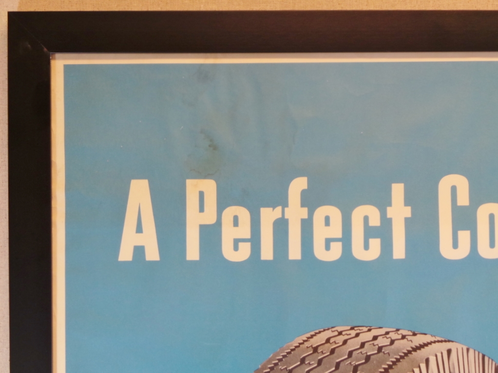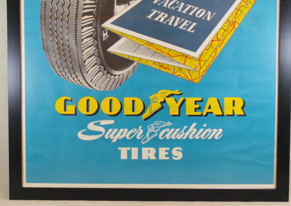 Like many companies, Goodyear tires produced based upon seasons and used them in a variety of different ways. This paper poster features a red convertible driving over a map with “Vacation Travel” on it. Of course many people use the summer to travel, so this was more than likely the summertime poster used from May to August. Under the iconic Goodyear logo, “Super Cushion Tires” is being advertised. If you head out on vacation, you want the smoothest ride available, and you definitely want to get your vehicle checked out before your trip! This paper sign has been framed to protect it and so you can display it with pride in your collection. With the way this poster looks, it may even be allowed in the house! This is an oversized shippable item. Please contact us for shipping quote. 18334-QTP