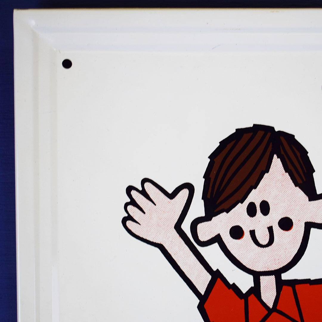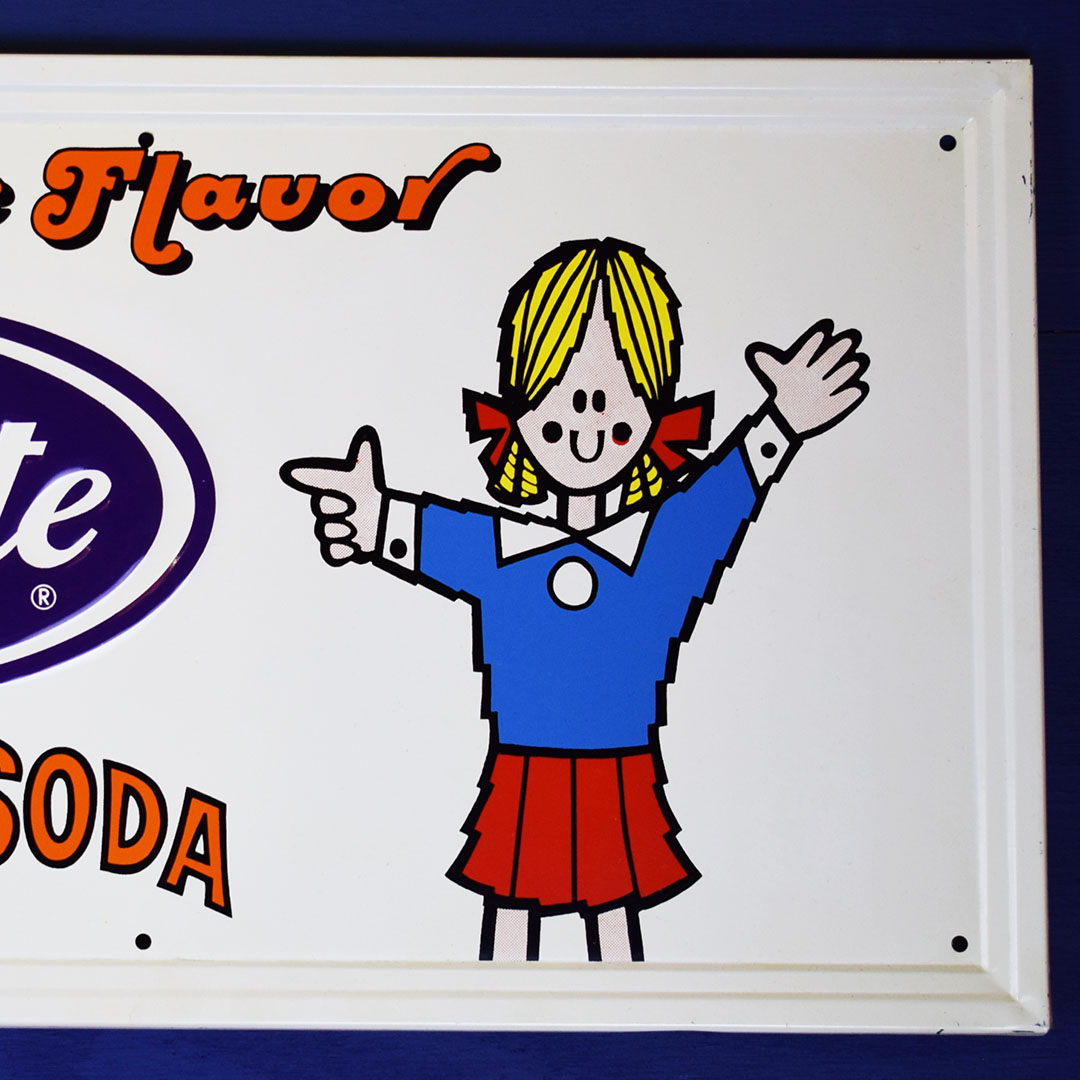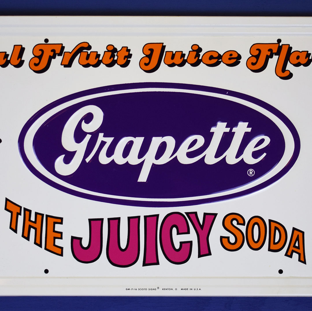 This tin sign is a beautiful piece of soda memorabilia. It is in impeccable condition and ready for your collection! It features a boy on one side of the iconic Grapette logo and a girl on the other, happy as all children should be. The outer edge is self-framed, and the Grapette logo is embossed. The sharp colors stand beautifully on the white background, with an excellent gloss throughout. This sign dates from the 1960s and is in new old stock condition, with minor wear on the outer edges. Along the lower edge, this sign is marked “GM-71-16 Scioto Signs Kenton, O. Made In U.S.A.” It measures 11.5 inches tall by 30.75 inches wide. 21162-TWT