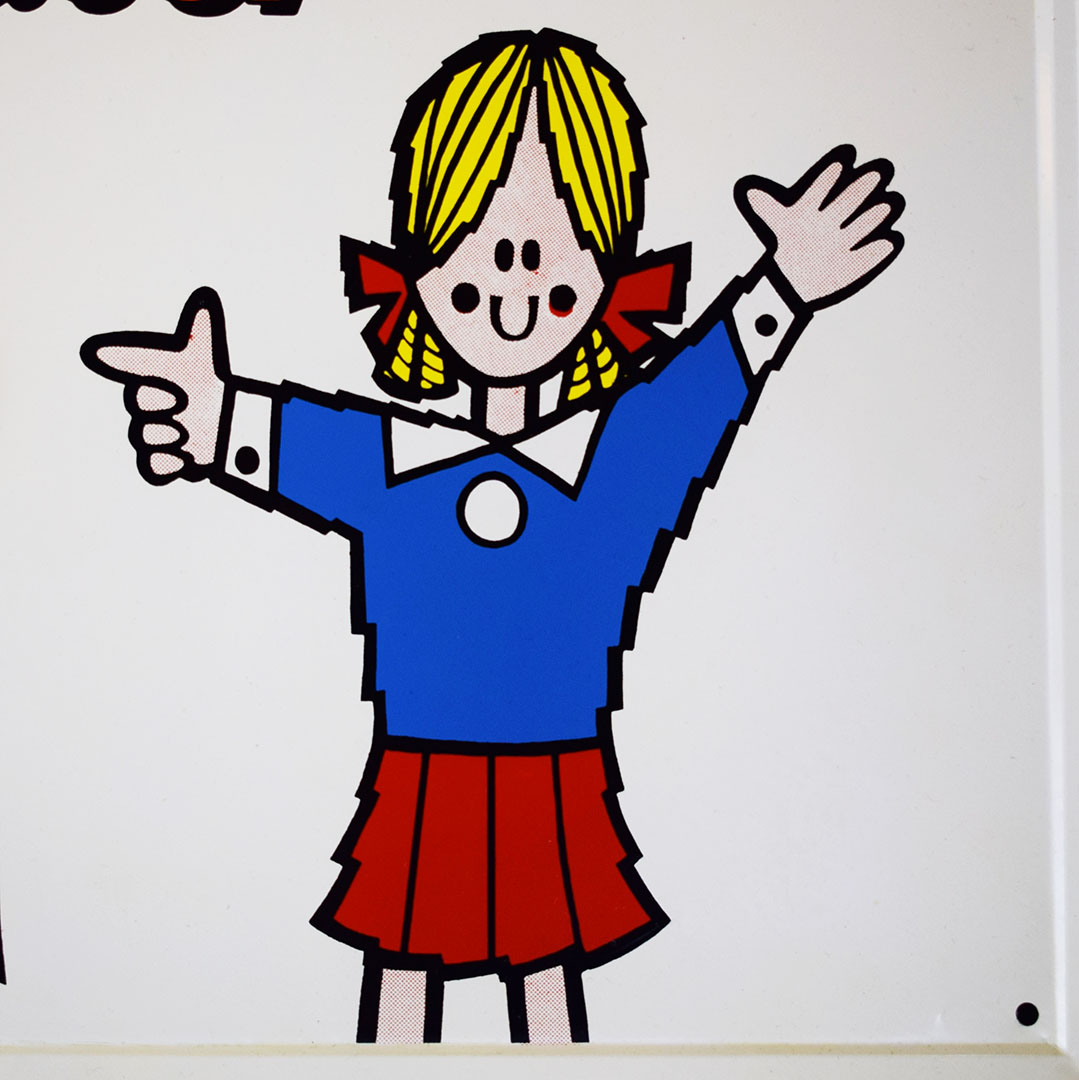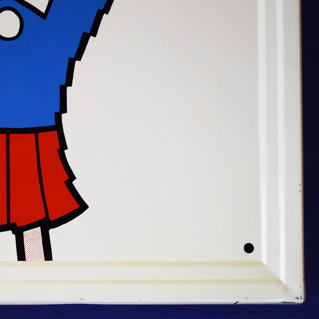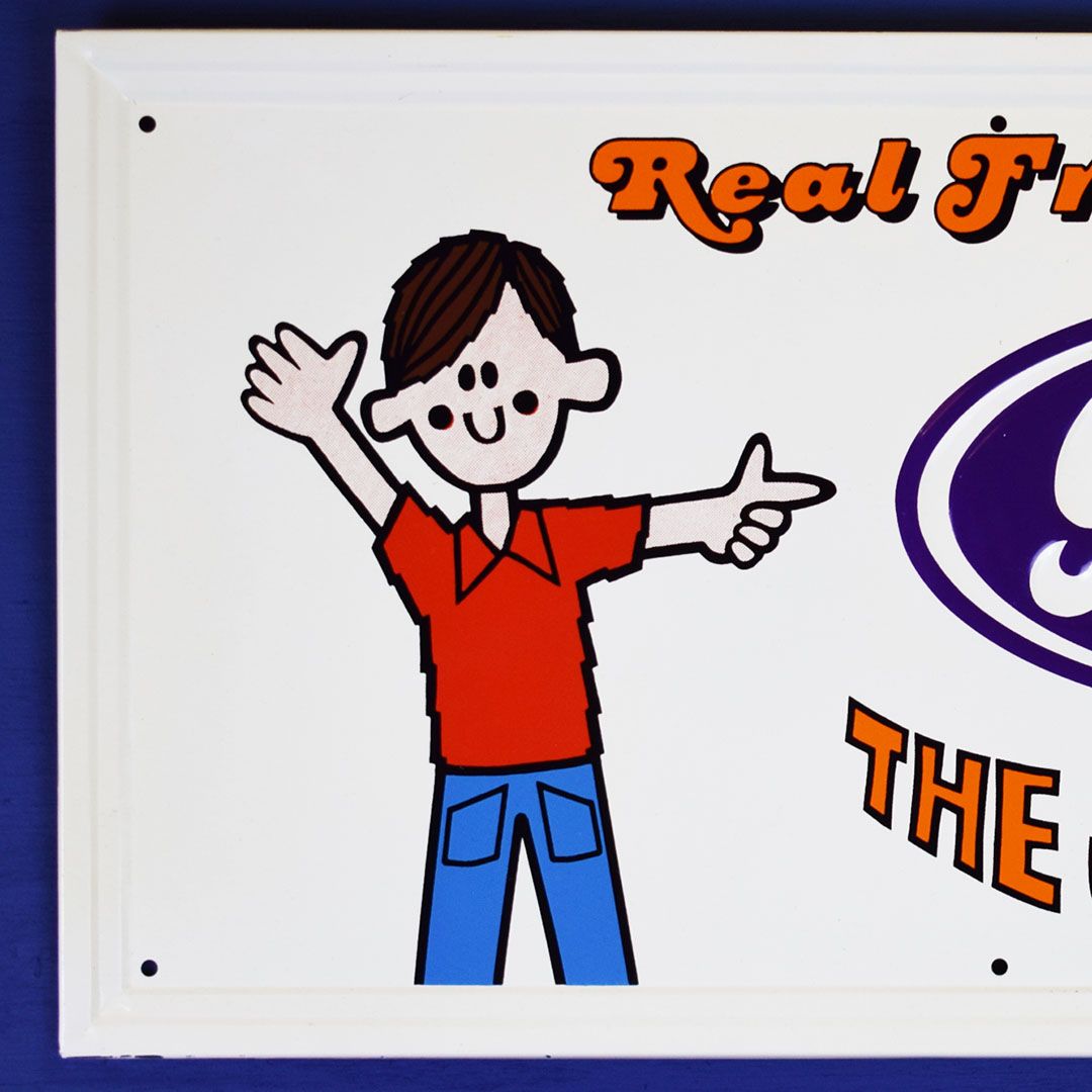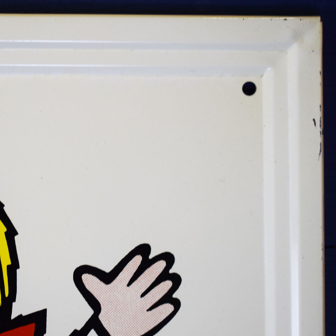 This tin sign is a beautiful piece of soda memorabilia. It is in impeccable condition and ready for your collection! It features a boy on one side of the iconic Grapette logo and a girl on the other, happy as all children should be. The outer edge is self-framed, and the Grapette logo is embossed. The sharp colors stand beautifully on the white background, with an excellent gloss throughout. This sign dates from the 1960s and is in new old stock condition, with minor wear on the outer edges. Along the lower edge, this sign is marked “GM-71-16 Scioto Signs Kenton, O. Made In U.S.A.” It measures 11.5 inches tall by 30.75 inches wide. 21162-TWT
