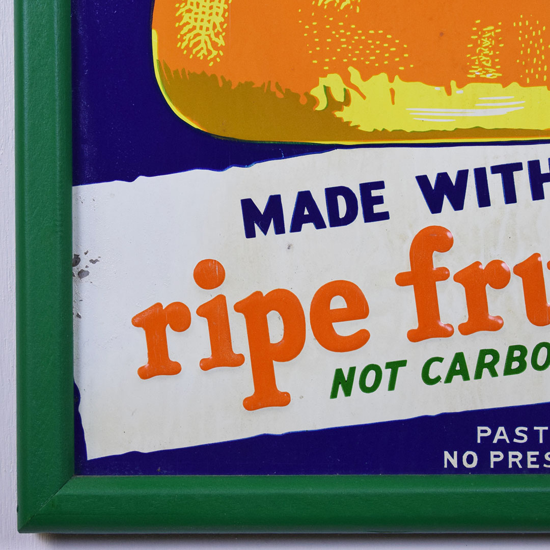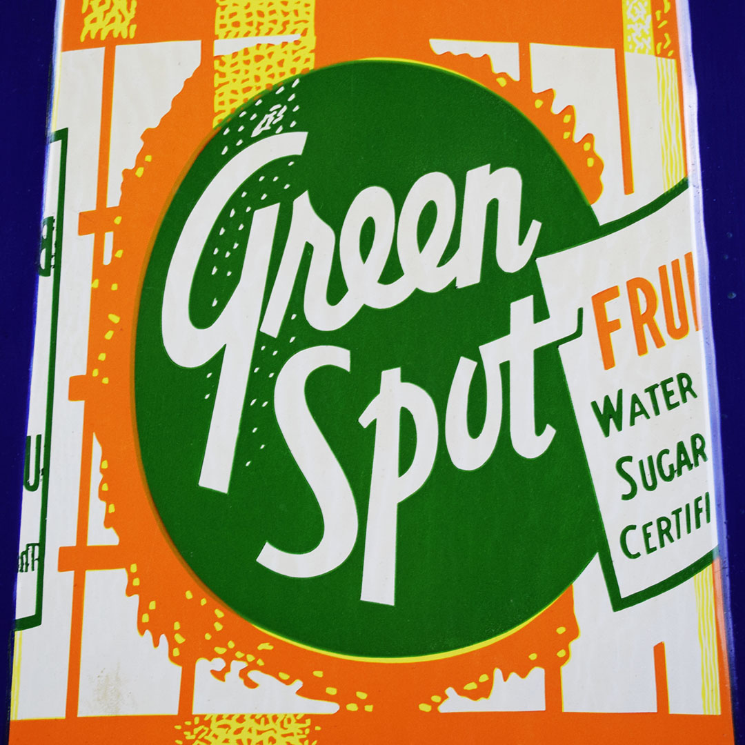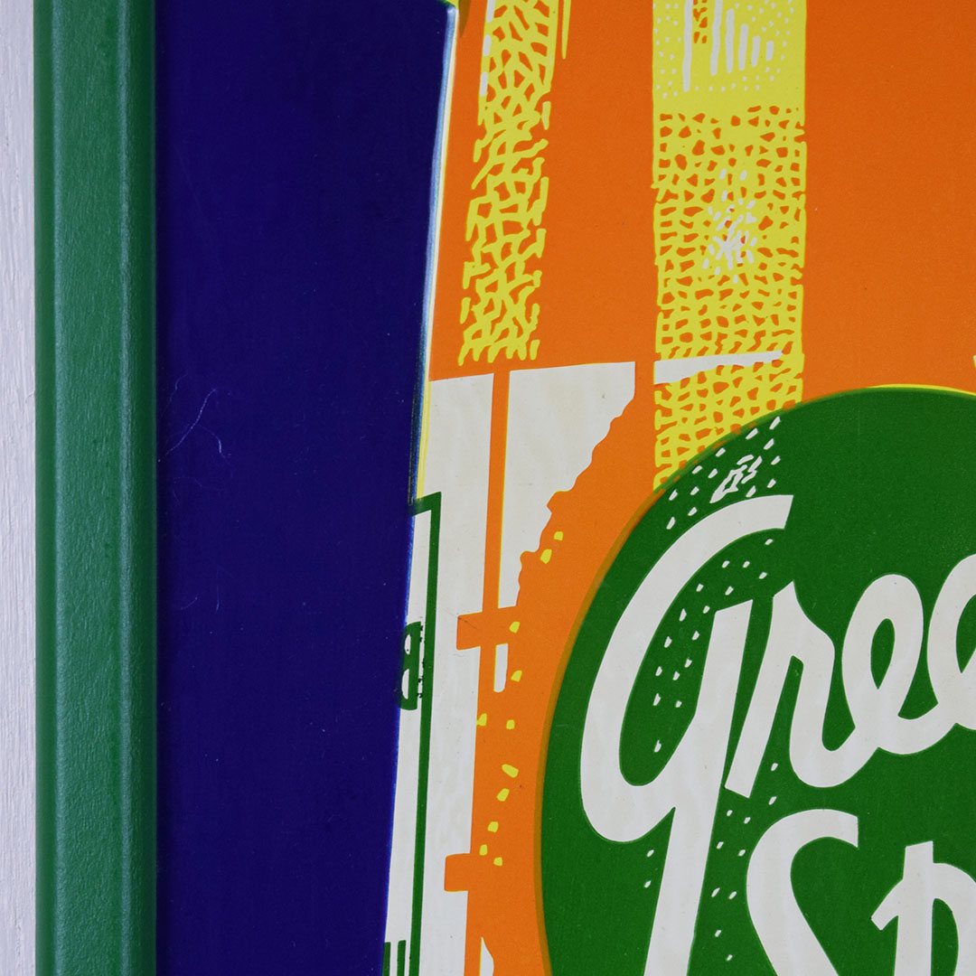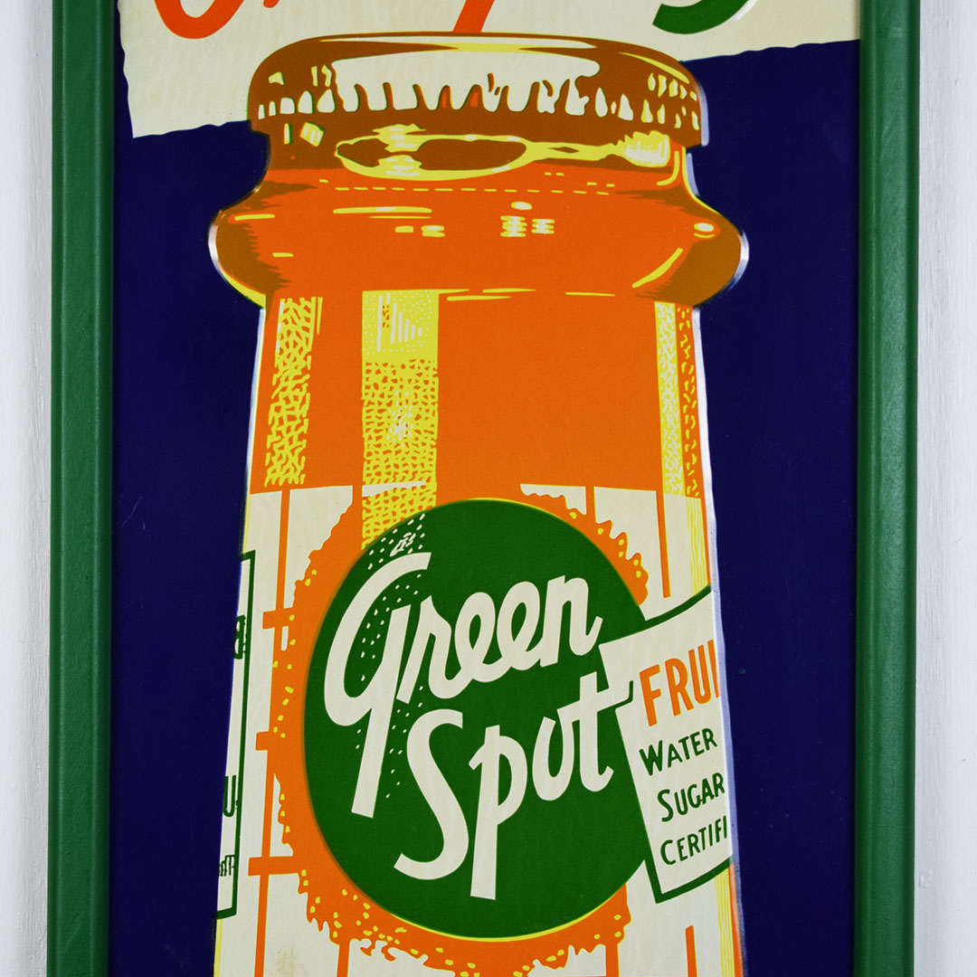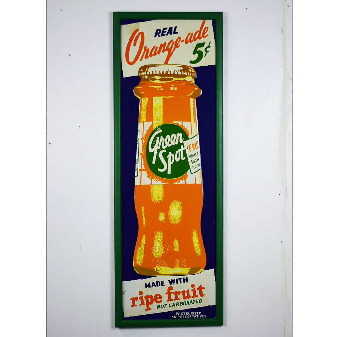 Seldom seen, this beautiful Orange-ade Green Spot vertical tin sign features a full-length bottle of orange soda with the Green Spot label in the center. The metal sign features an embossed bottle and embossed letters on the top and bottom. This 1930s sign has very sharp colors, and a green wooden frame was added. Some paint loss is evident in the upper left corner, with a few chips in the lower left corner. The gloss is sharp on this rare sign, which will look fabulous in your collection. With the added frame, it measures 36.75 inches tall by 12.75 inches wide. 21124-ITP