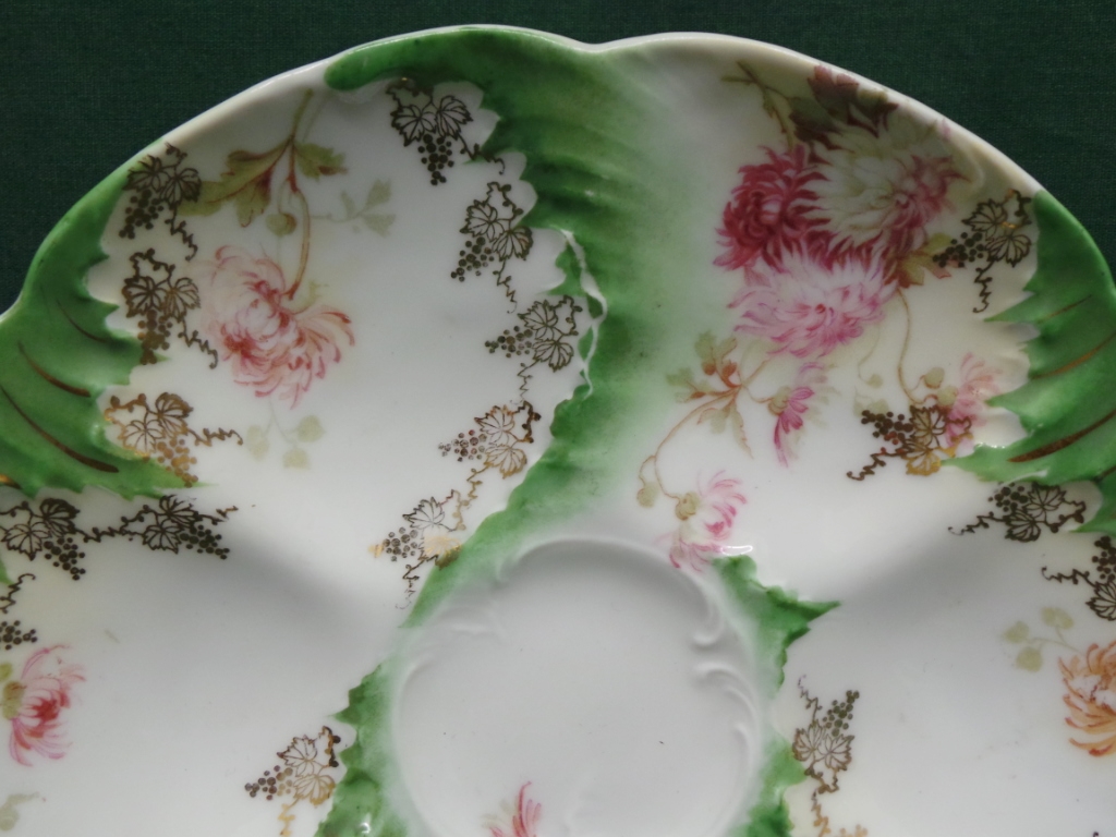 Decorated in a chrysanthemum flower and gold grape vine transfer pattern with airbrushed green highlights, this 6 well oyster plate dates from the late 19th or early 20th century. The back carries the “Weimar” shield logo with “Germany” inscribed below it. The plate measures 8 1/4 inches in diameter and is in near mint condition. 1085-71QPP