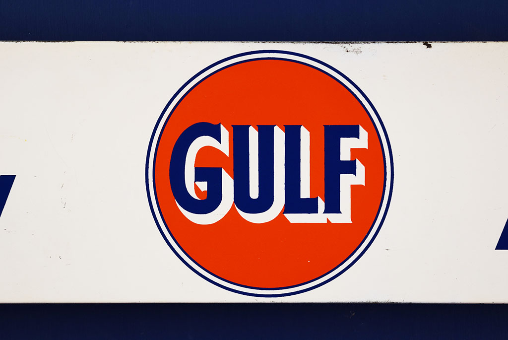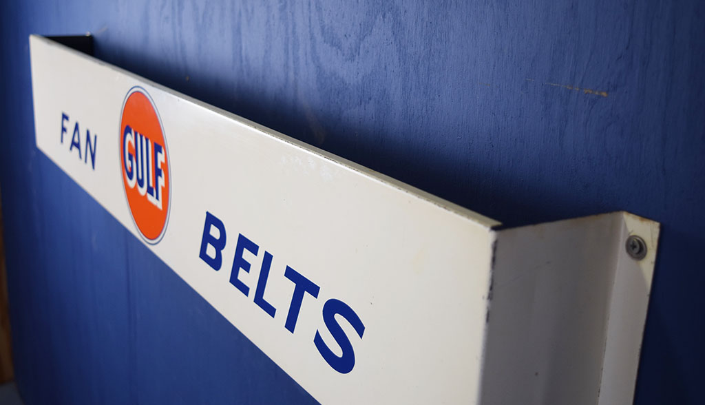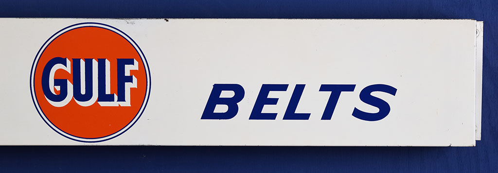 Designed to hang in a Gulf service station, this beautiful example is ready to display in your Gulf collection! It features a large Gulf disc graphic in the middle, with “Fan” and “Belts” on each side. The colors are sharp on this tin sign which measures forty-four inches long, seven inches tall, and four inches deep. The original hooks are included for your display. Some light chipping can be seen along the top edge, with some paint loss, plus some light marks on the bottom lip. The gloss looks great on this piece, as it appears it was used very little, if any at all over the years. It is complete with the original grommets on each end to hang with ease. 20501-WQP