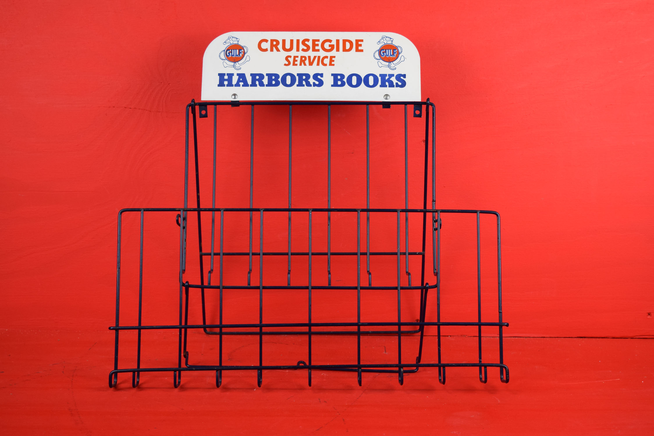 Much like road maps that were produced before GPS, boaters and marine travelers needed to know which ports were where along the east and west coast. This metal rack is super clean with just some minor chips on the racking itself. Up top, the metal sign is beautiful and has the Gulf Marine logo with “Cruisegide Service Harbors Books” in the middle. A few superficial marks can be seen in the light on the metal topper. To make it stand with ease, two metal arms swing out from the back so it can be displayed on a counter with ease. If you love marine items, make sure you add this to your collection! 19504-WPP
