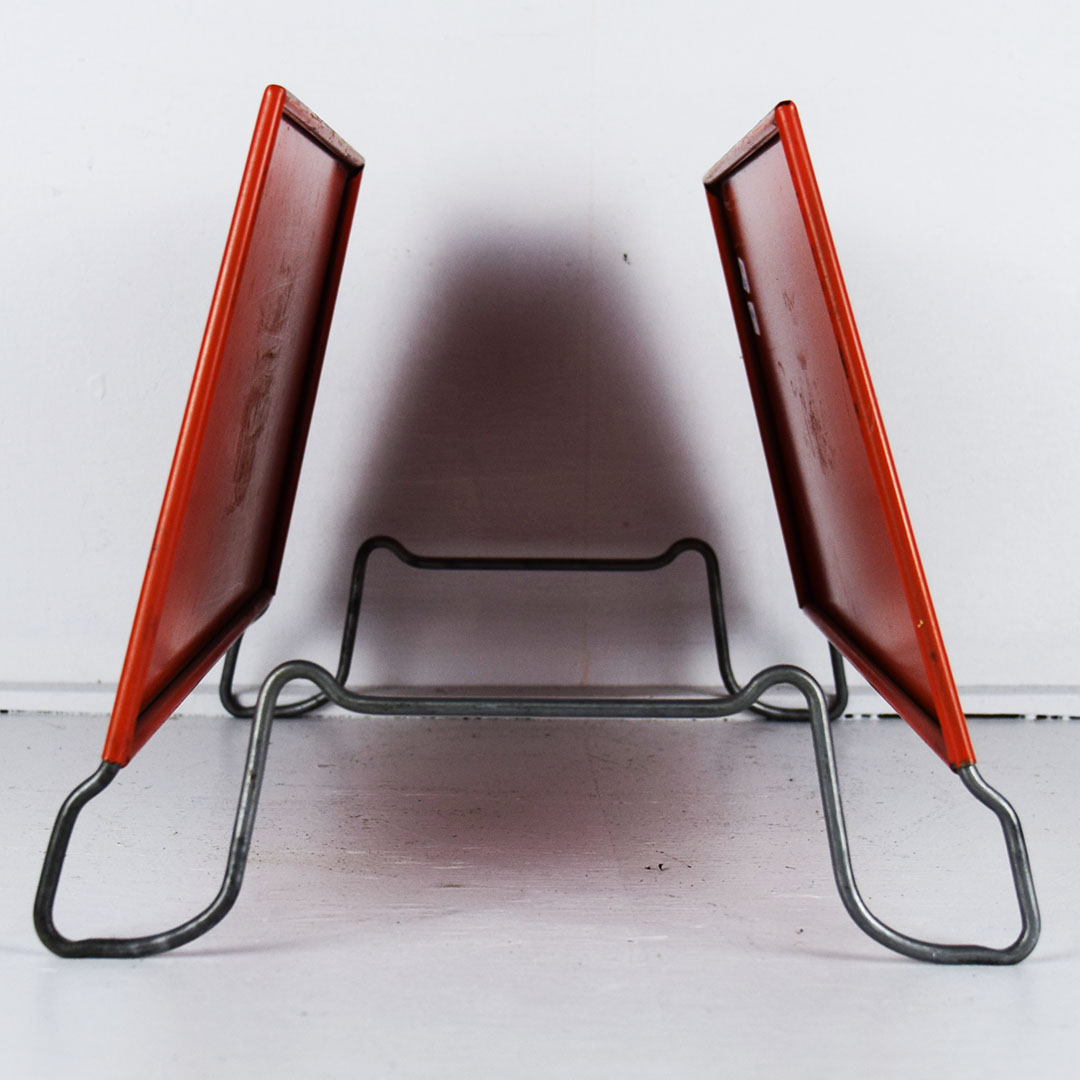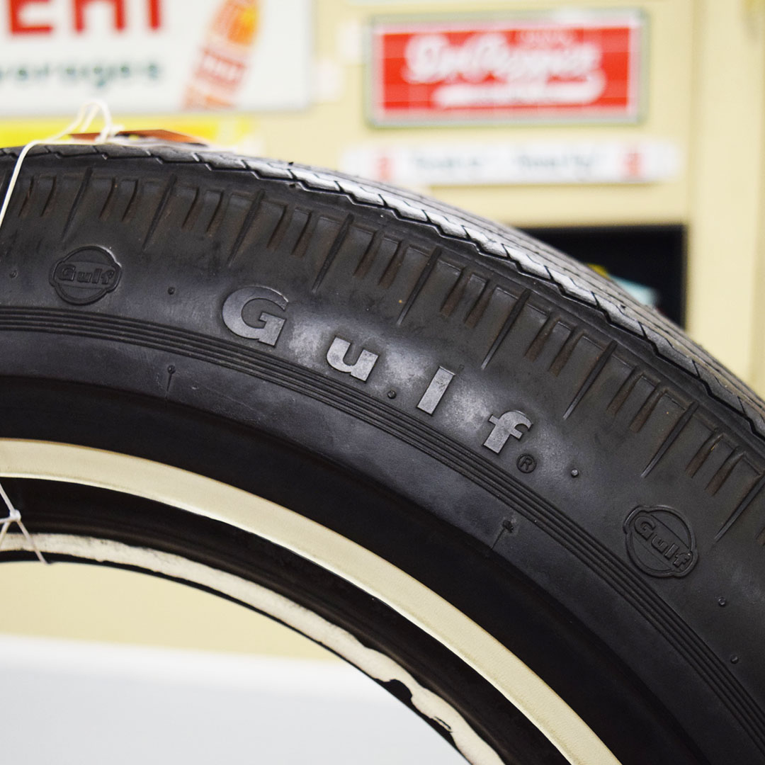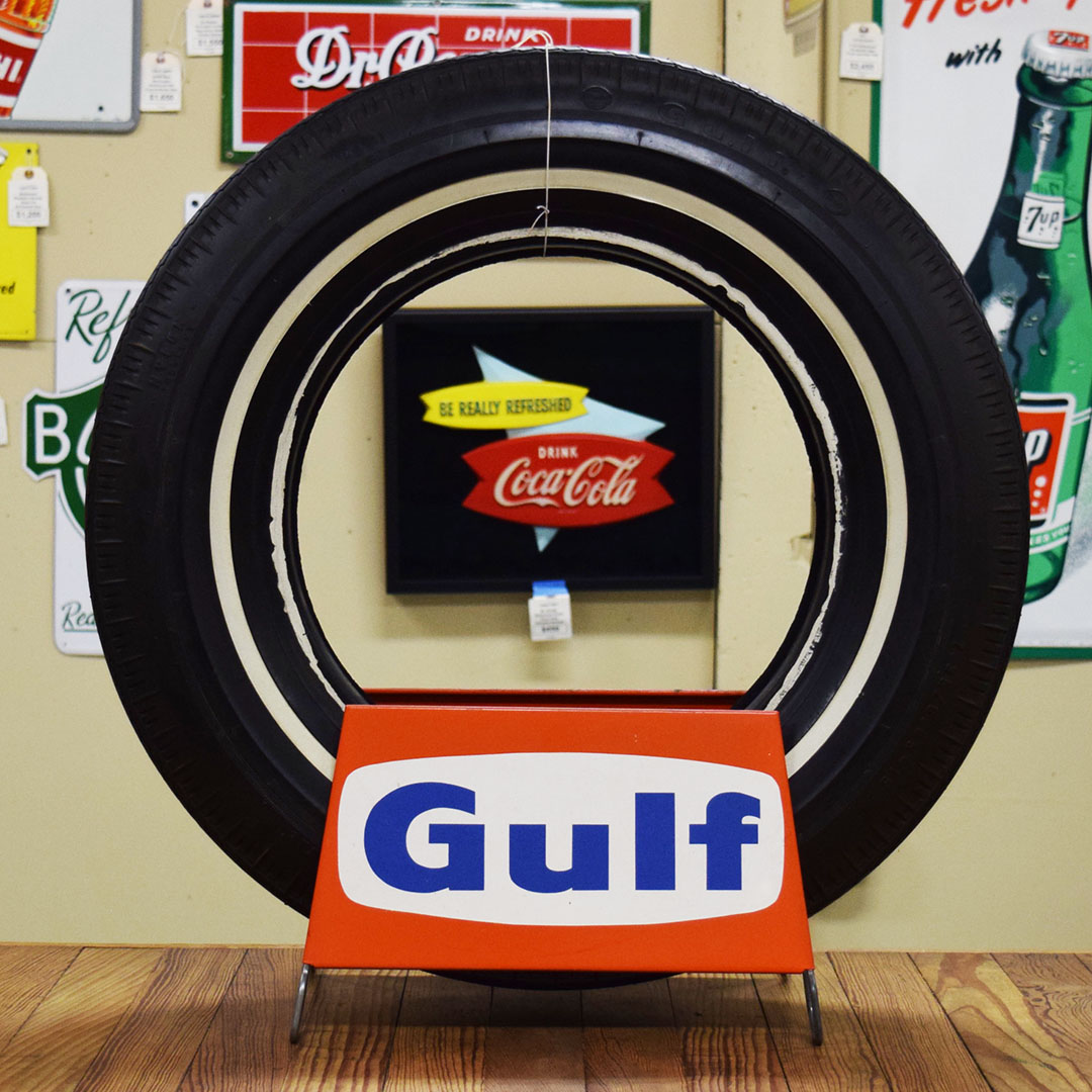 Dating from the 1960s, this Gulf tire display was right at home outside your local service station to let you know they carried Gulf Tires. The condition on this double sided metal rack is fantastic and appears to be new old stock, as the colors are sharp and the gloss is nice. Very little wear on either side, and the metal feet bracing is shiny without any corrosion. Some light wear can be seen around the outer edges, which is typical when adding and removing a tire. The original Gulf tire shows very little wear and compliments the tire rack nicely. Super piece to add to your service station display! 20661-WQP