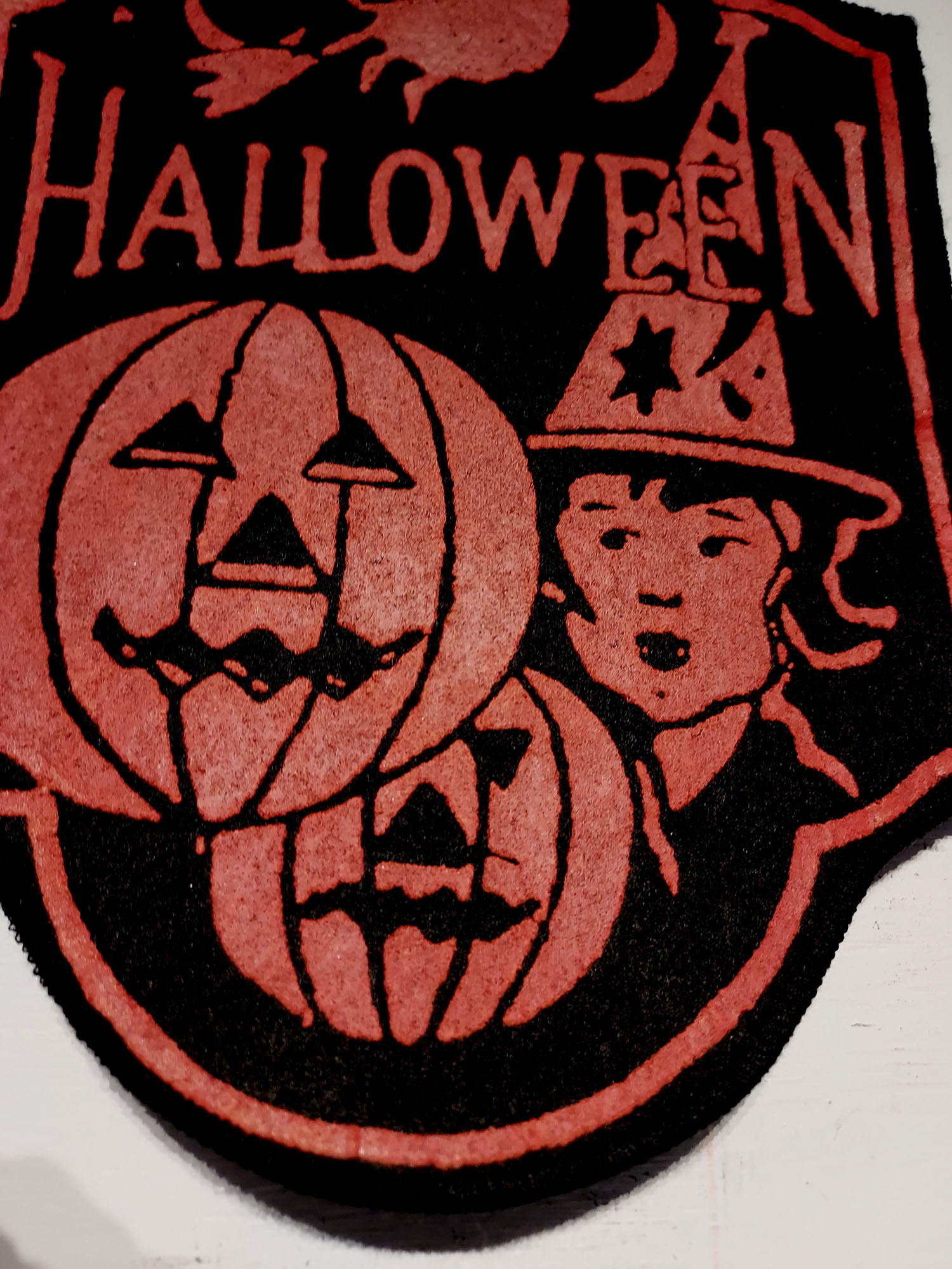 Very unusual piece with wonderful graphics of a witch on a broom. There are stars and moon around her and it has two Jack O’ Lanterns with a little girl wearing a witch hat in the middle. It has had a new piece of felt put on the back to preserve it, as well as a string put on the top to be able to hang it. 9970-OP
