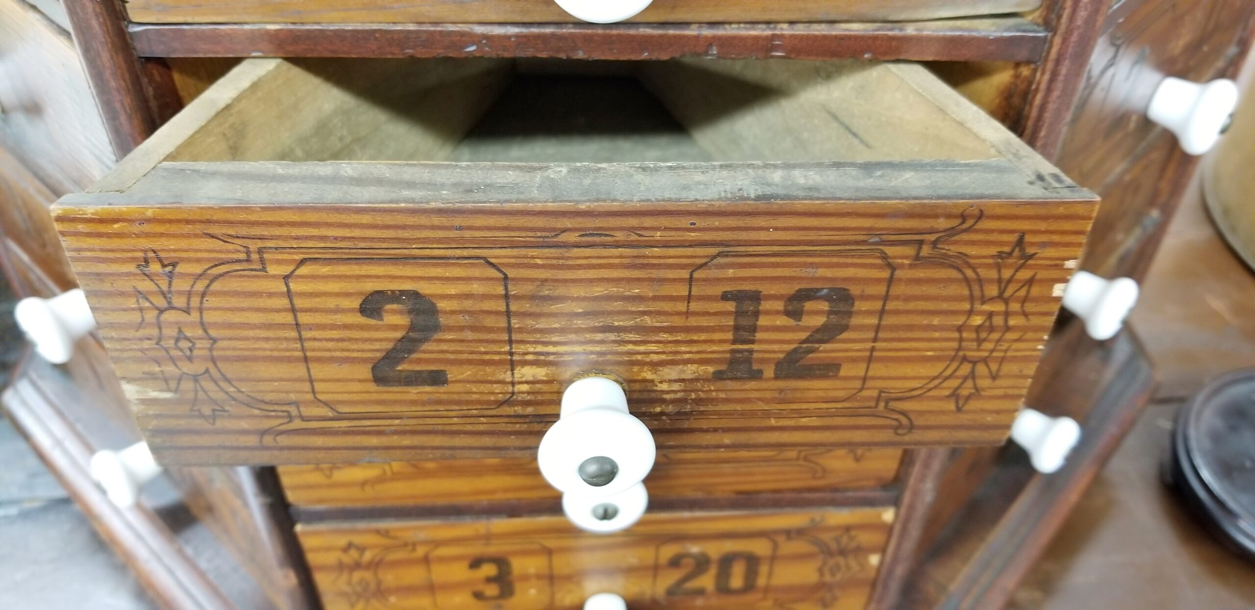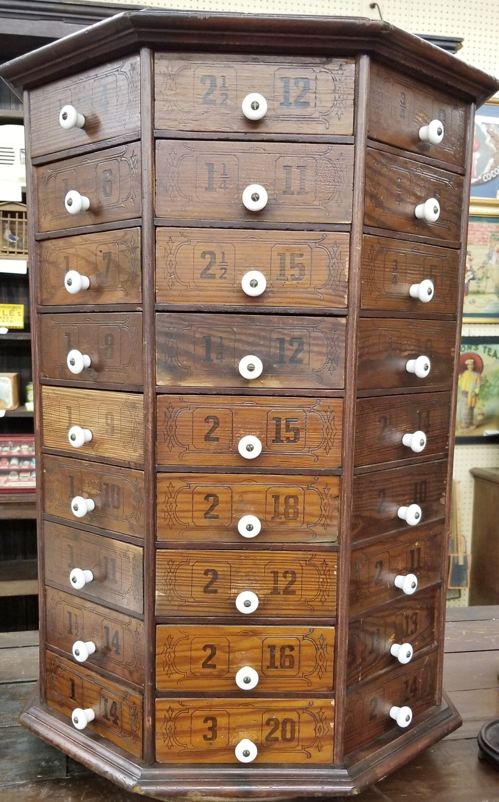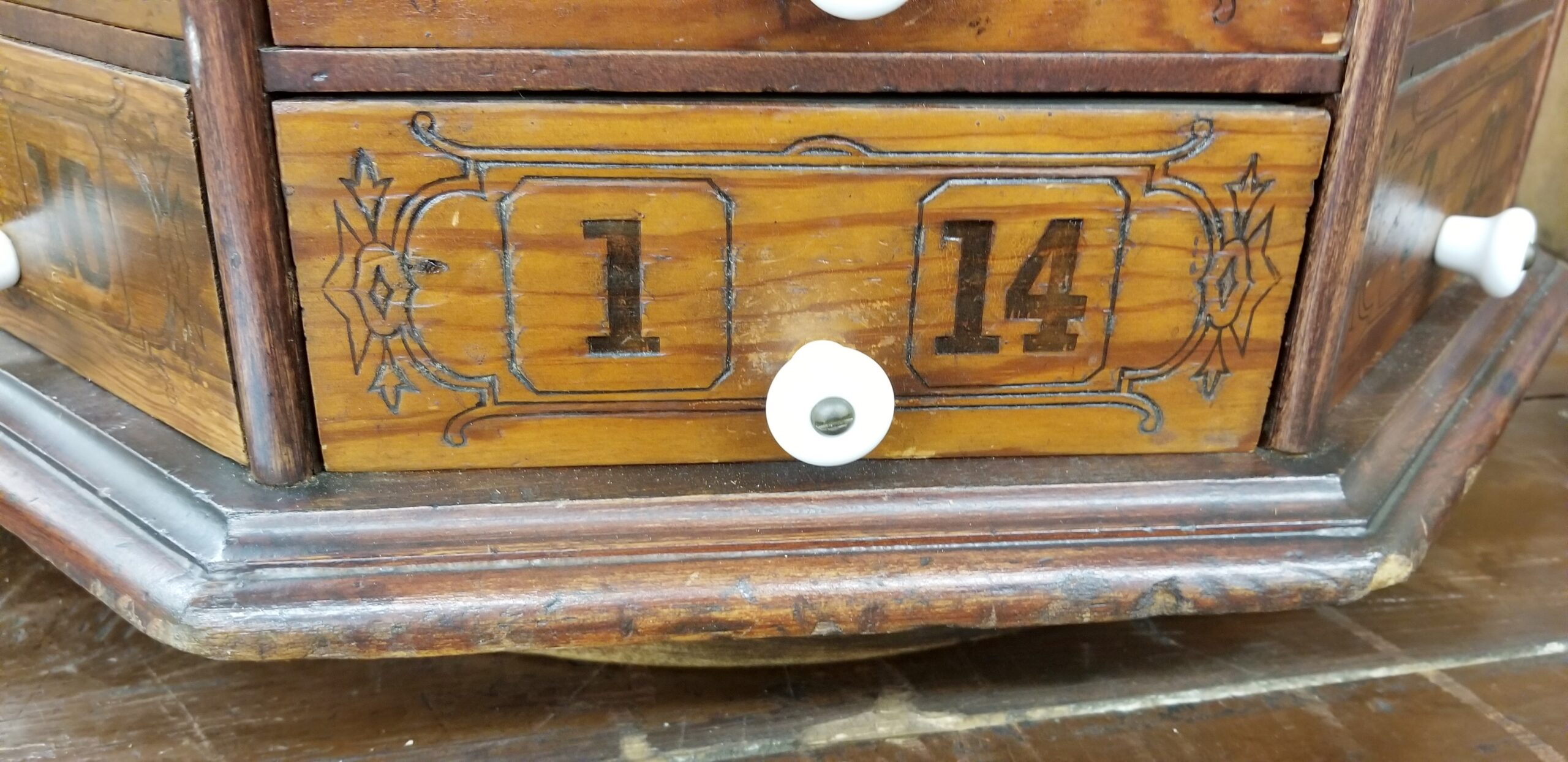 This great early octagonal hardware store bolt and screw cabinet. Extremely nice stenciling in the best condition we have seen any of these in. It has 56 drawers and was a table top model. In excellent condition with the original stenciling and original varnish. Spins nicely on base. It has a iron bar/rod through the top so best to move all at one time. This item will require a 3rd party shipper or pickup. Please contact us for more information. 18164-QWPP