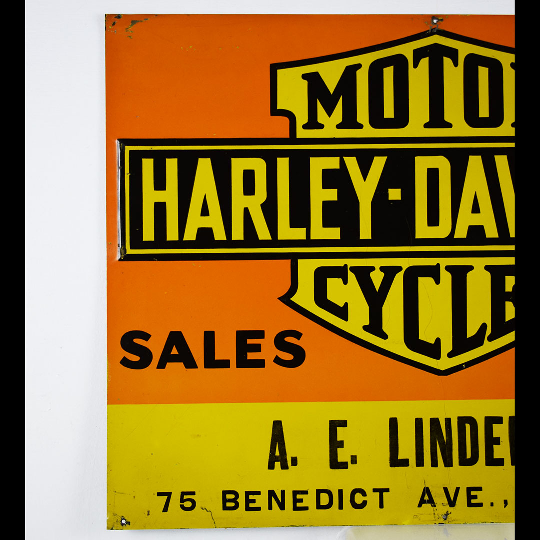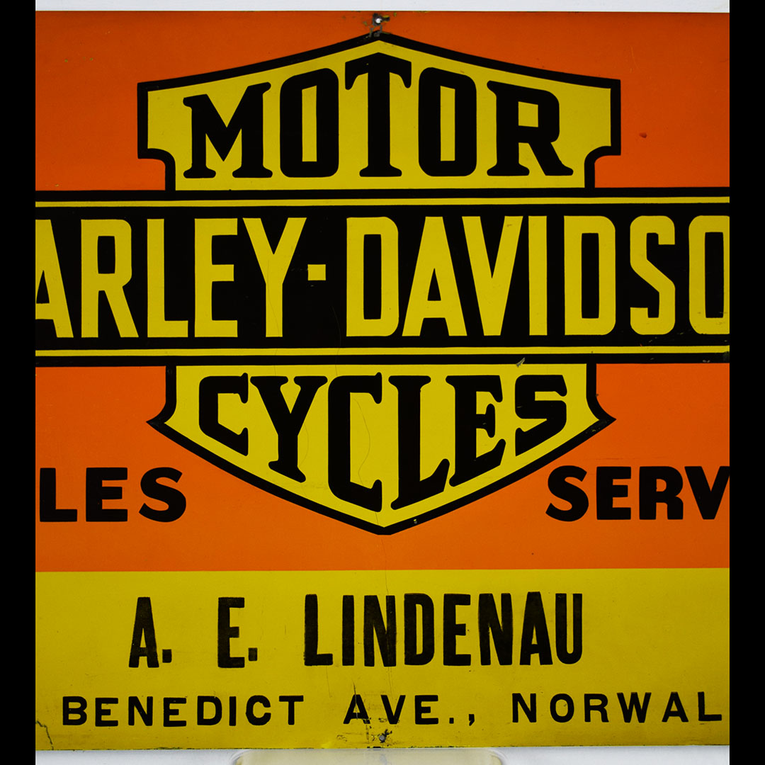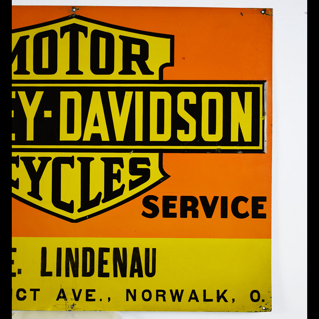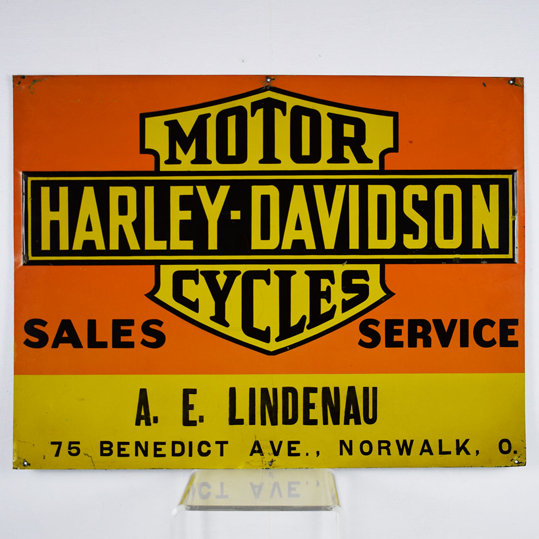 Rarely do these signs appear for sale, so don’t snooze on this beauty! This sign is an authentic Harley Davidson Motor Cycles tin tacker produced during the 1930s era. It allowed dealers to have their name and location on the privilege panel at the bottom. The Harley-Davidson shield has an outline embossing with “Sales” and “Service” below. A. E. Lindenau was the Harley dealer located in Norwalk, Ohio, to whom this sign was issued. The sign is a thin tin and is called a tin tacker sign. Since it is thin, it is very fragile and bends with ease. The outer corners have some small bends, with some slight paint loss. A few light scratches on the face are evident, with superb lithograph colors. This beauty is in fantastic condition and ready for your wall. 21122-YPPP