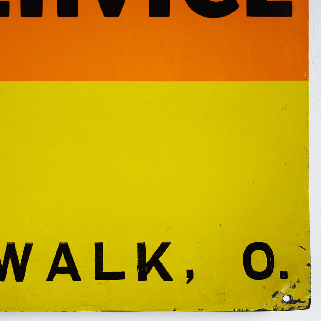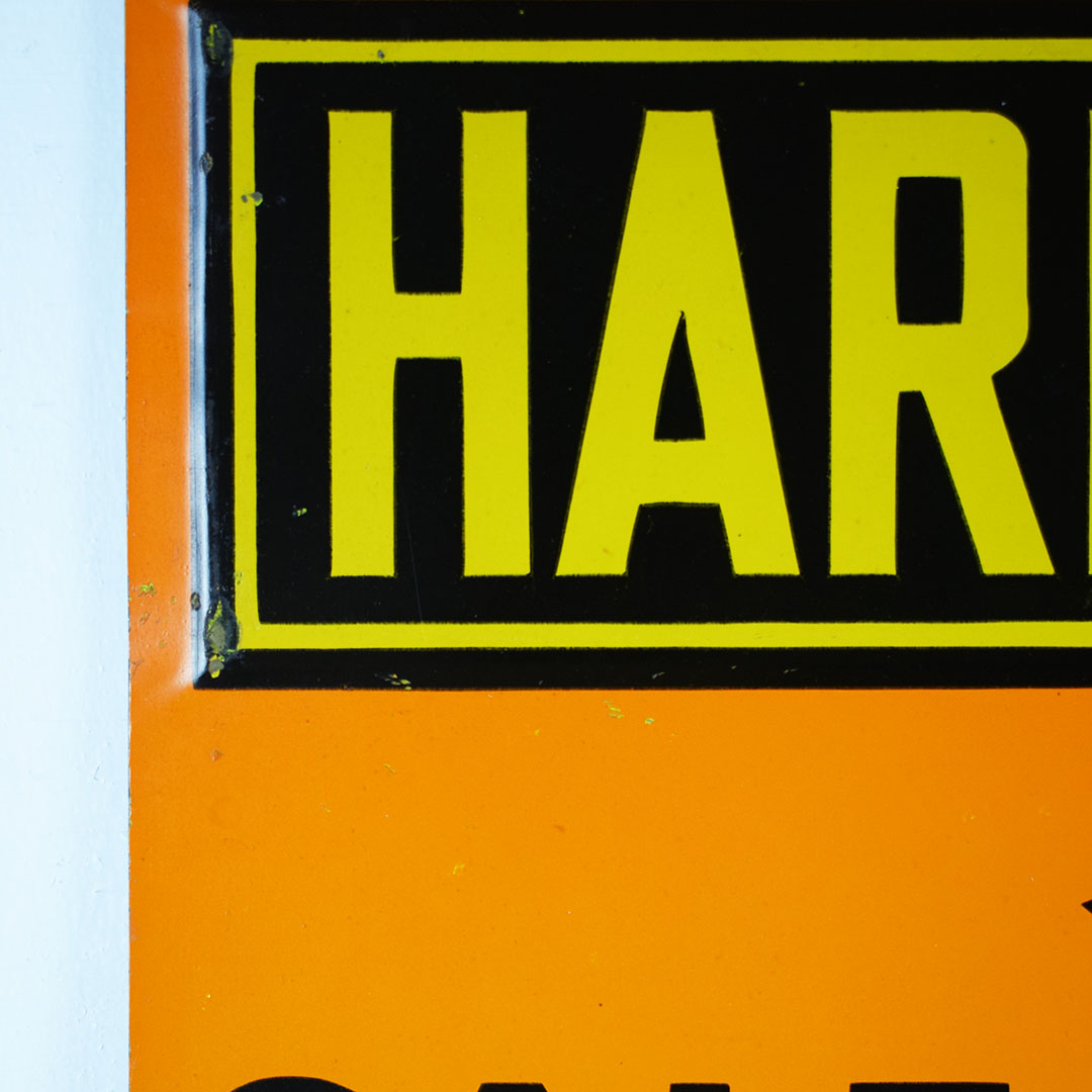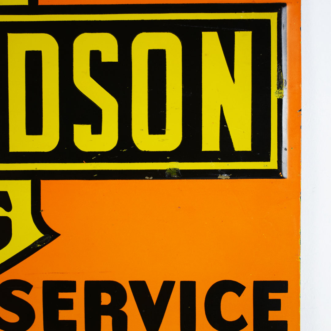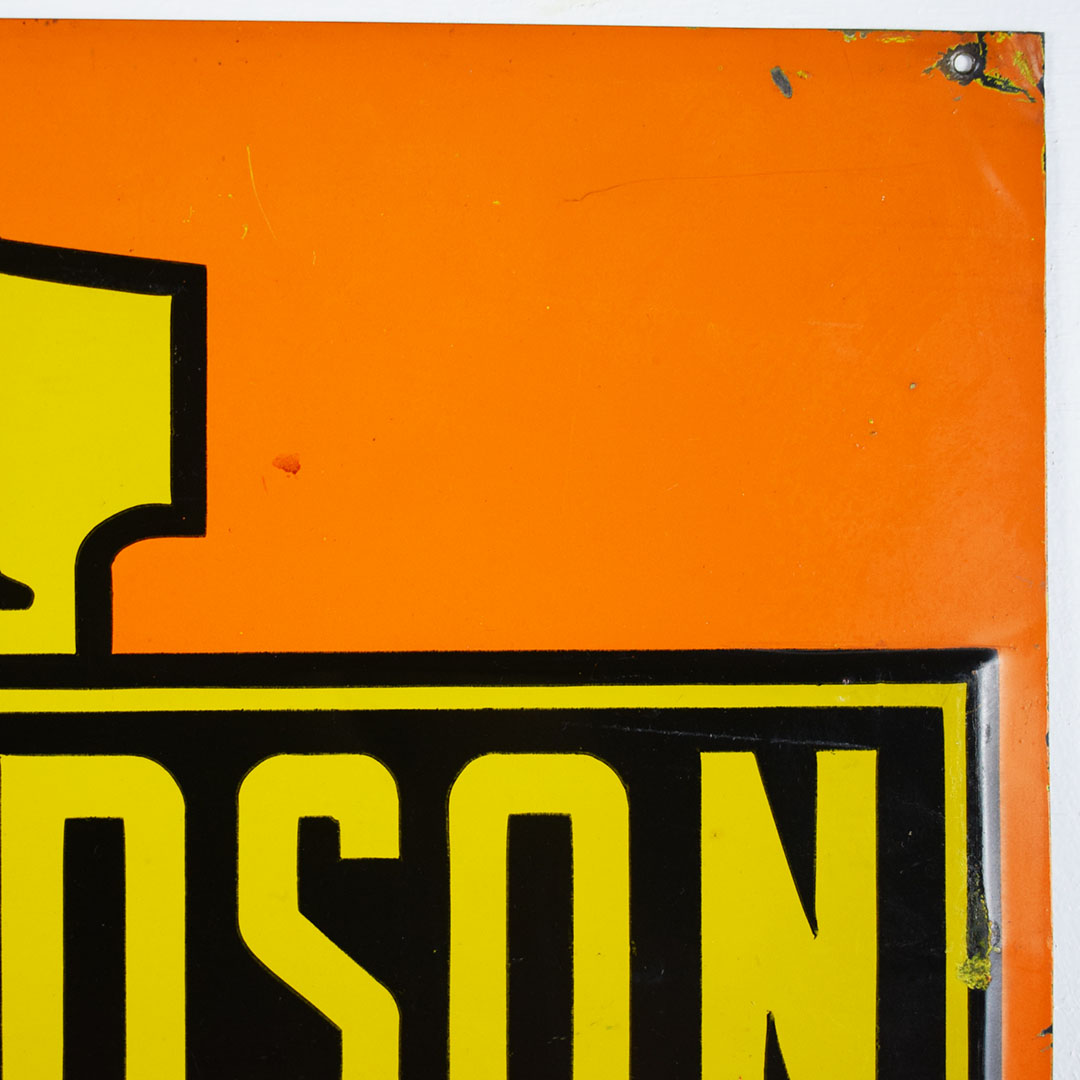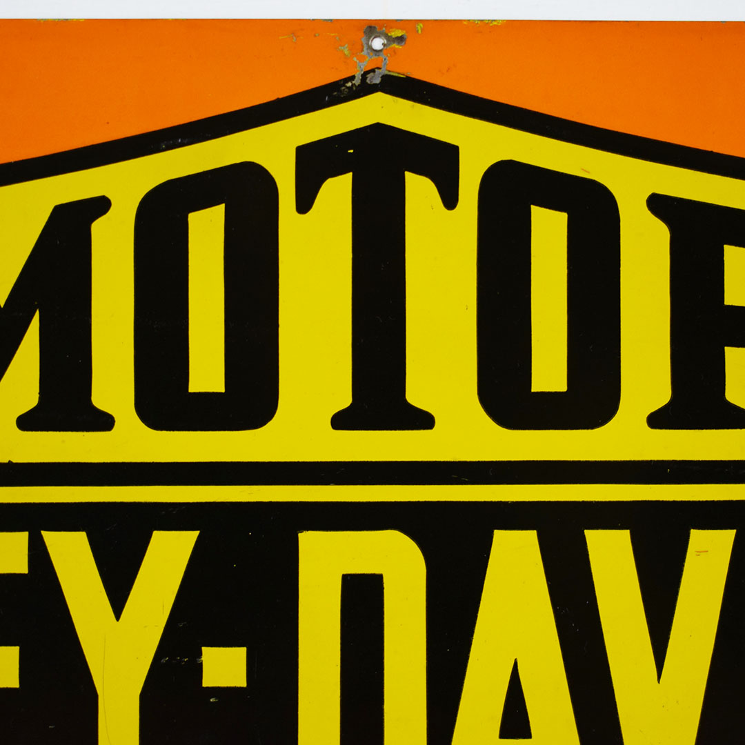 Rarely do these signs appear for sale, so don’t snooze on this beauty! This sign is an authentic Harley Davidson Motor Cycles tin tacker produced during the 1930s era. It allowed dealers to have their name and location on the privilege panel at the bottom. The Harley-Davidson shield has an outline embossing with “Sales” and “Service” below. A. E. Lindenau was the Harley dealer located in Norwalk, Ohio, to whom this sign was issued. The sign is a thin tin and is called a tin tacker sign. Since it is thin, it is very fragile and bends with ease. The outer corners have some small bends, with some slight paint loss. A few light scratches on the face are evident, with superb lithograph colors. This beauty is in fantastic condition and ready for your wall. 21122-YPPP