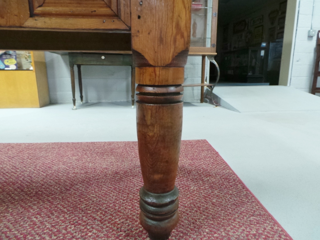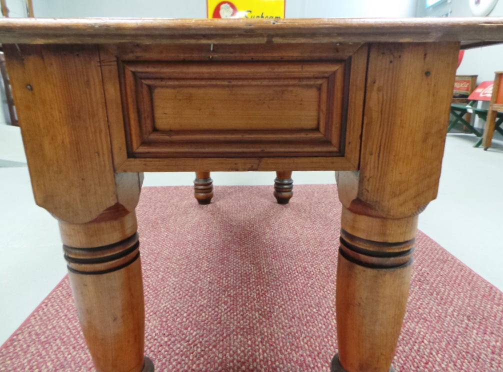 Can’t say I have ever seen such a well built heavy table. Not the kind you would use in the kitchen but the country store kind that held heavy pieces, such as a porcelain scale. This is a great example of country store history with the 4″ legs turned with graceful detail. The apron has two inset panels, one larger and one smaller. These inset panels are molding around the inside of them. Beautiful top with pine board top. All refinished and ready for your home. Measures 67″ long x 30 high x 31 wide. This item is larger than UPS will allow. Please contact us for shipping or delivery quote. 18403-QPPP