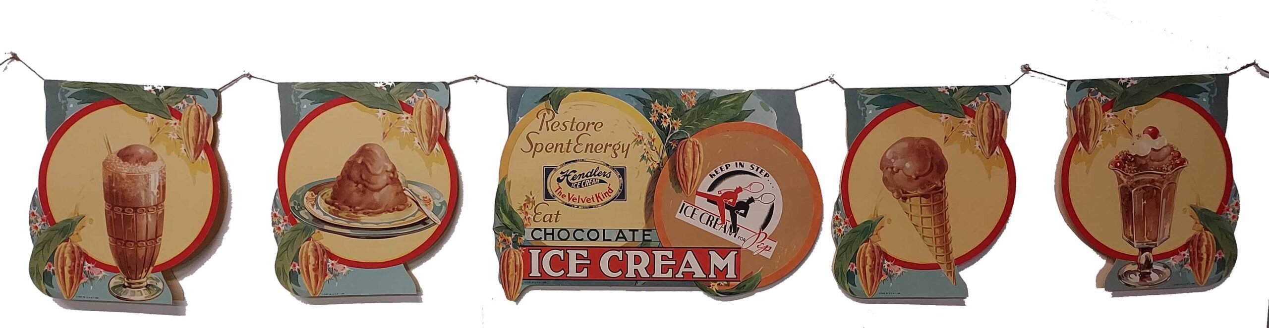 A great looking complete festoon ready to hang in your soda fountain! This nine piece lithograph paper festoon is advertising ways to enjoy Hendler’s chocolate ice cream has nine pieces total. “Restore Spent Energy” Hendler’s Ice Cream “The Velvet Kind” Eat Chocolate Ice Cream – Keep in Step…Ice Cream for Pep – are the different sayings on the pieces. Pictured is a chocolate milkshake, a dish of chocolate ice cream, a chocolate ice cream sundae, and a chocolate cone. All of those pieces are double sided to hang from a wire or string in the soda fountain. The four rectangle pieces say “Delicious Chocolate Ice Cream” with cocoa beans on them and would have been used as front window strips and back bar strips. “Litho in U.S.A. 129” is printed on each piece of this festoon. The factory envelope that the festoon arrived in is in great shape with only tape residue on the back. You can use the five hanging pieces over your soda fountain or frame them for years of enjoyment. 18215-TPP
