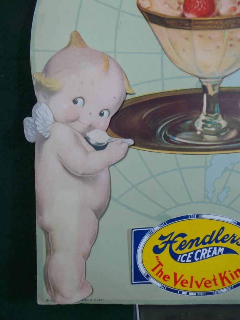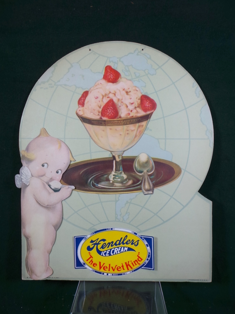 With a globe in the background and a huge dish of ice cream, I think Hendlers was trying to tell everyone their ice cream is the best in the world! This cardboard lithograph display has both an easel back for display on a soda fountain counter, and has two holes at the top so it can be attached to a wall behind the counter. The Hendlers Ice Cream logo was attached at a later date, as was the kewpie doll on the left side. The litho is in great shape with some minor wear around the outside edges. 18472-QPP