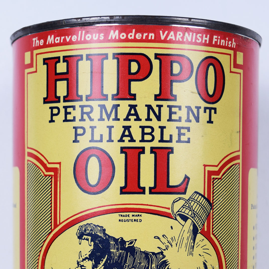 Great graphics on this quart can of Hippo Gloss Finish Oil that was used as a sealer on exterior and interior wood surfaces. The paper label features a wooden bucket of water pouring on the back of a Hippopotamus as the front graphic, with the back giving instructions for applications in both English and French. A few small marks can be seen on the paper label, with a small fold on the upper part near the lid. Still unopened, this can is full of original product, and is free of dents. Acme – De Soto Paint & Chemicals Limited produced this very nice can which will look great in your collection. 20568-QRP
