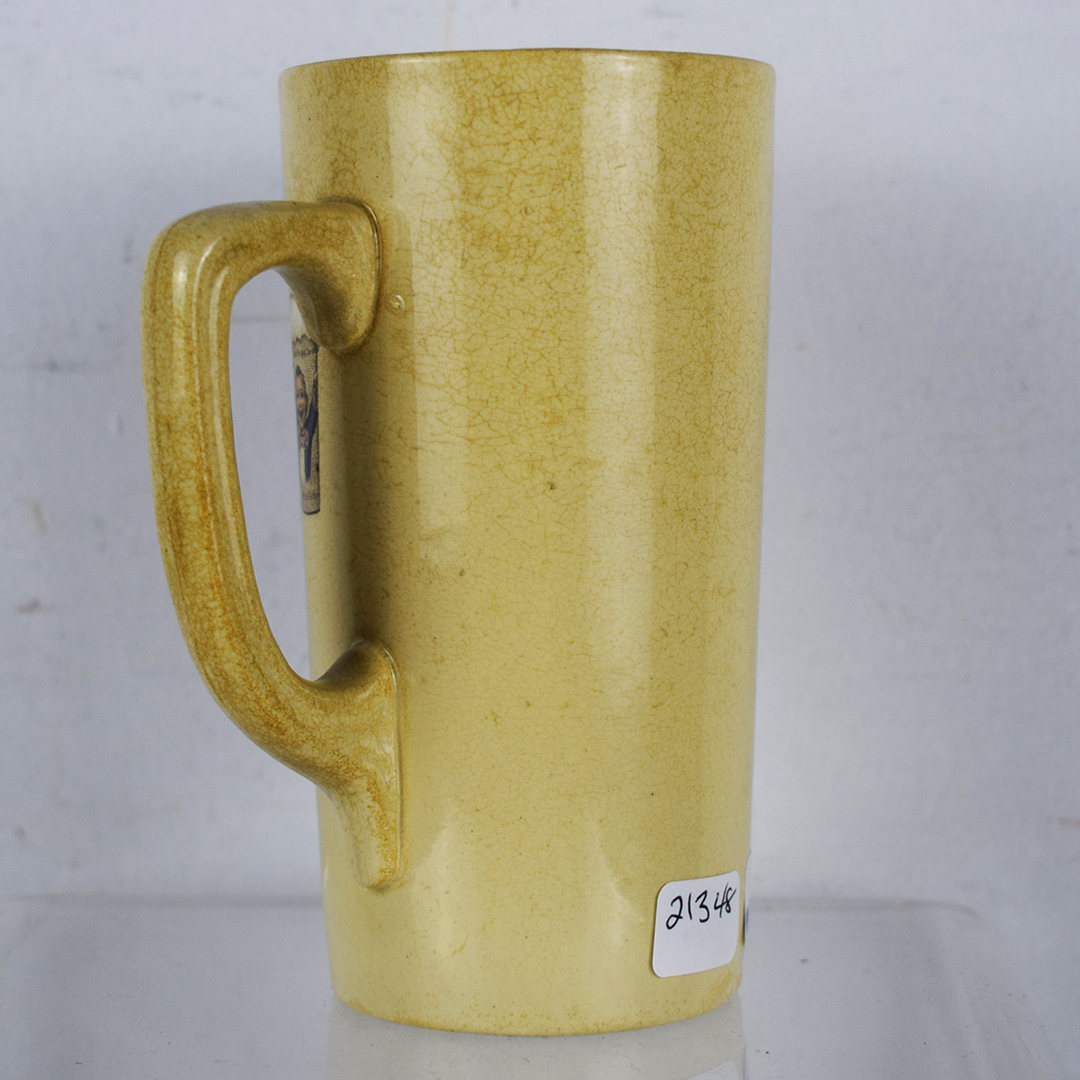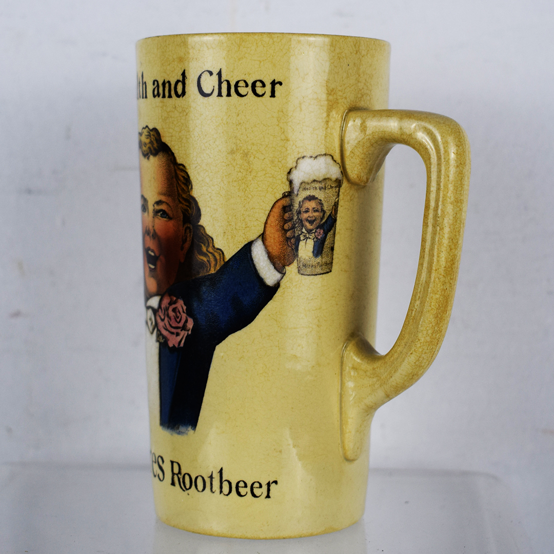 Dubbed “Ugly Kid,” Hires Root Beer used this character starting in the late 1800s. His face was on all advertising, including ceramic mugs, such as this one. It features the Hires Ugly Kid, holding a mug with his picture on it, along with the slogans “Join Health and Cheer” and “Drink Hires Rootbeer”. The ceramic mug, stamped “Villeroy & Boch” and “Made in Germany” on the base, measures 5 inches in height by 4 inches in diameter. The mug is in excellent condition, with no chips or cracks, but exhibiting typical ceramic crazing. What a neat addition to your Hires soda fountain collection. 21348-QPP
