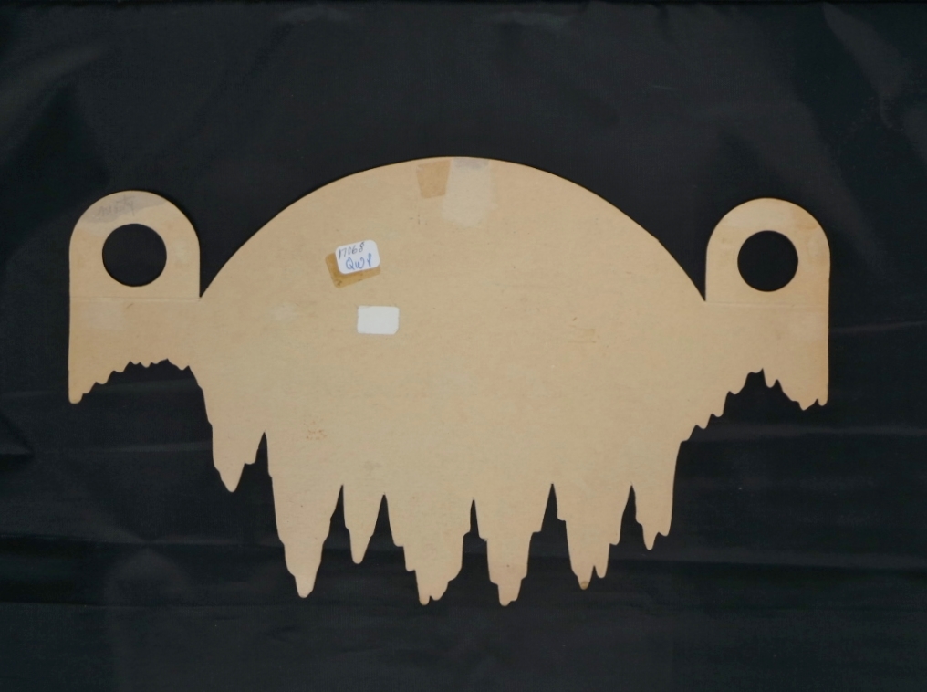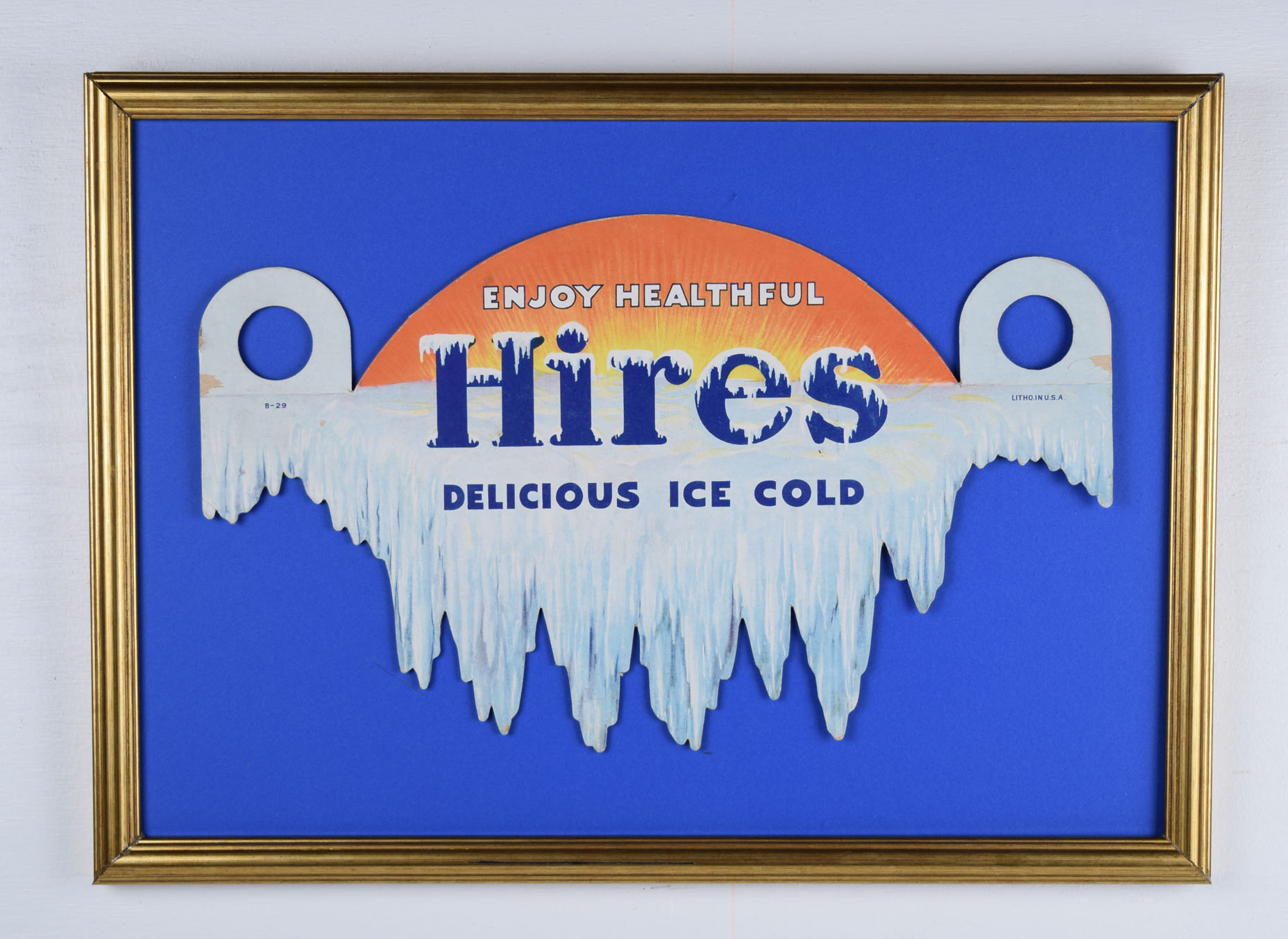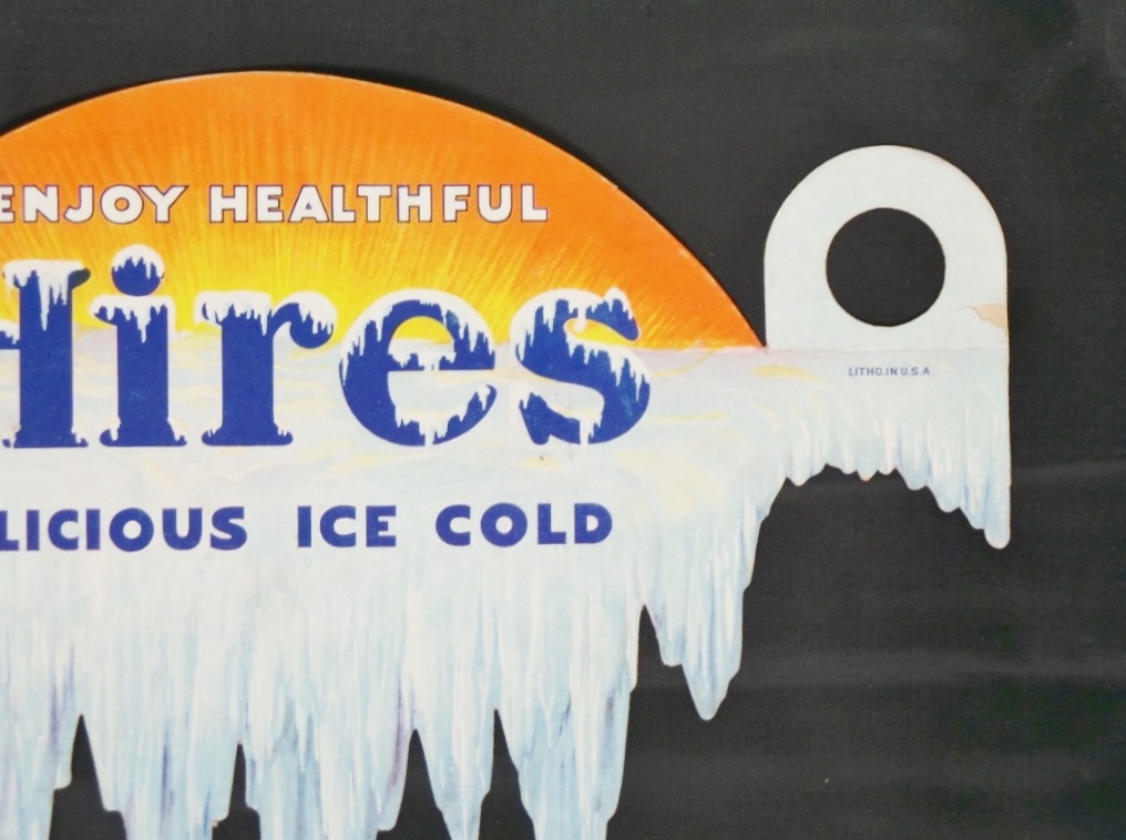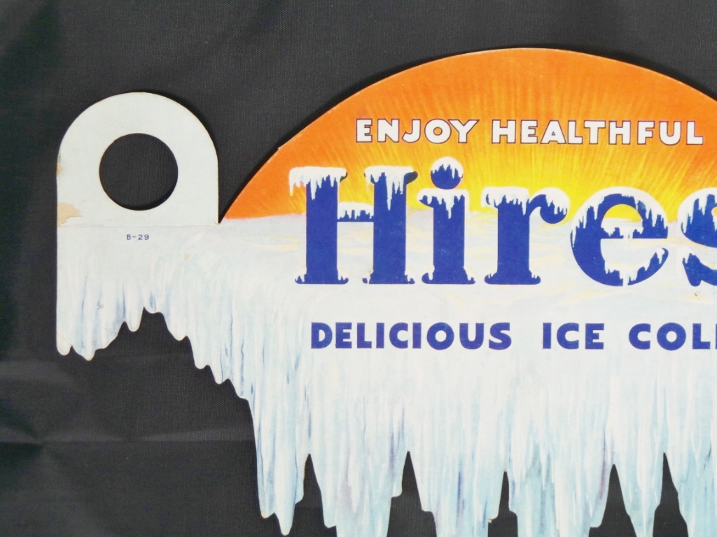 Designed to fit over 2 bottles, this rare die cut cardboard bottle topper dates from the 1920s or 1930s. Made to look like the sun rising over a frozen glacier, it is inscribed “Enjoy Healthful Hires Delicious Ice Cold.” The bottle topper measures 8 1/4 inches tall by 13 3/4 inches wide and is in excellent condition with a little wear and a couple of small creases on tips of the icicles and a small amount of surface loss on the outside edges of the bottle mounts. We have added just the right size frame to give you a easy way to display and protect it for many years. 17068-81QWP