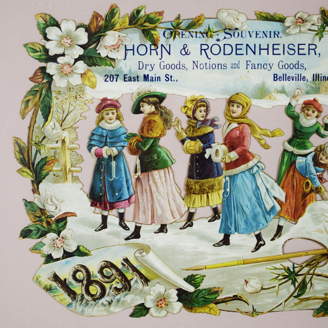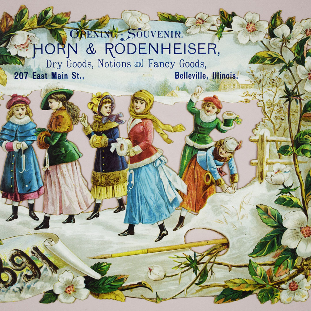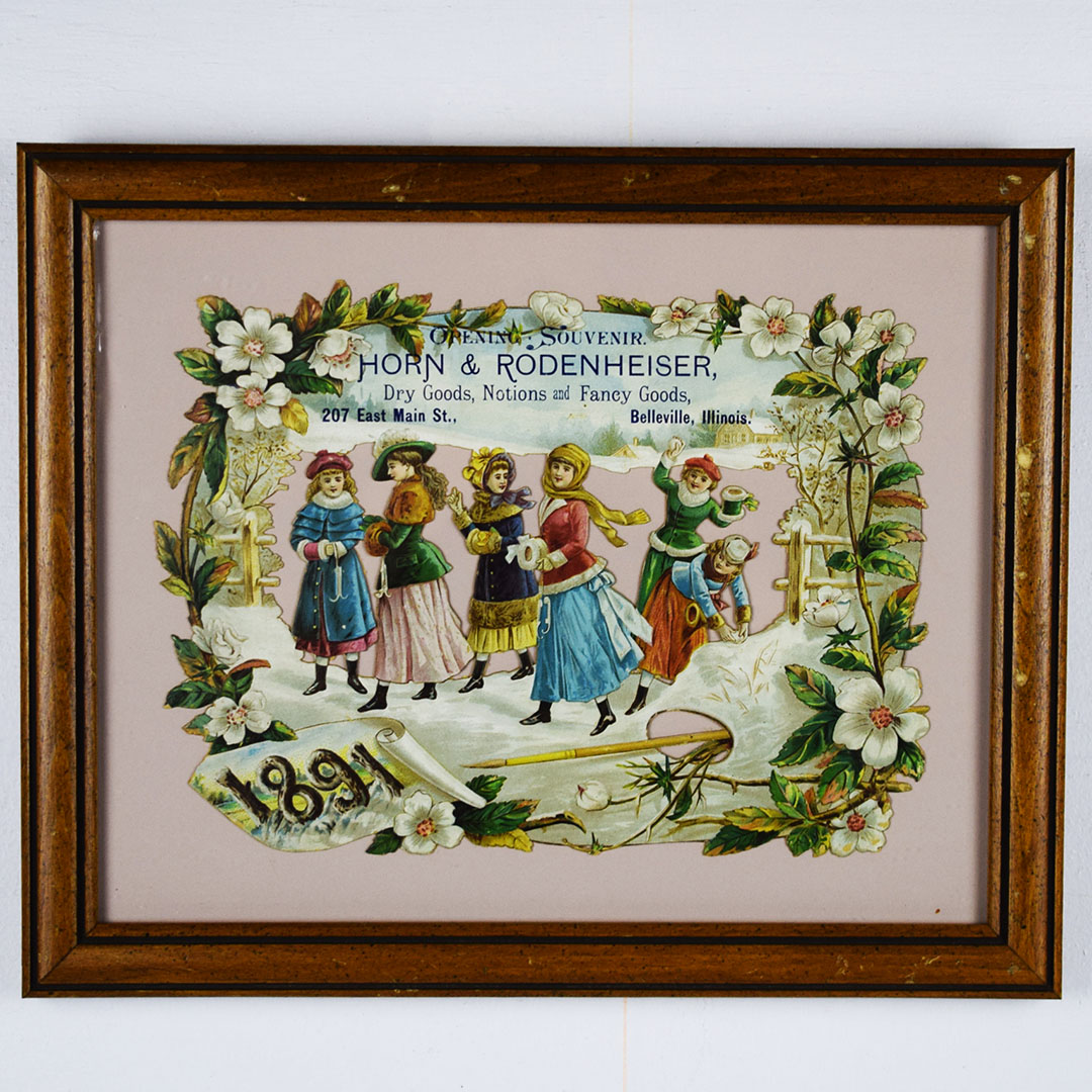 This die-cut cardboard sign, dated 1891, in the lower left corner, advertises Horn & Rodenheiser, a proprietor of Dry Goods, Notions, and Fancy Goods. It reads “Opening Souvenir” along the top edge, so this advertising was a giveaway during that time. The scene depicted shows school girls in the snow with the ones in the back starting a snowball fight. Each girl is dressed in vivid colors, making the piece appeal to your eyes. Dogwood blossoms frame the girls, with an artist paint brush below them. The cardboard piece measures 10 inches wide by 7.5 inches tall. 16982-71ETP