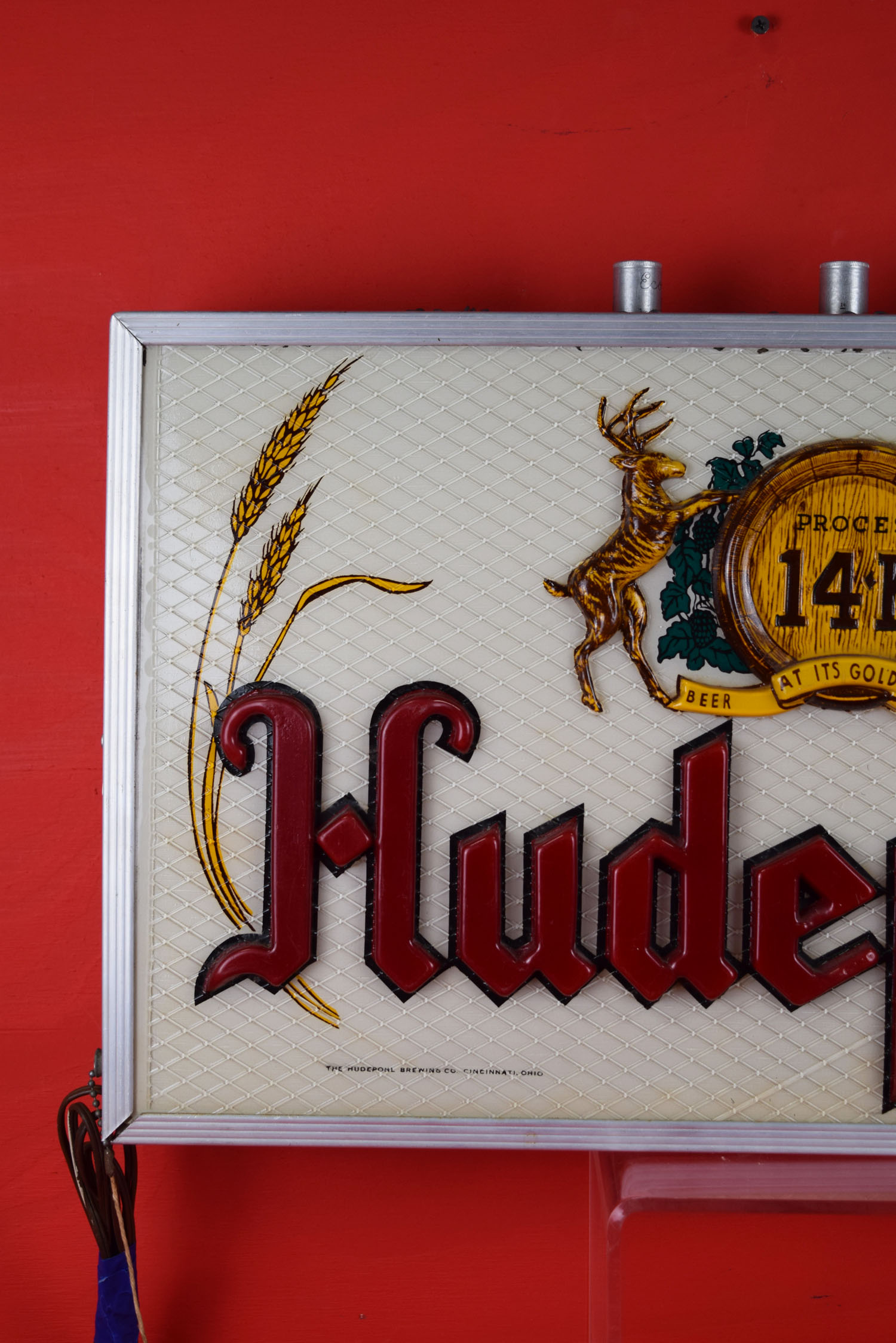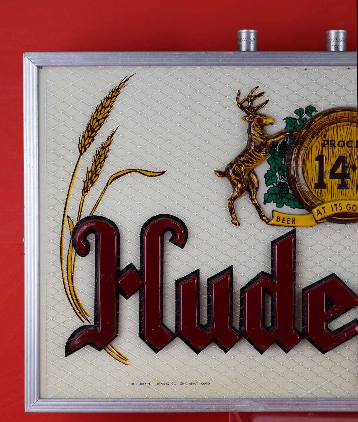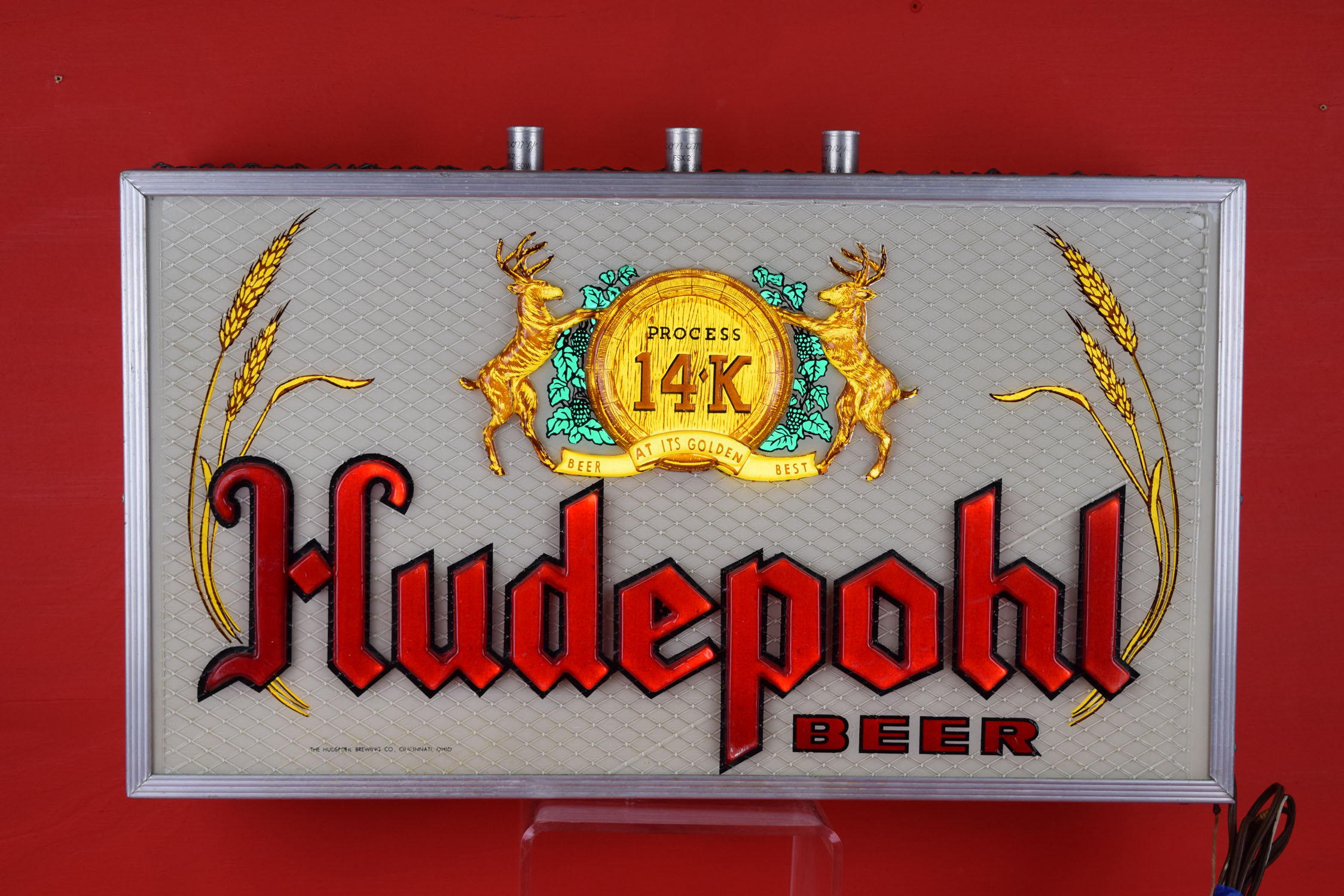 Check out this super nice rare Hudepohl Beer sign that just arrived! The case of this sign is metal, and the plastic sides have embossed letters, along with the deer and barrel above “Hudepohl”. Both faces are free of cracks, and show some wear on the outer edges where the plastic face has bowed in slightly. While the sign looks the same on both sides, you will see a difference once it is plugged in! One side has a beautiful crisp white background, while the other side has a darker background where the letters stand out nicely! The cabinet was manufactured by Hal Mfg. Co., in Cincinnati, Ohio. It measures fourteen inches tall by twenty-four inches wide by four inches wide. 19610-UIP