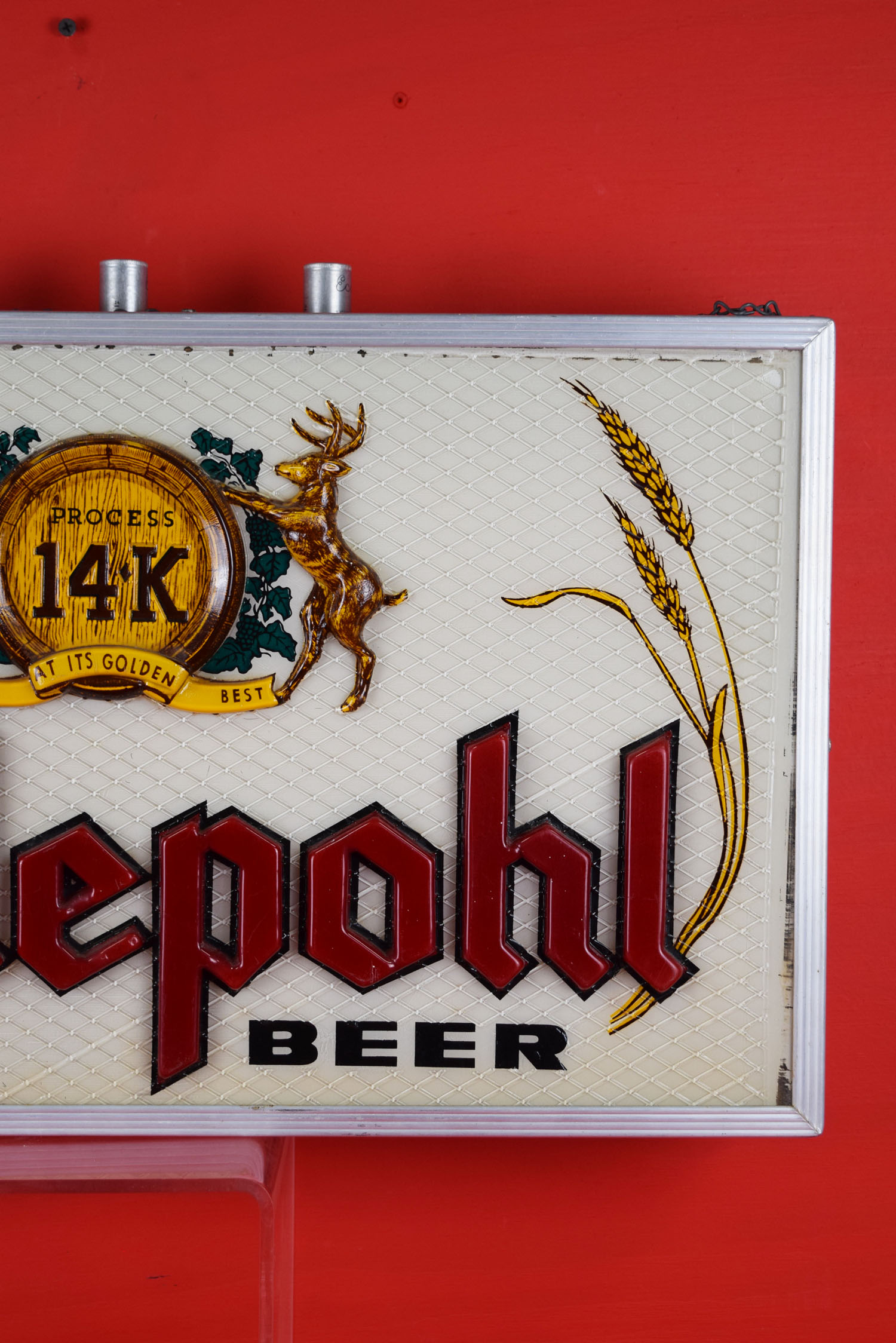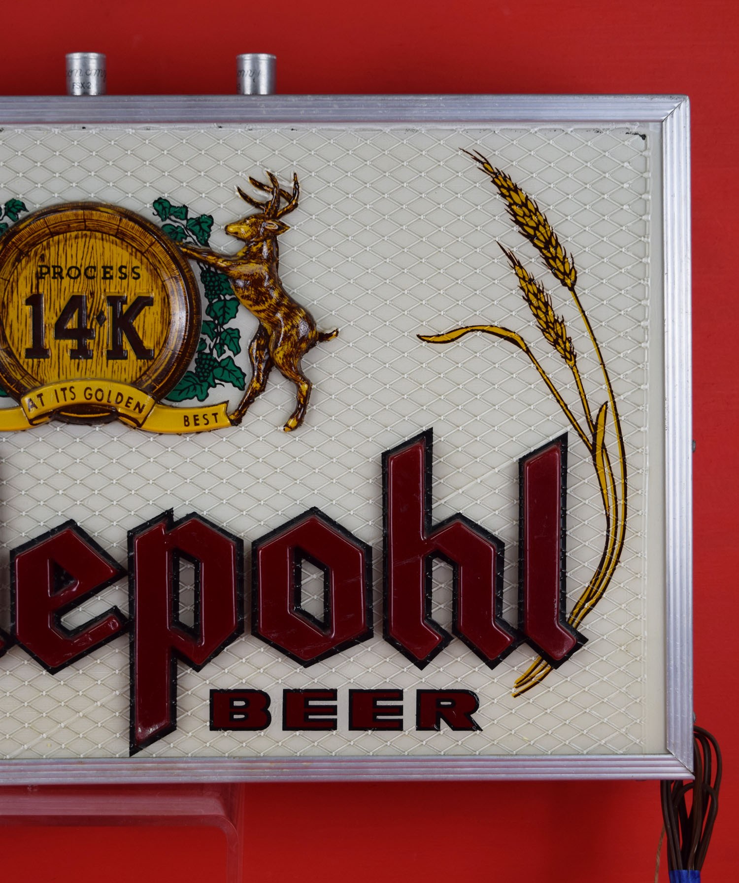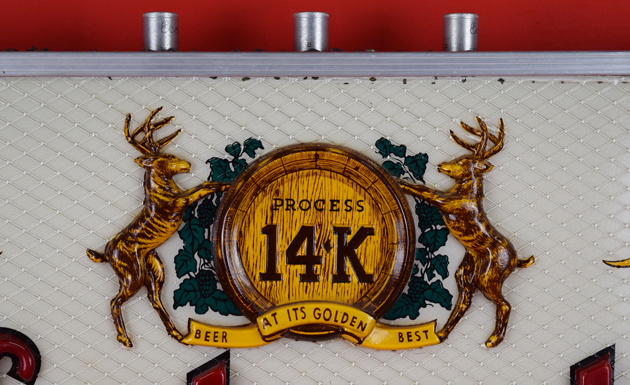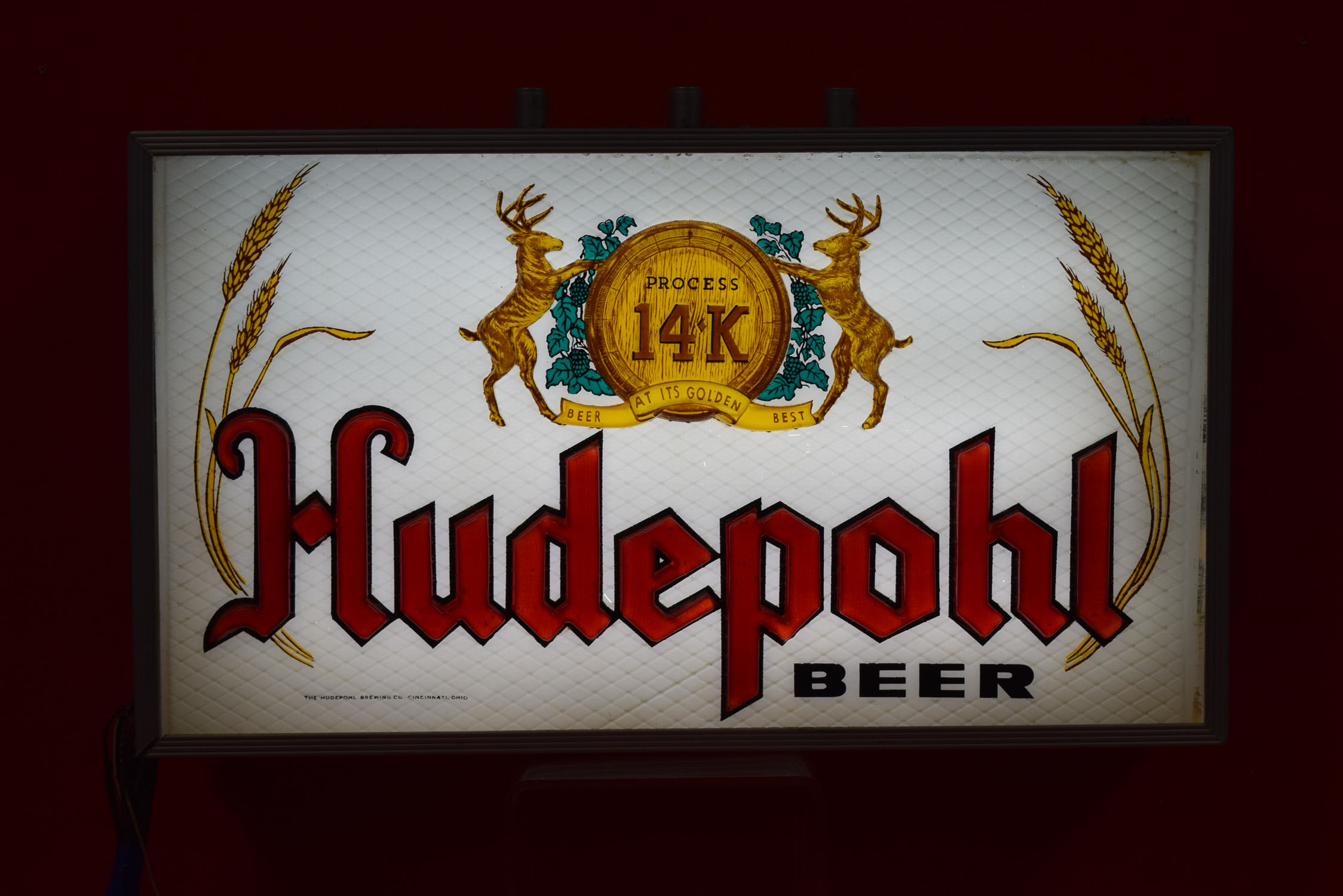Check out this super nice rare Hudepohl Beer sign that just arrived! The case of this sign is metal, and the plastic sides have embossed letters, along with the deer and barrel above “Hudepohl”. Both faces are free of cracks, and show some wear on the outer edges where the plastic face has bowed in slightly. While the sign looks the same on both sides, you will see a difference once it is plugged in! One side has a beautiful crisp white background, while the other side has a darker background where the letters stand out nicely! The cabinet was manufactured by Hal Mfg. Co., in Cincinnati, Ohio. It measures fourteen inches tall by twenty-four inches wide by four inches wide. 19610-UIP