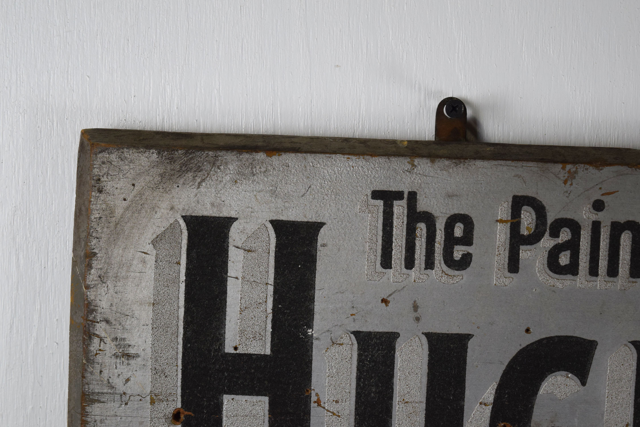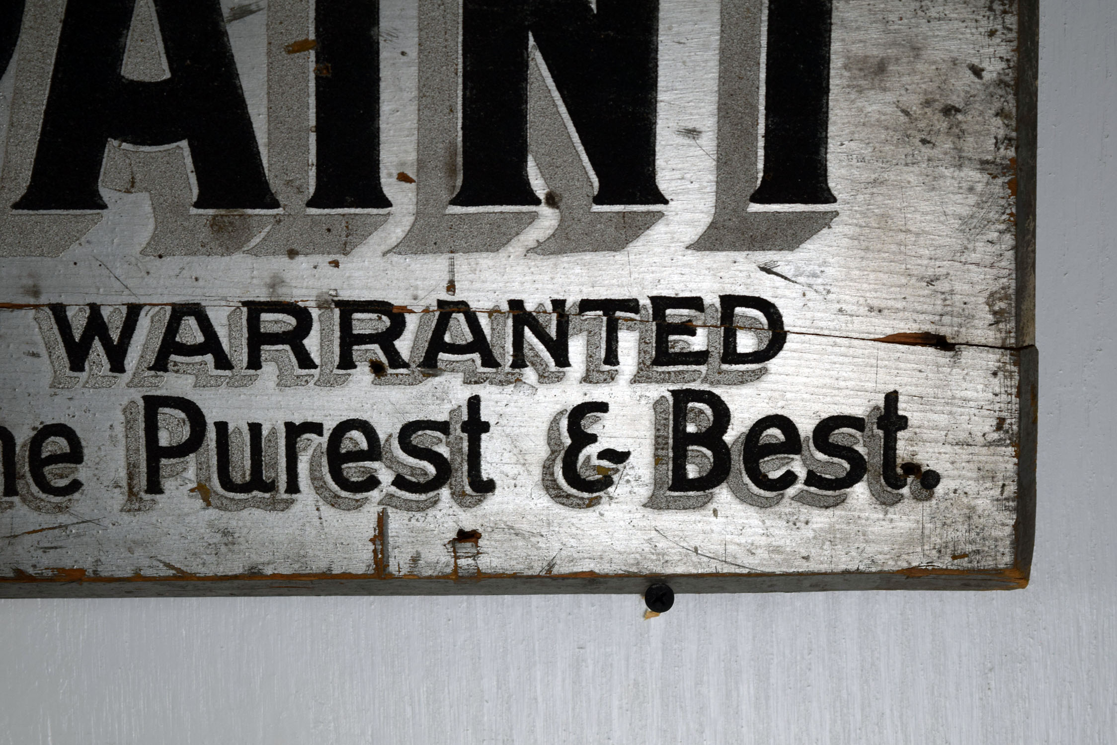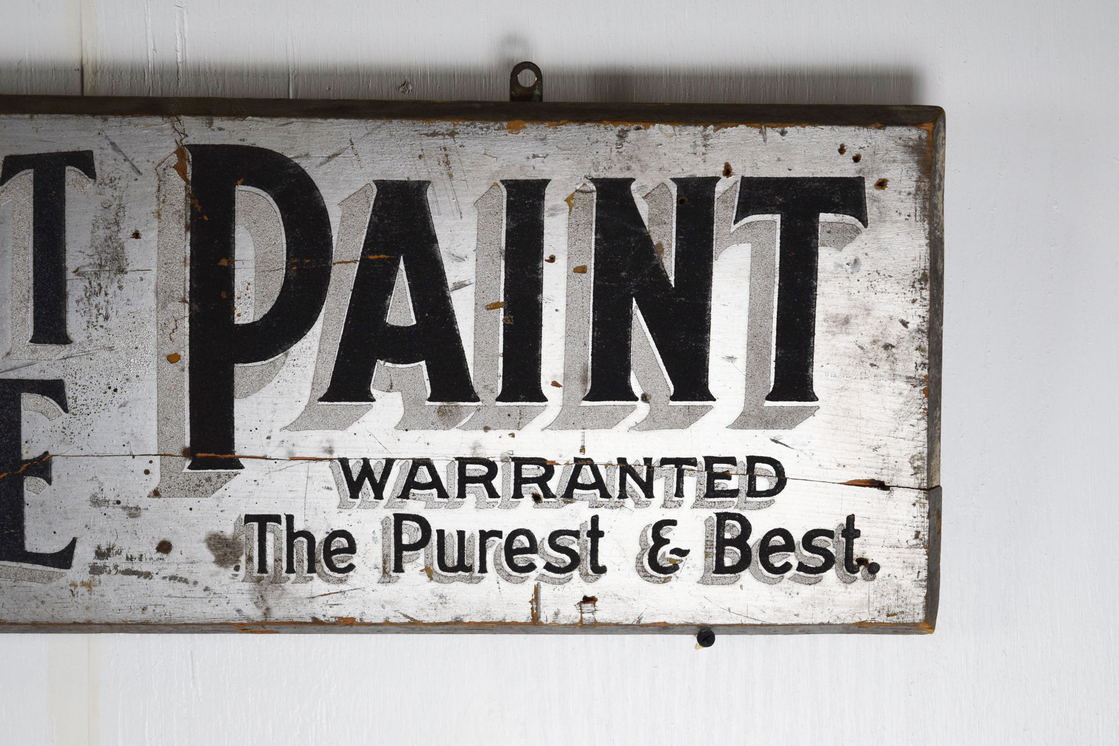 Before signs had lights, they relied on reflective paint for customers to see their message at night. Smaltz paint had tiny amounts of glass in the paint to enable it to reflect the light from oncoming automobile headlights. This Hughes’ Crescent Cottage Paint horizontal wooden sign features Smaltz paint on the letters with some great vintage patina. Some minor chips with paint loss can be seen on the face of this rare sign, along with some cracking on the wood itself. The cracking has been repaired by adding small pieces of wood on the back side of the sign. Great piece of history to have in your collection. 19866-600801