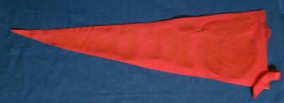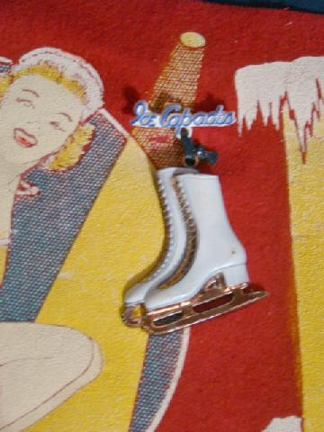 Circa late 1940’s – early 1950’s red felt pennant with an image of a pretty young lady skating under the spot lights and the inscription “Ice Capades” in snow capped letters. Pinned to it is a plastic brooch inscribed “Ice Capades” with a pair of lady’s figure skates dangling below it. There are no marks on the pennant or the brooch. The pennant is in excellent condition with strong colors and very little wear. It has two thumb tack holes and a couple of smudges. 7035-WT