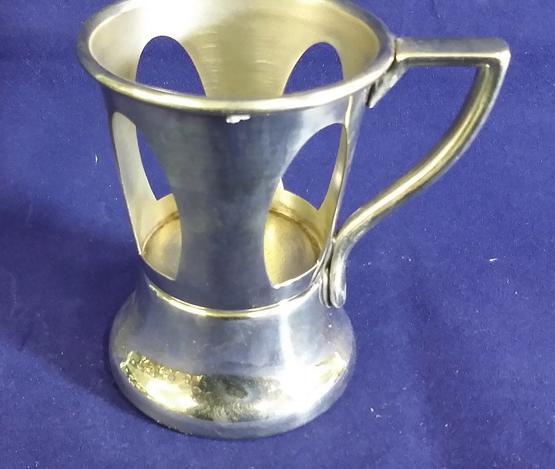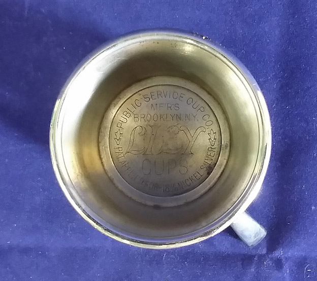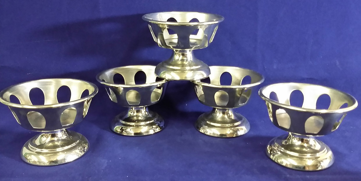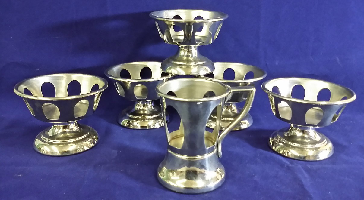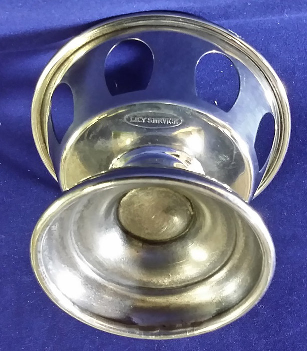 This group of six nickel silver items dates from the from the 1930’s or 1940’s and are all marked “Lily Service.” The group includes five parfait holders and one soda holder with a handle. These pieces were designed to hold paper liners and were used in diners and ice cream shops for serving ice cream and sodas. The lone cup holder is engraved on the bottom ” Lily Cups Public Service Cup Co. Mf’r’s Brooklyn, N.Y.” The cup holder measures three and a half inches tall with a two and a half inch diameter base and the parfaits measure about three inches tall by three and three quarters inches in diameter at the top. They are in near mint condition. The price is for the group of six. 9891-51UT