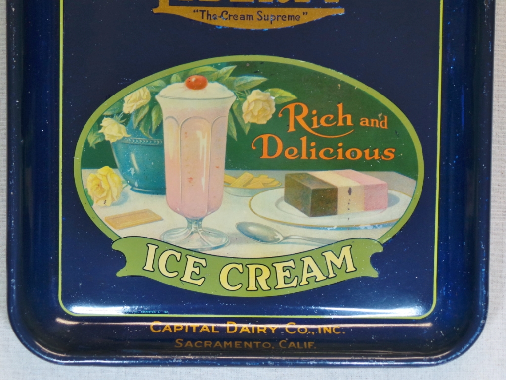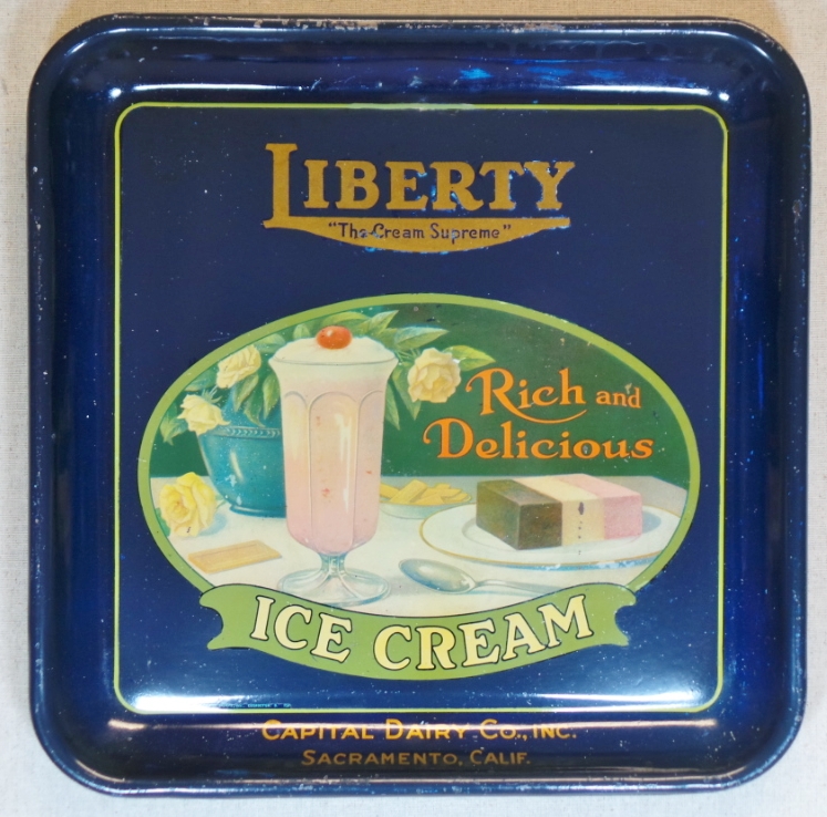 If you think you have seen this tray before, you probably have. Many local ice cream suppliers used the same image on this style tray for different brands of ice cream. Most just had the companies name over the center image, but this one went a step further and added the dairy company name and the location. This tray is from Liberty Ice Cream, “The Cream Supreme”, and the ice cream came specifically from Capital Dairy Co., Inc. in Sacramento, California. This tray was definitely used in an ice cream parlor or soda fountain. The center section background has been lovingly repainted, as has the top of the tray. A little paint has run or drip marks on the top edge. Some small dents at the top of the tray along with chips on the lip. The back of the tray has been repainted during it’s life span also. It is displayable and an early example of this tray. 18185-QEO