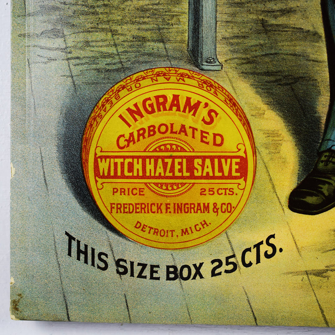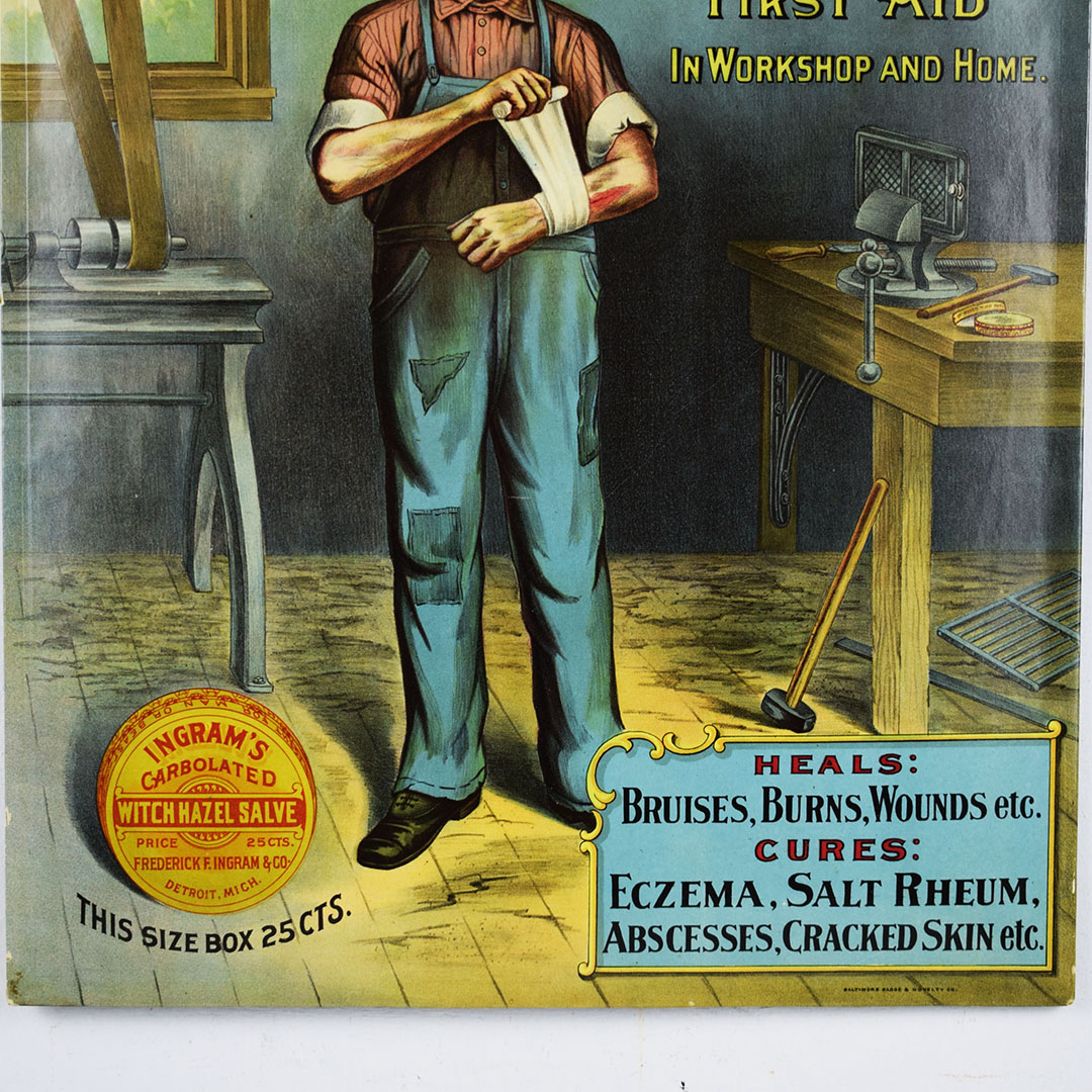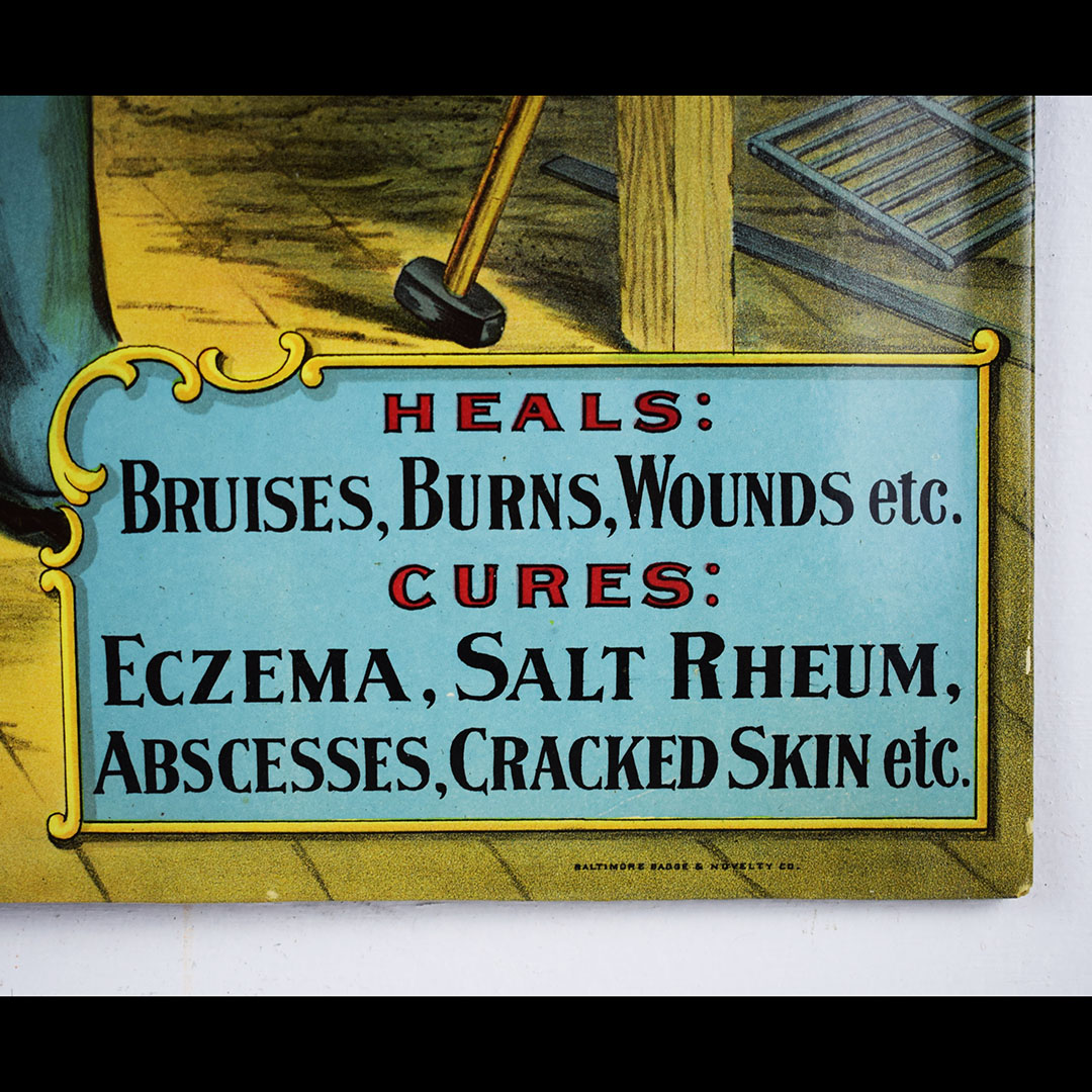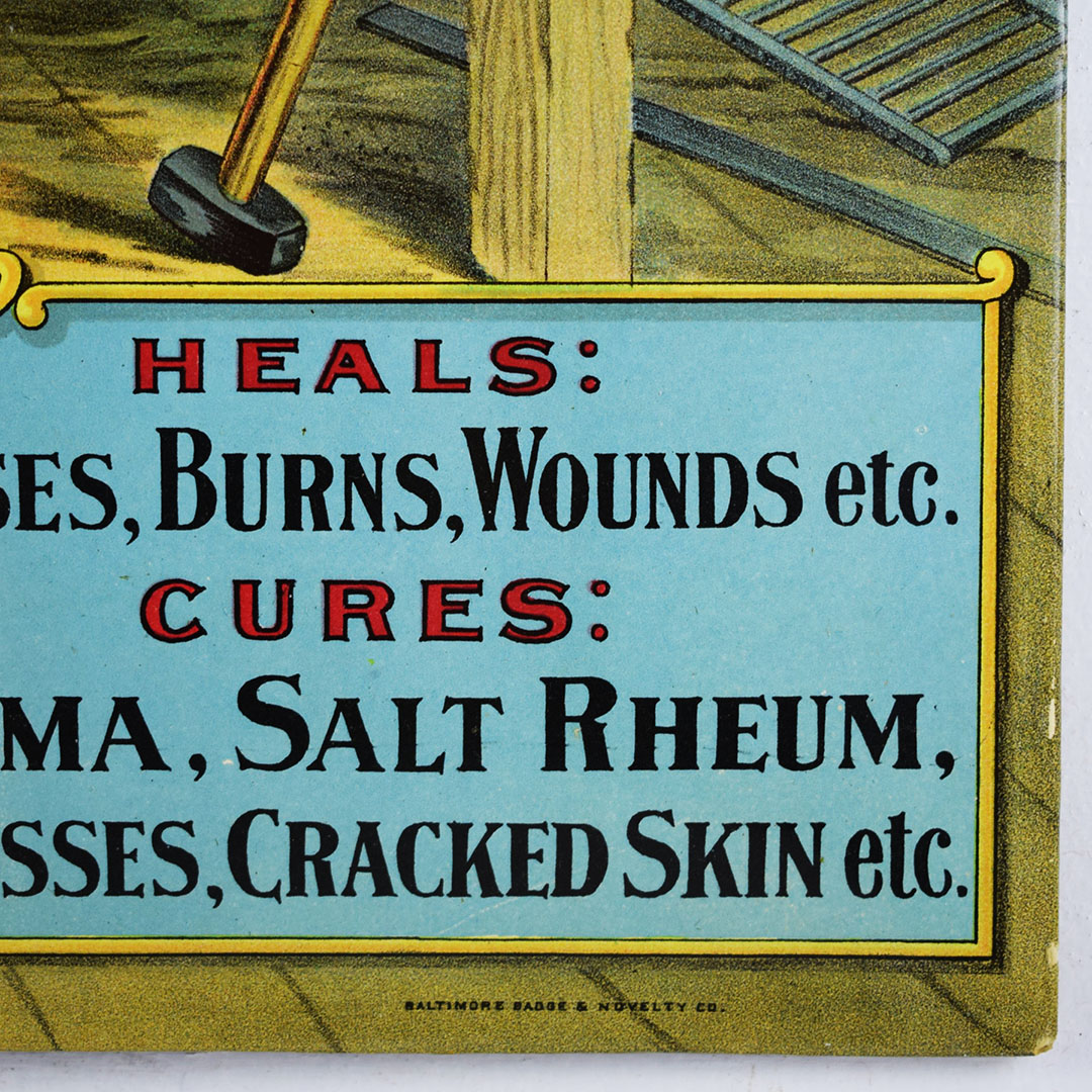 This Ingram’s Carbolated Witch Hazel Salve celluloid over cardboard sign, dating from the early 1900s, shows a blue-collar worker in his workshop or on the job. The graphics on the celluloid finish look fantastic, and the gloss is excellent. It measures 19.75 inches tall by 14 inches wide, with flat outer edges and a curved center section. The sign proclaims it heals bruises, burns, and wounds and cures eczema, salt rheum, abscesses, and cracked skin. Doctors were few and far between during this time, so workers did what they could to keep themselves self-medicated. The outer edges show slight wear, with more in the corner areas. Located near the upper right corner is a 2-inch imperfection. This fantastic piece was produced by Baltimore Badge & Novelty Co., as marked along the lower edge. 21300-QTPP