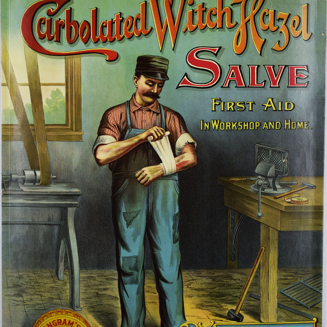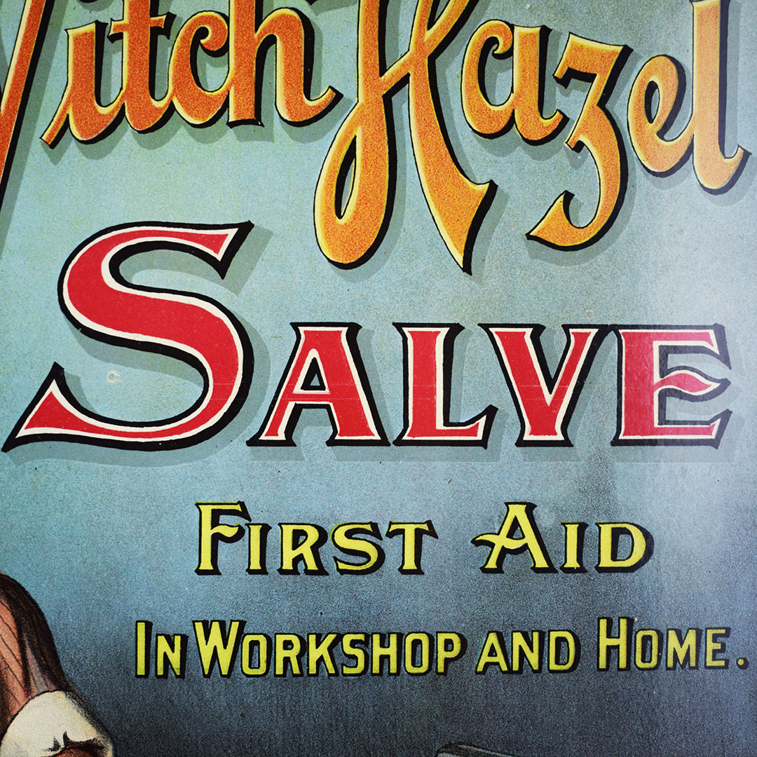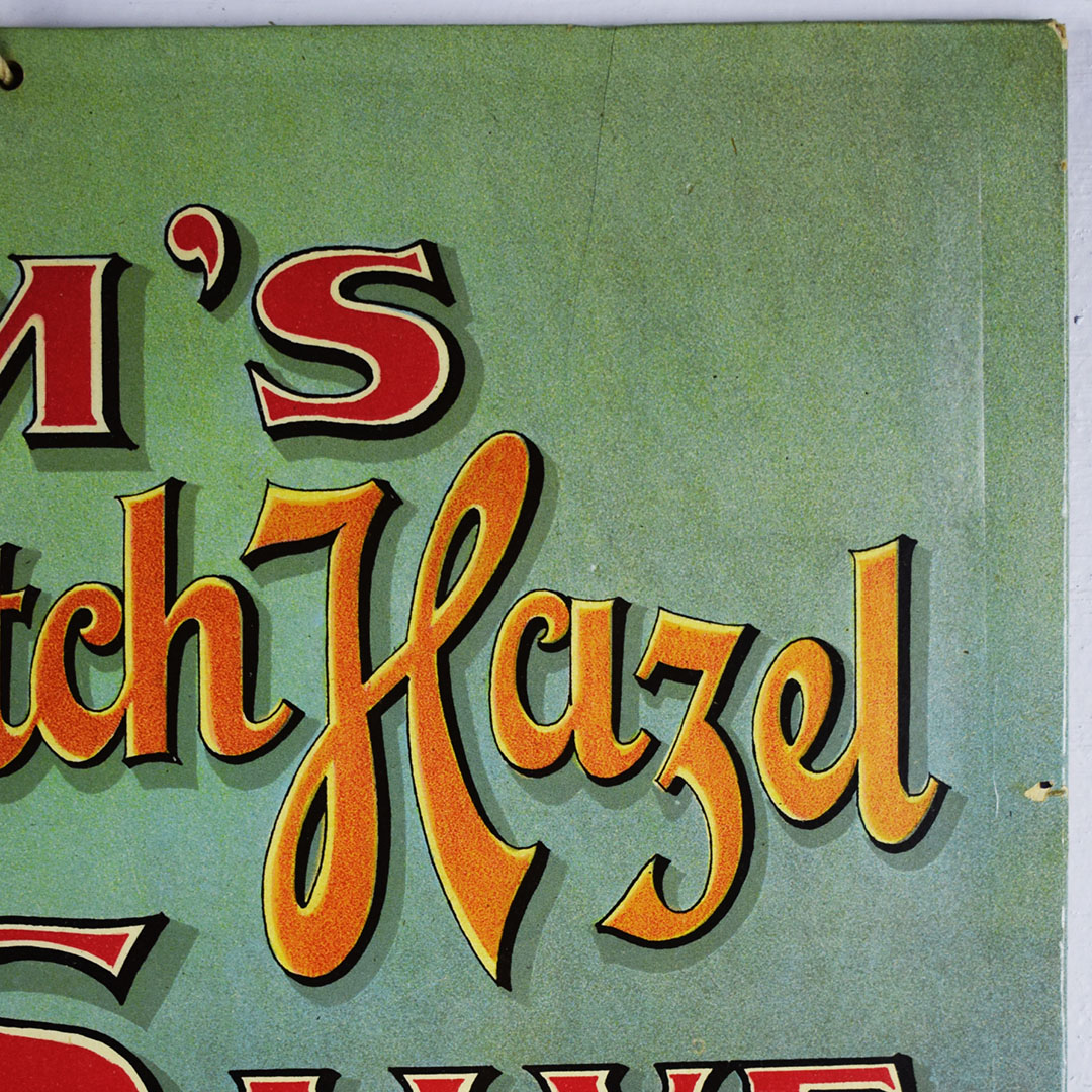 This Ingram’s Carbolated Witch Hazel Salve celluloid over cardboard sign, dating from the early 1900s, shows a blue-collar worker in his workshop or on the job. The graphics on the celluloid finish look fantastic, and the gloss is excellent. It measures 19.75 inches tall by 14 inches wide, with flat outer edges and a curved center section. The sign proclaims it heals bruises, burns, and wounds and cures eczema, salt rheum, abscesses, and cracked skin. Doctors were few and far between during this time, so workers did what they could to keep themselves self-medicated. The outer edges show slight wear, with more in the corner areas. Located near the upper right corner is a 2-inch imperfection. This fantastic piece was produced by Baltimore Badge & Novelty Co., as marked along the lower edge. 21300-QTPP
