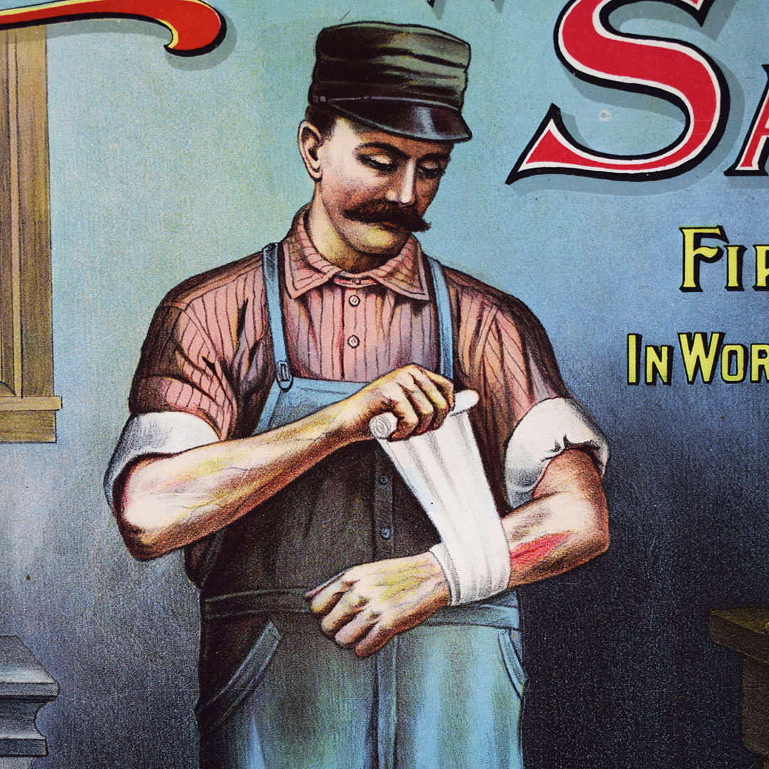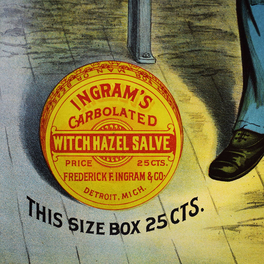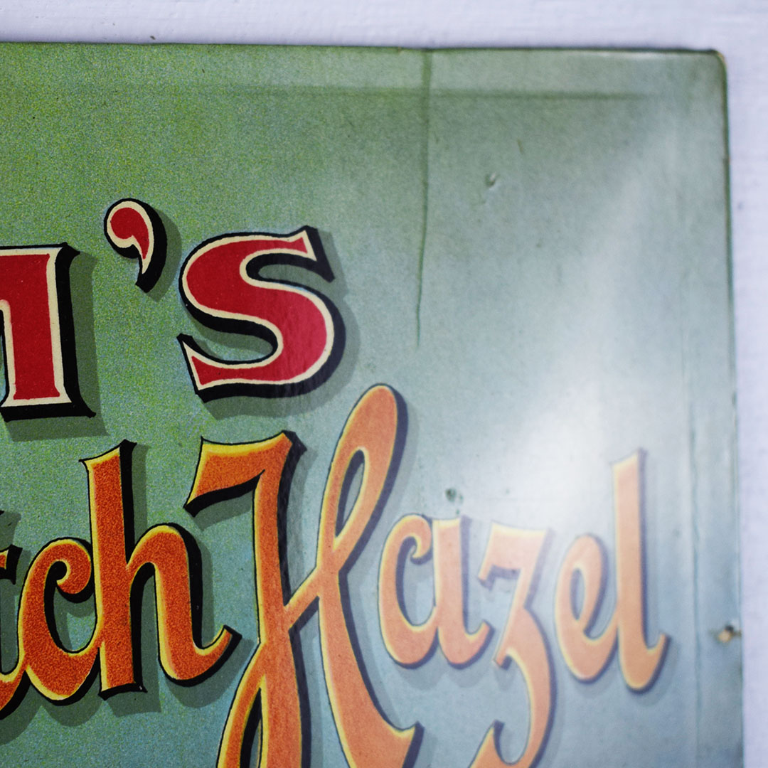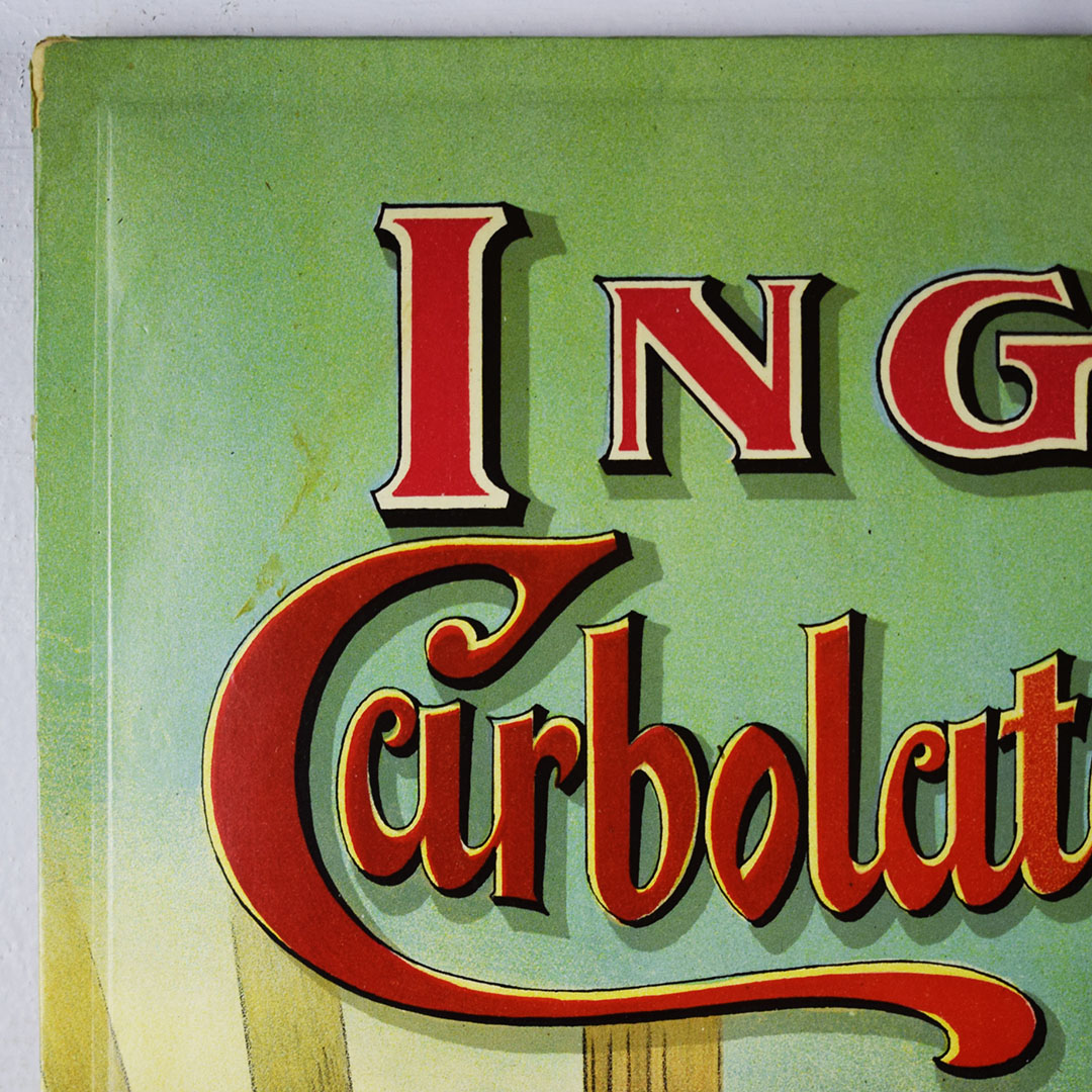 This Ingram’s Carbolated Witch Hazel Salve celluloid over cardboard sign, dating from the early 1900s, shows a blue-collar worker in his workshop or on the job. The graphics on the celluloid finish look fantastic, and the gloss is excellent. It measures 19.75 inches tall by 14 inches wide, with flat outer edges and a curved center section. The sign proclaims it heals bruises, burns, and wounds and cures eczema, salt rheum, abscesses, and cracked skin. Doctors were few and far between during this time, so workers did what they could to keep themselves self-medicated. The outer edges show slight wear, with more in the corner areas. Located near the upper right corner is a 2-inch imperfection. This fantastic piece was produced by Baltimore Badge & Novelty Co., as marked along the lower edge. 21300-QTPP