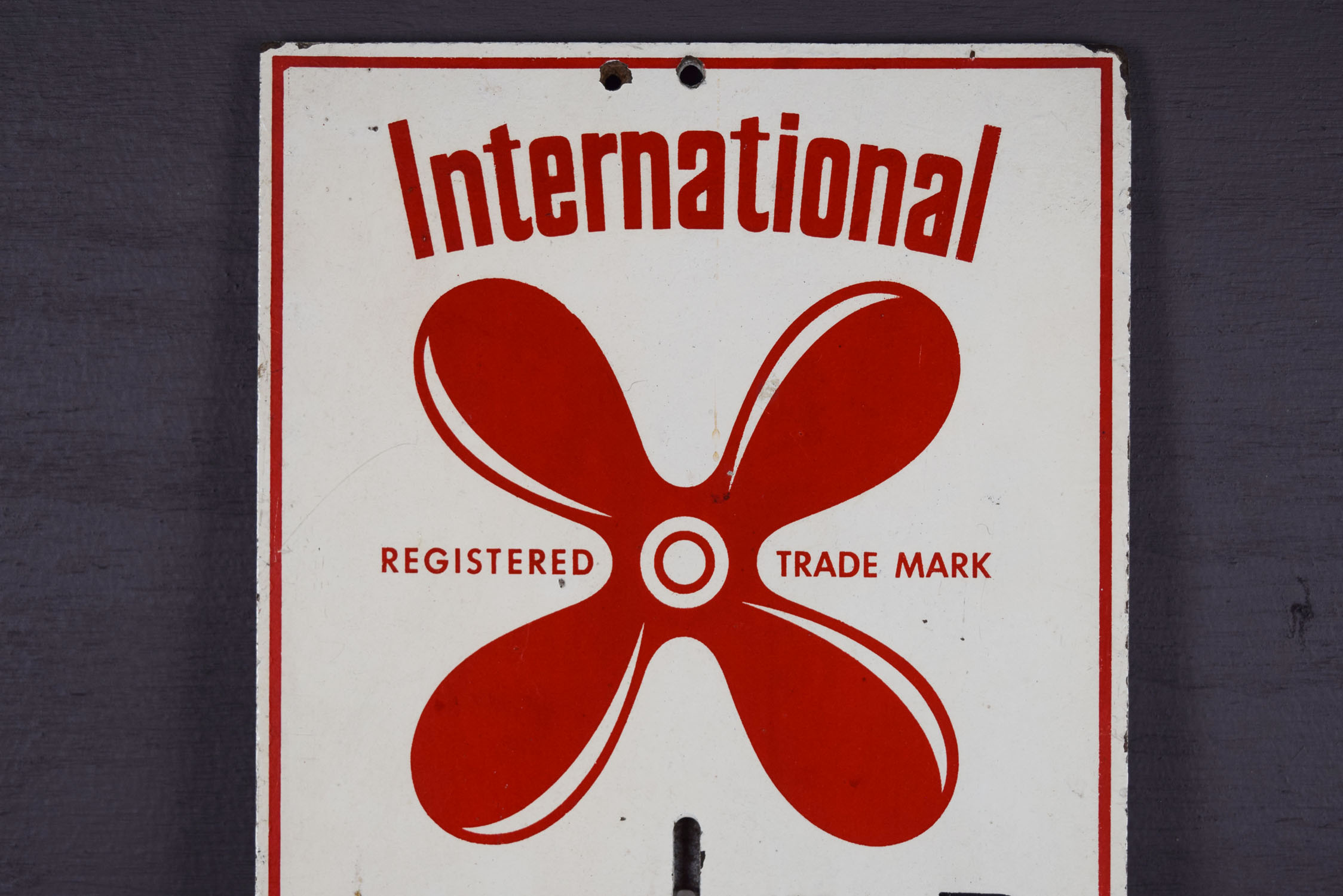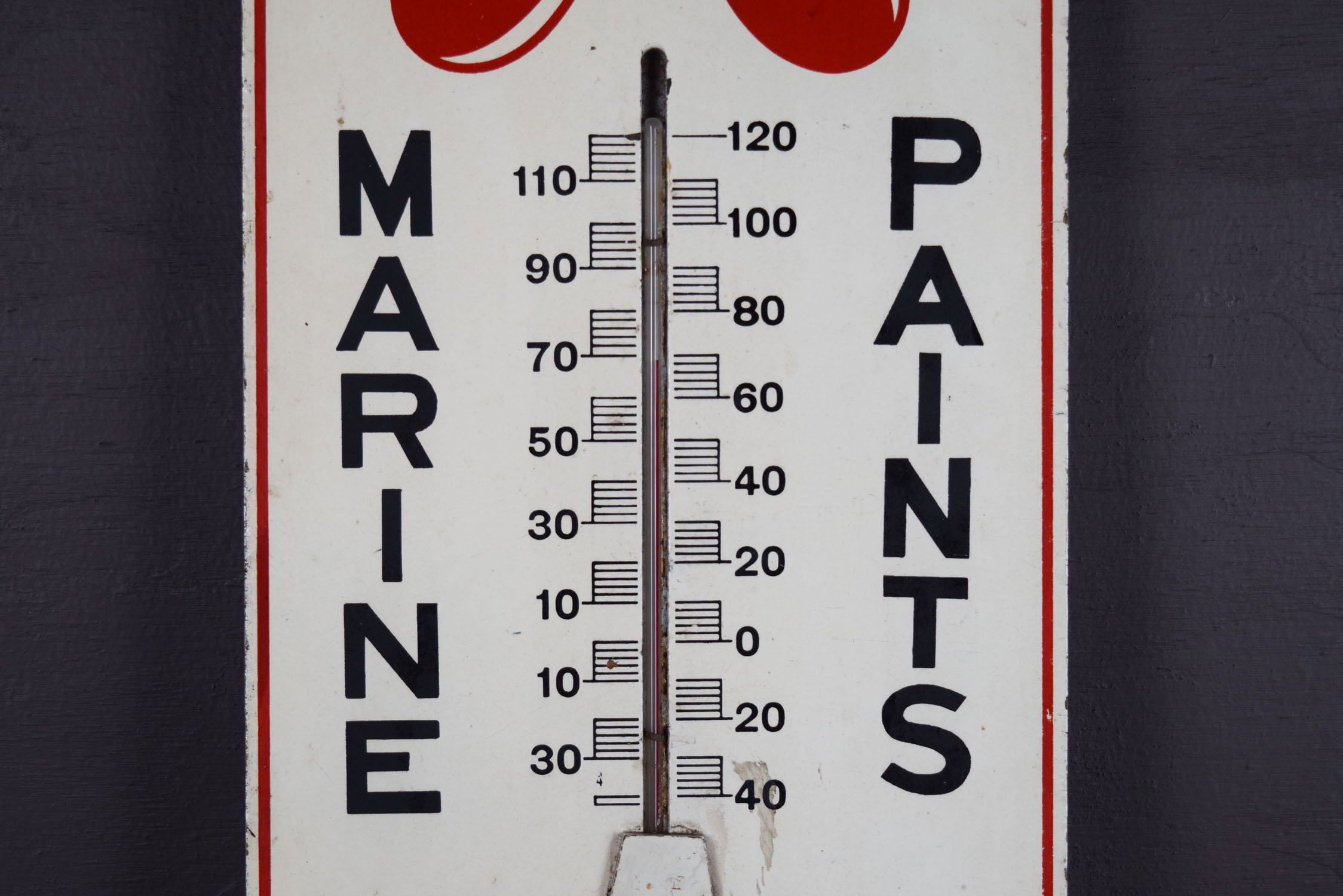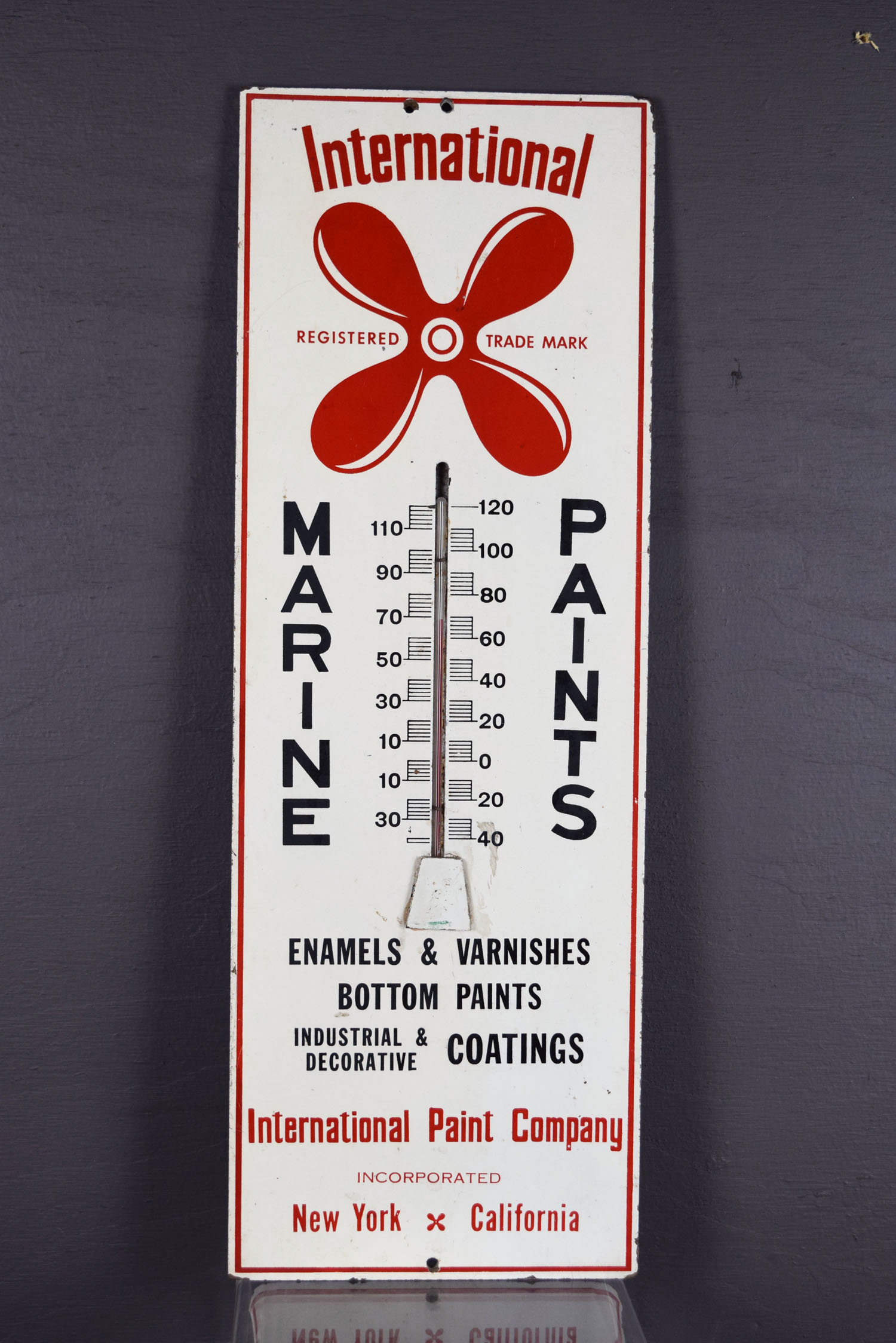 Many collectors love nautical items, and this rare thermometer will make a great addition! The masonite thermometer measures twenty inches tall by seven inches wide and is painted white with red and black letters. Some minor wear with paint loss can be seen on the outer corners and edges. The glass tube is loose inside the housing, and it appears that someone has added the piece on the front to keep it from falling out. A few marks can be seen on the face of the thermometer as well. Nice rare piece! 19721-IP