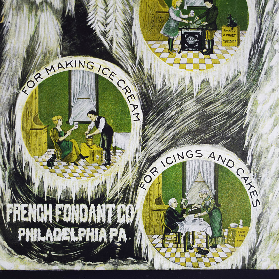 This rare one-sided cardboard sign dates from around 1900 and would have originally been displayed in a country store or corner grocery. It is inscribed “Jack Frost Fontaine French Fondant Co. Philadelphia, PA.” and beautifully lithographed with three round insets showing different uses for the confectionary product. The background is decorated with an icy image of Jack Frost blowing and ice-covered vegetation. The sign measures thirteen and three-quarters inches tall by ten and one-eighth inches wide and is in excellent condition, with about an inch missing from the upper right corner and some light water stains. 16008-61IT