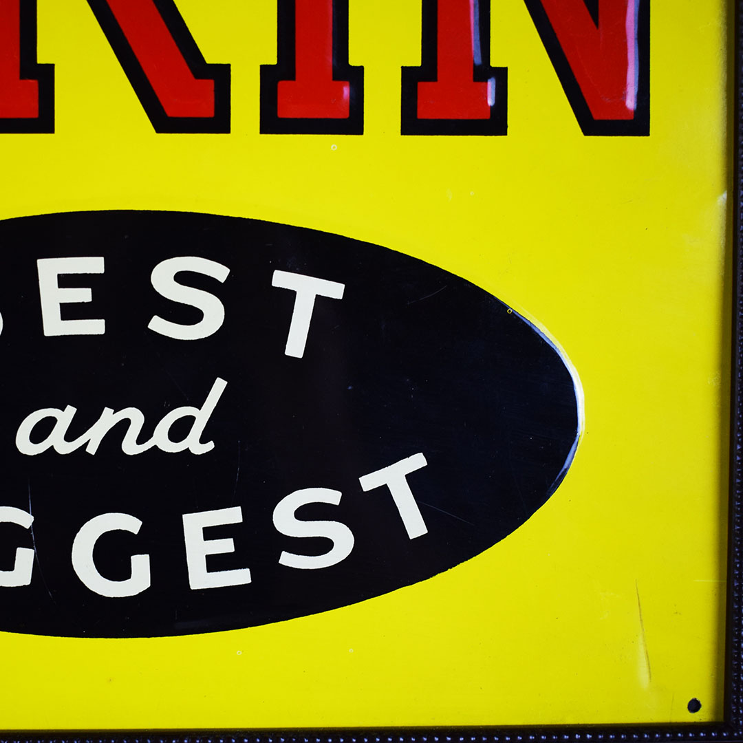 Sharp Day 1 color, this beautiful tin sign features a smoldering John Ruskin cigar so lifelike you could grab it! The gloss is spectacular on this framed sign. The John Ruskin letters are all embossed, along with the outline of the cigar and the oval. Two minor dents in the tin are located along the bottom edge, one in the middle and one on the far right of the sign. Since it is a very thin tin sign, it is typical to have some small bends along the outer edges, and you can see a few along the top. A. C. Moore installed a wooden frame around the outer edge, but it still allows you to see the holes around the outer edges. The frame measures 13.25 inches tall by 30.75 inches wide. 21289-TPP