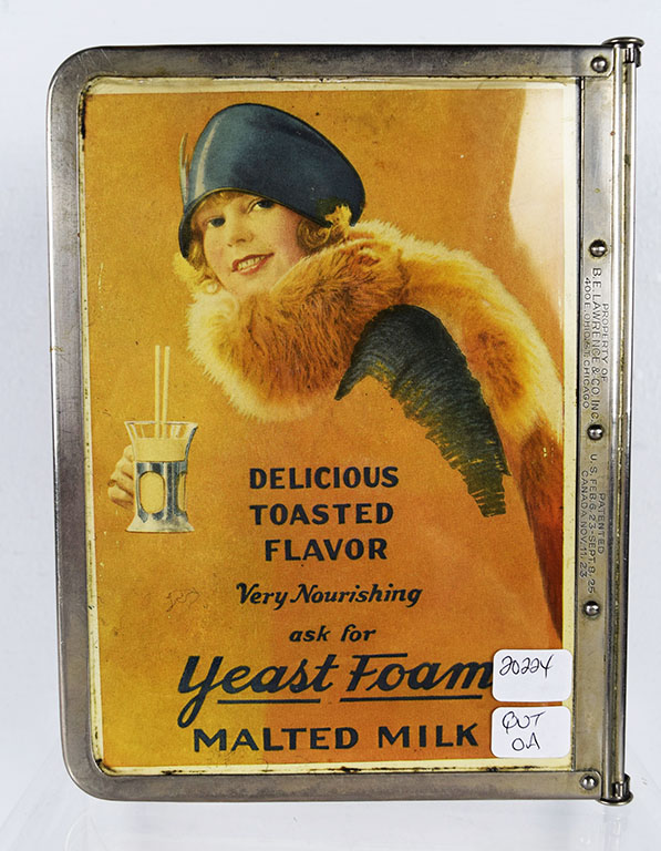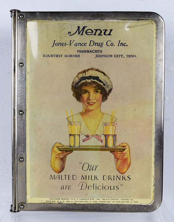 Yeast Foam Malted Milk saw a great way to sell their product to a captive audience when they used these menus in local soda fountains. The front features the name “Jones-Vance Drug Co. Inc.” with their location of Johnson City, Tennessee. The inside covers and the back cover have great graphics and date the menu from the late 1920’s. Inside is a paper menu with different soda fountain offerings. Super nice piece to use in your soda fountain display! 20224-QUT