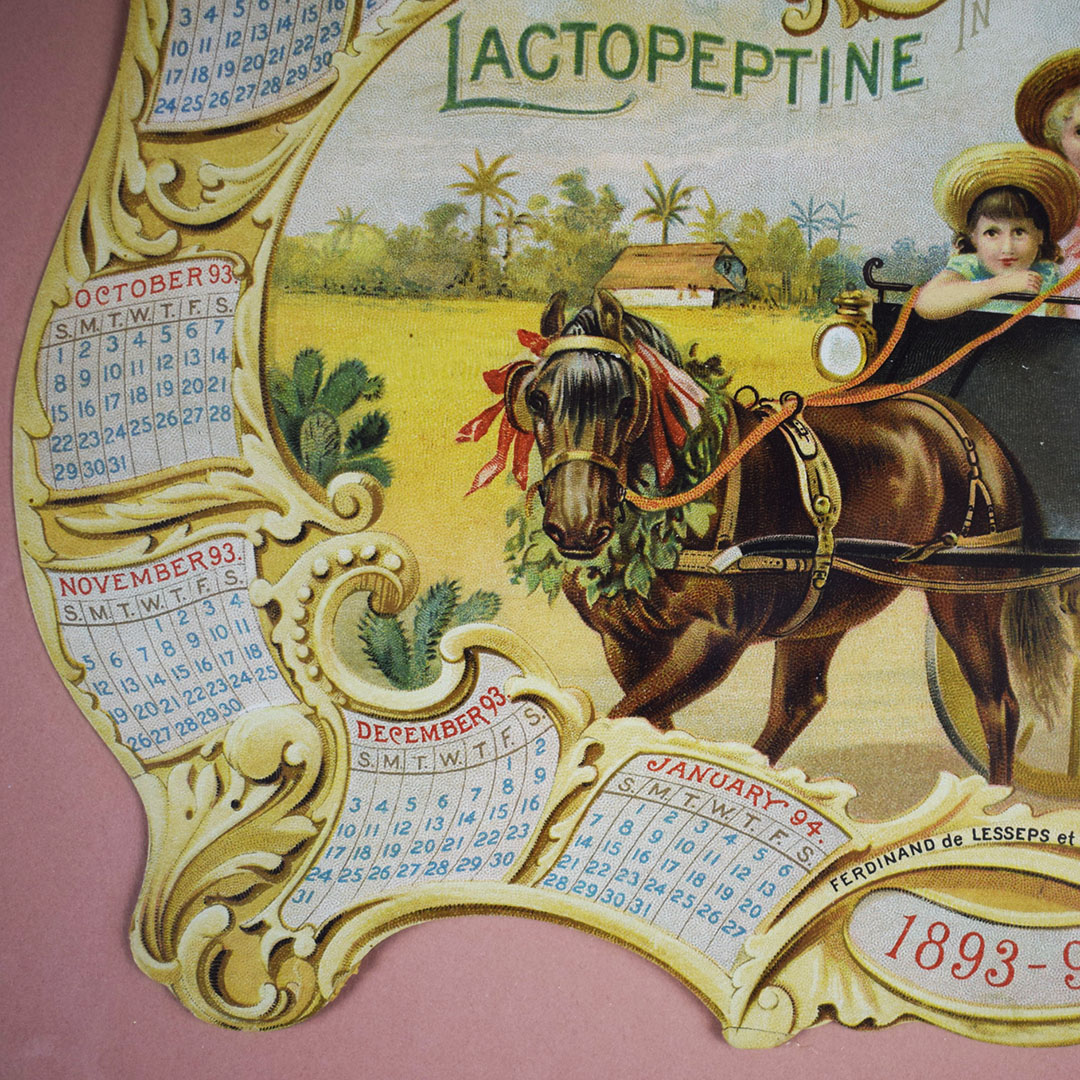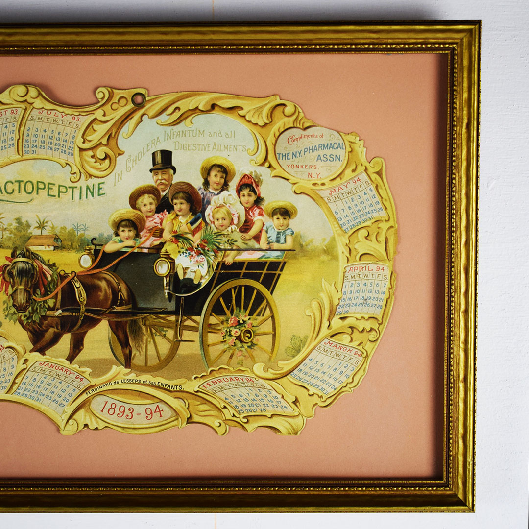 This die-cut calendar, compliments of the N. Y. Phatmacal Assn., displayed the months of July 1893 to May 1894 around the outer edge. The middle features an excellent graphic of a horse-drawn wagon with a doctor and children. The upper right corner of this early piece is missing, and it has been framed for protection. The frame measures 11 inches by 15 inches, and the die-cut measures 8 inches by 11.5 inches. 21252-TPP