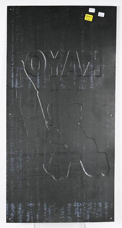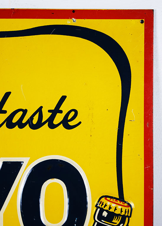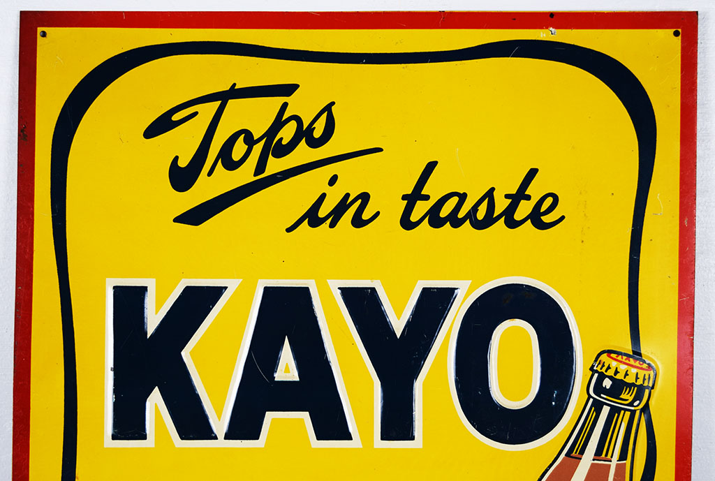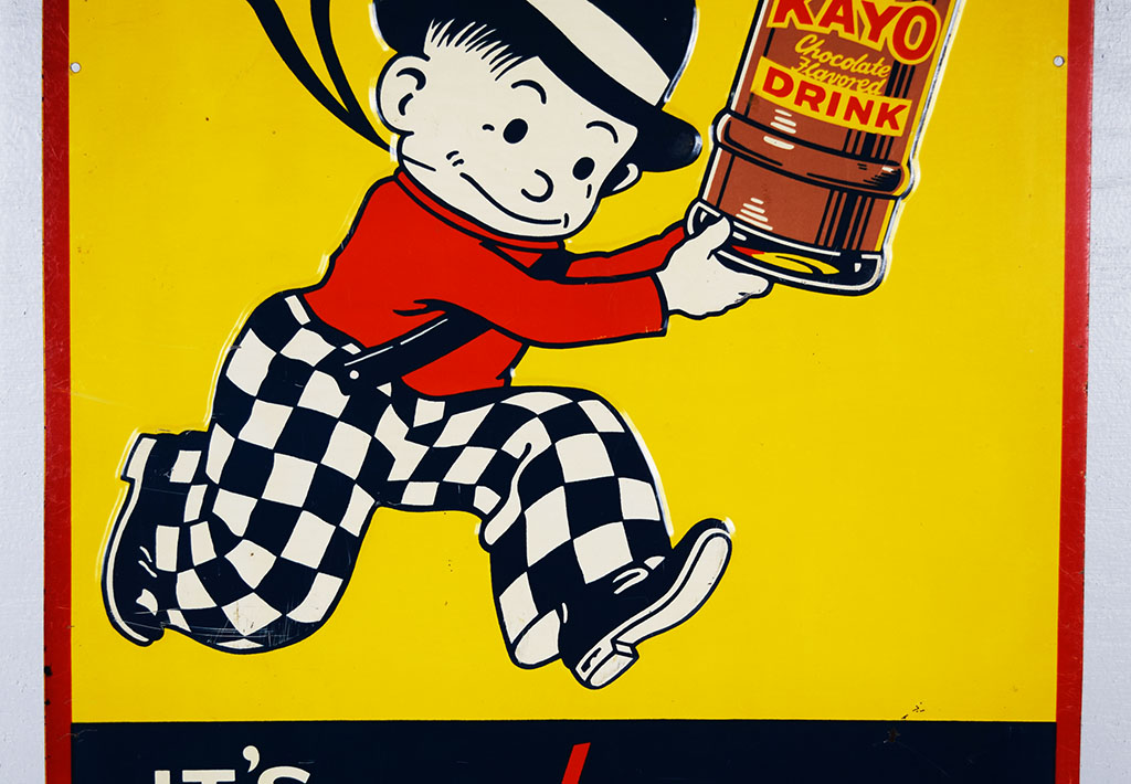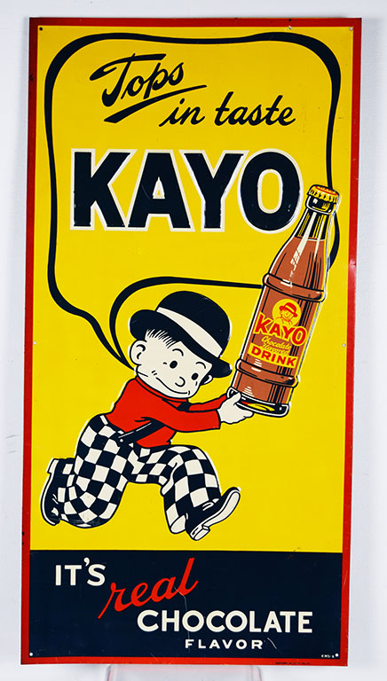 Here is a great looking Kayo chocolate drink sign which dates from the 1940’s! It features the Kayo kid complete with checkered pants, red shirt, and bowler hat carrying a large bottle of Kayo Chocolate Flavored Drink! He is completely embossed, as is the bottle and the “Kayo” letters. The sign has some light scratches on the colorful face, with some longer ones at the bottom. It measures twenty-seven and a half inches tall by fourteen inches wide with “KMS-8” in the lower right corner. Don’t miss your chance to own this seldom seen “Tops In Taste” slogan sign! 20236-IPP