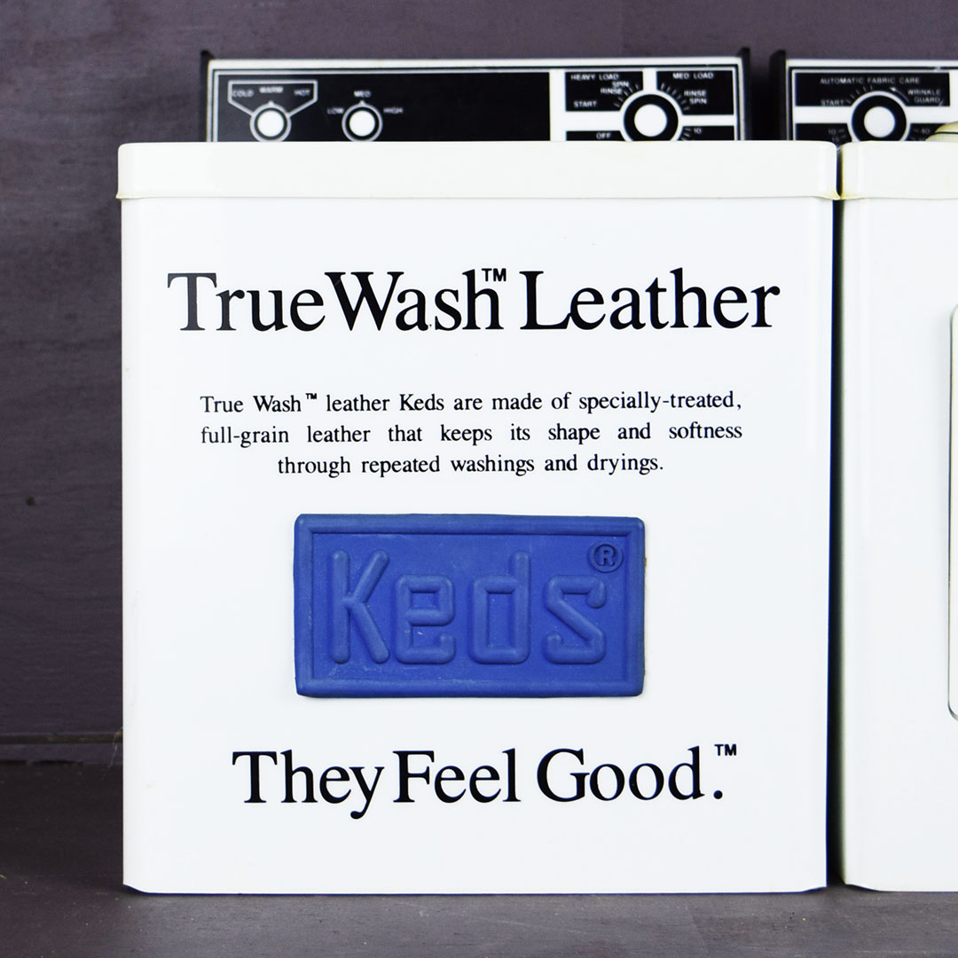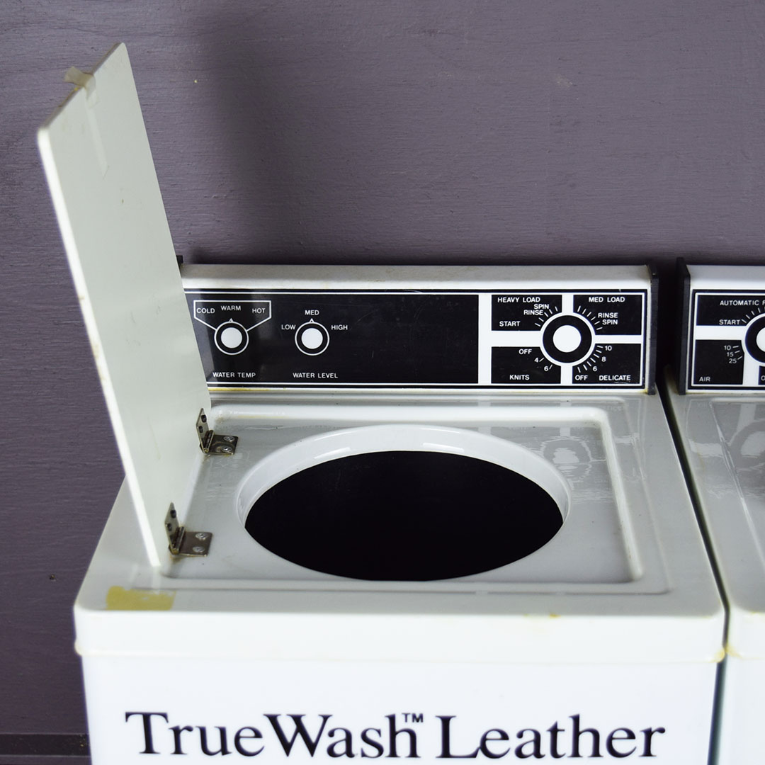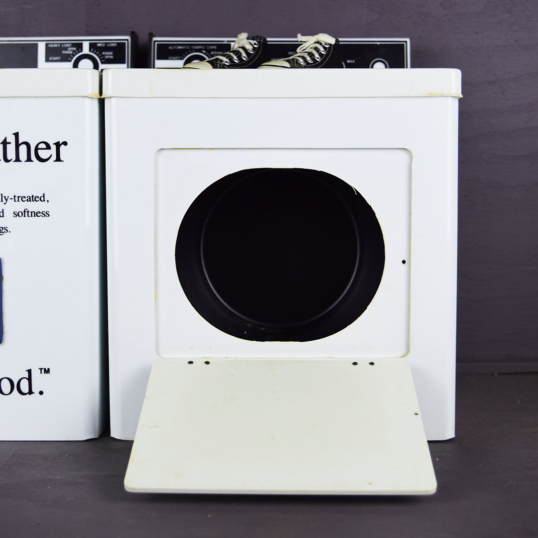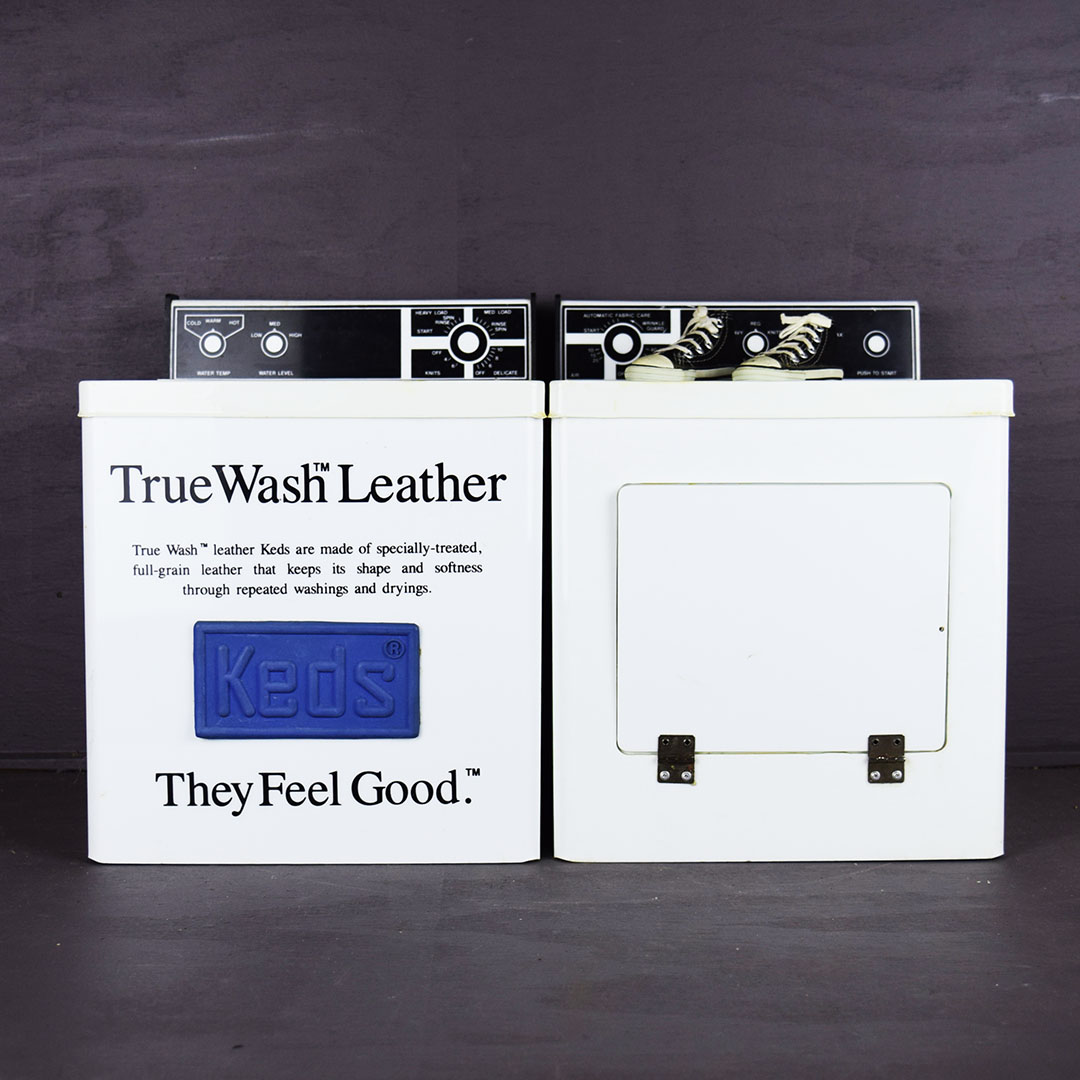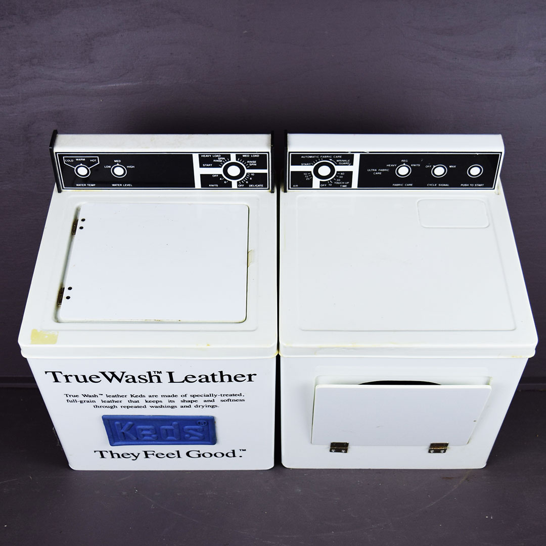 Check out this excellent advertising display for Keds leather shoes! As parents, we know that our kid’s shoes are never clean. Keds Shoes knew this and designed this eye-catching store display to promote their line of TrueWash Leather shoes. This display features opening doors on both the washer and dryer, printed control panels, and a tiny pair of sneakers complete with fabric laces. Attached in the middle, the two measure 12 inches tall, 19 inches wide, and 9.5 inches deep. Minor wear is on this excellent display piece, but it is missing the far right trim that covers the end of the control panel on the dryer. 20991-RT