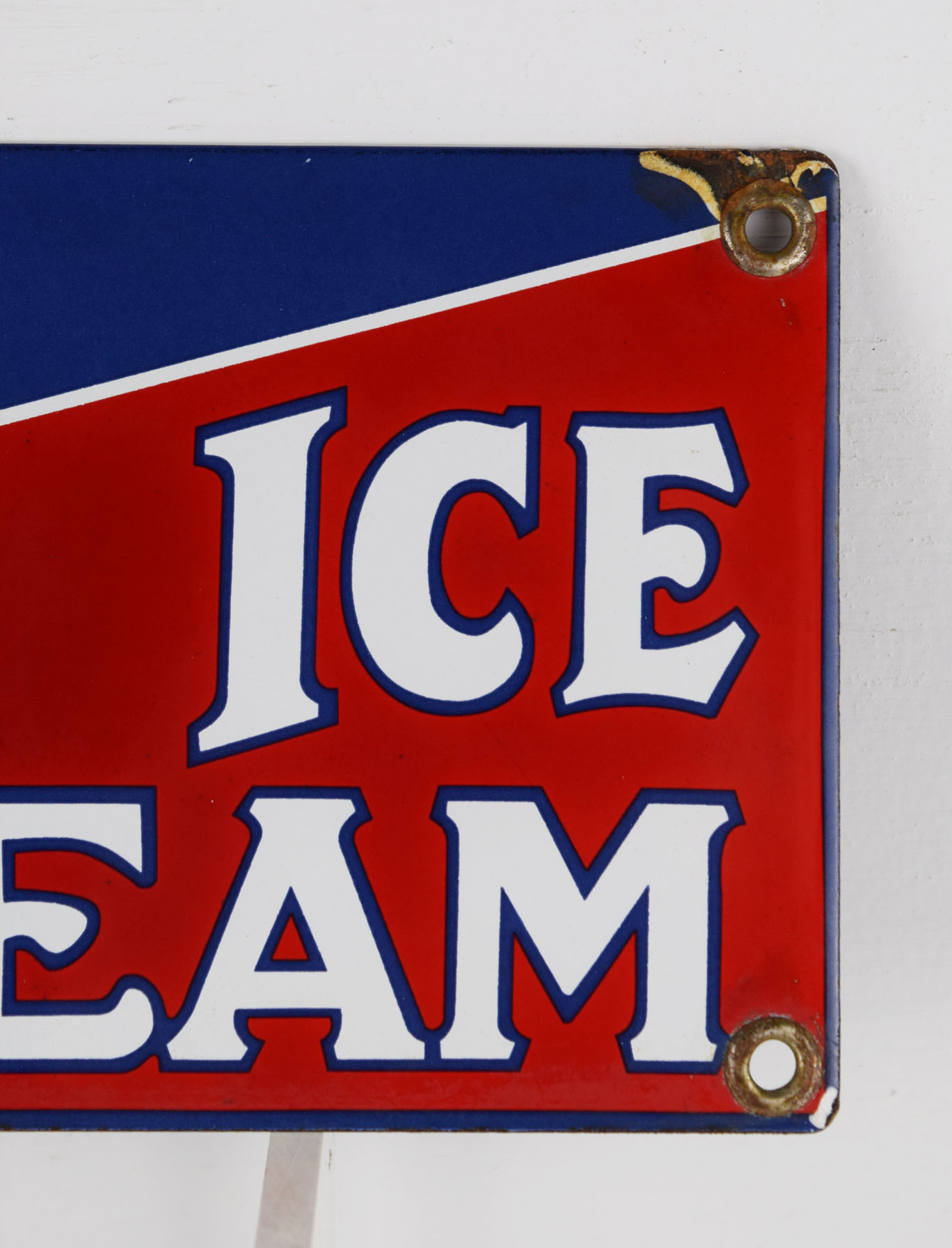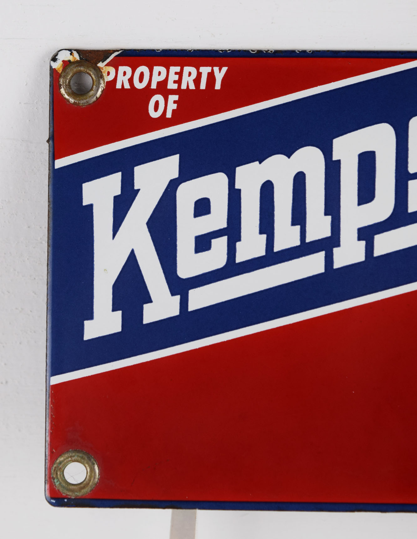 Just the right size to fit in anyone’s collection, this colorful Kemp’s Ice Cream is ready for you! Used to keep store owners honest, this sign is marked “Propery Of” in the upper left, with “Kemps Real Quality” below, and “Ice Cream” in the larger field. Some minor chipping can be seen in the upper corners and the lower right corner. It has the original grommets at each corner, and the field is sharp and glossy as it should be. A production mark can be seen below the word “Quality”, also a small scratch in the same area. It measures four inches tall by ten inches wide. Great piece to add to your soda fountain collection! 19639-TQP