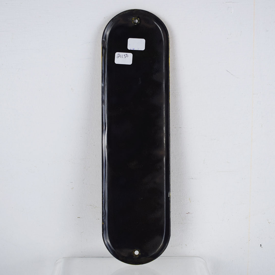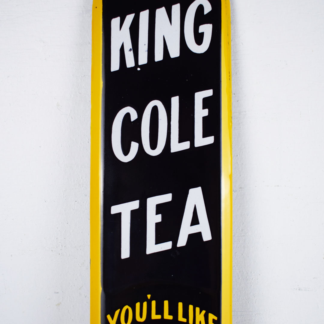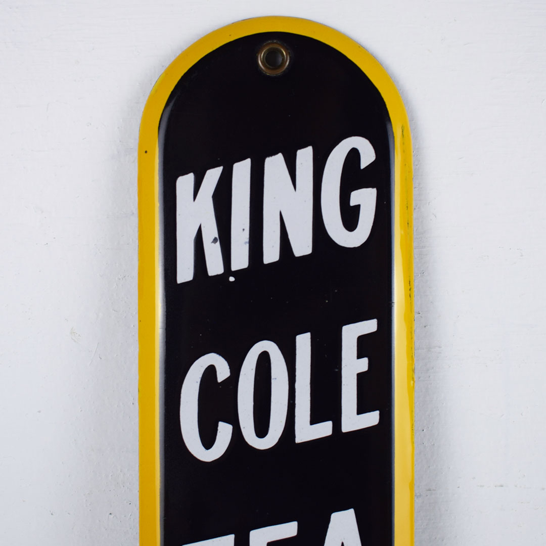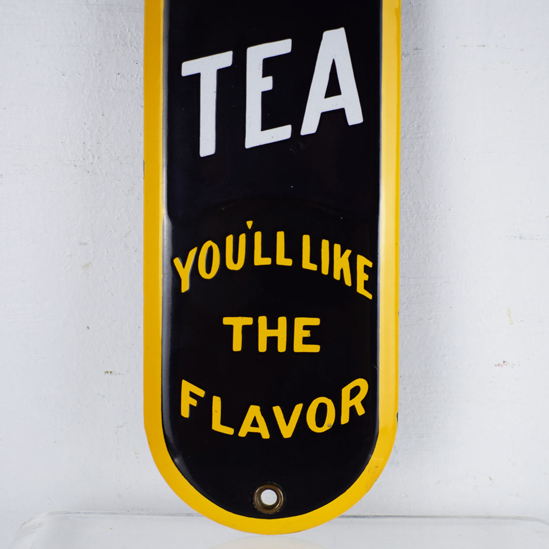 This rare King Cole Tea door push from the 1920s features a three-color porcelain finish and measures 11 inches tall by 3 inches wide. King Cole Tea’s slogan was “You’ll Like The Flavor, ” which is on the bottom of this door push. The porcelain shelving feels excellent on this century-old piece, with a few production flaws on the face and the right edge. It retains the original brass grommets at the top and bottom and will be a beautiful addition to your collection. 21150-YUT