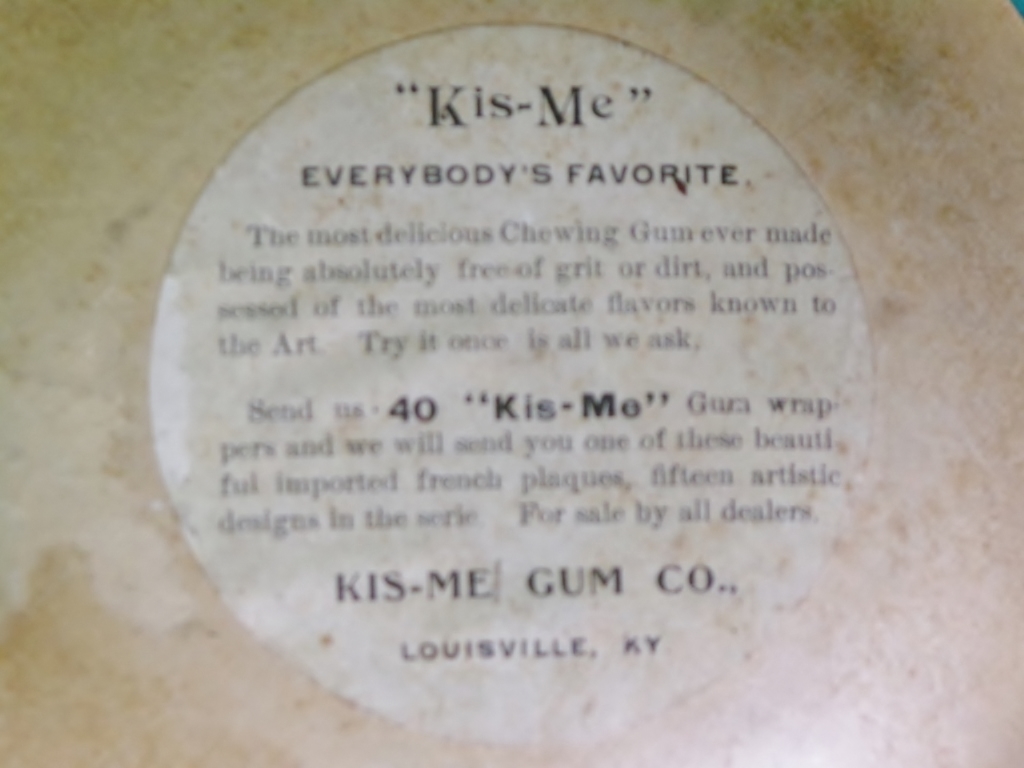 A collectible item in its own day, this little lithographed dish could be had by anyone who sent forty Kis-Me gum wrappers to the manufacturer. One of fifteen imported French “plaques” in the series dates from around the turn of the twentieth century and has a sweet image of a little girl picking roses on the front. A decal on the back is inscribed “Kis – Me Everybody’s Favorite. The most delicious chewing gum ever made was free of grit or dirt and possessed the most delicate flavors known to the art. Try it once is all we ask.” The dish measures five and three-eighths inches in diameter. It is in excellent condition with a one-and-a-half-inch long area of surface loss along the right edge and light discoloration throughout. These did not survive due to their being cardboard. They came from an old-time collector. 3435-71QPP