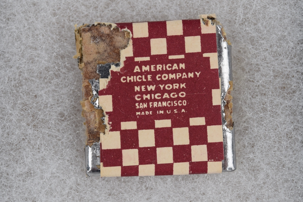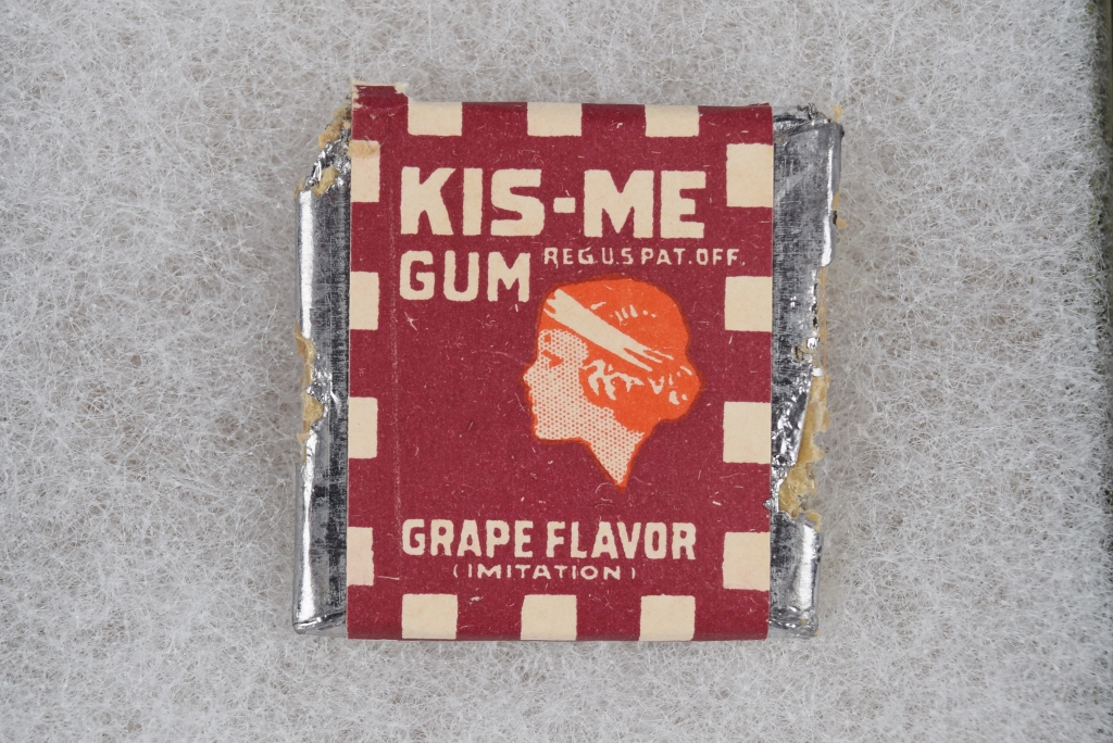This nice 1920’s Kis Me Gum pack is marked “Grape Flavor” and in very good shape. Some wear on the backside with paper and foil torn. It is marked “American Chicle Company” on the back with “New York, Chicago, San Francisco, Made In U. S. A.” below. 20023-