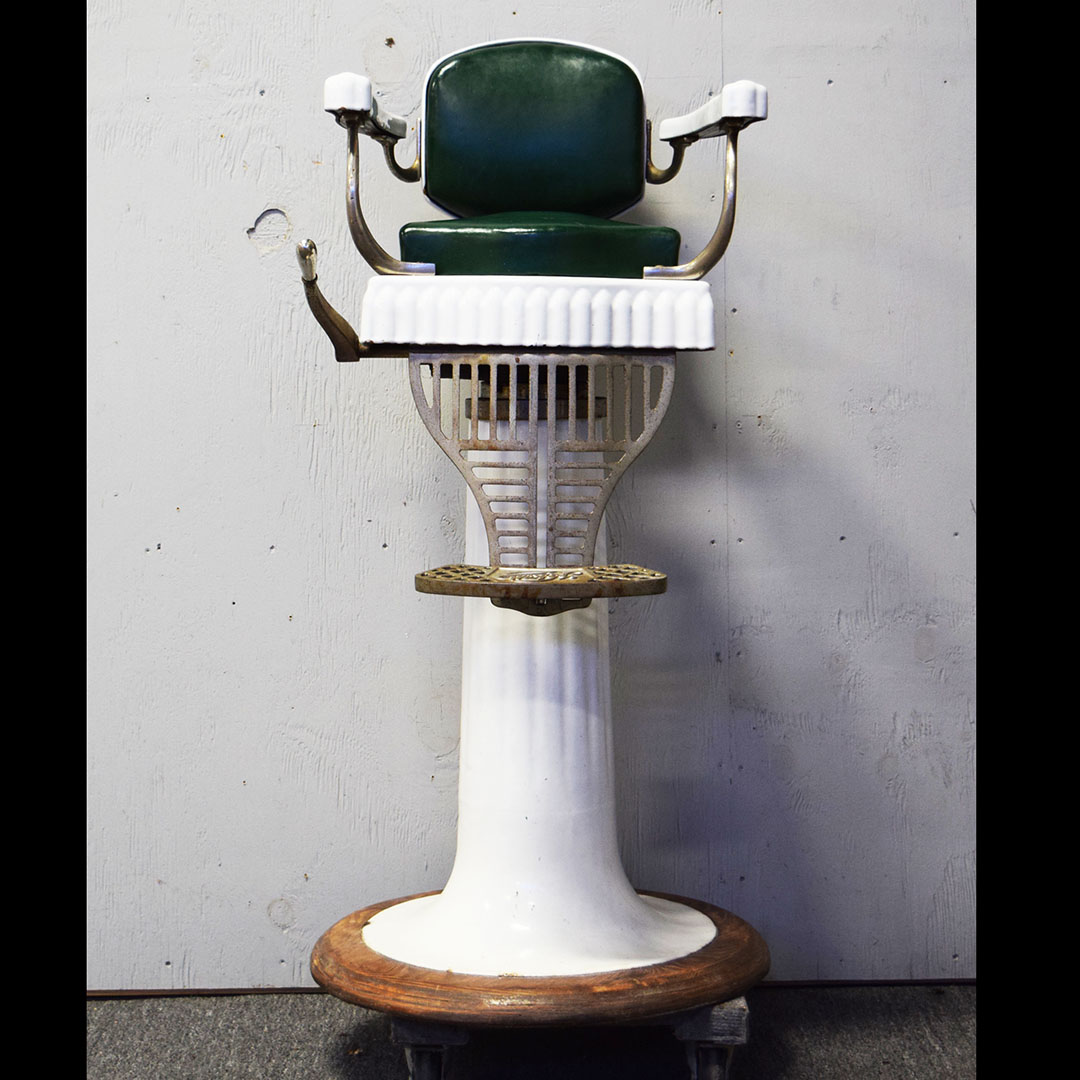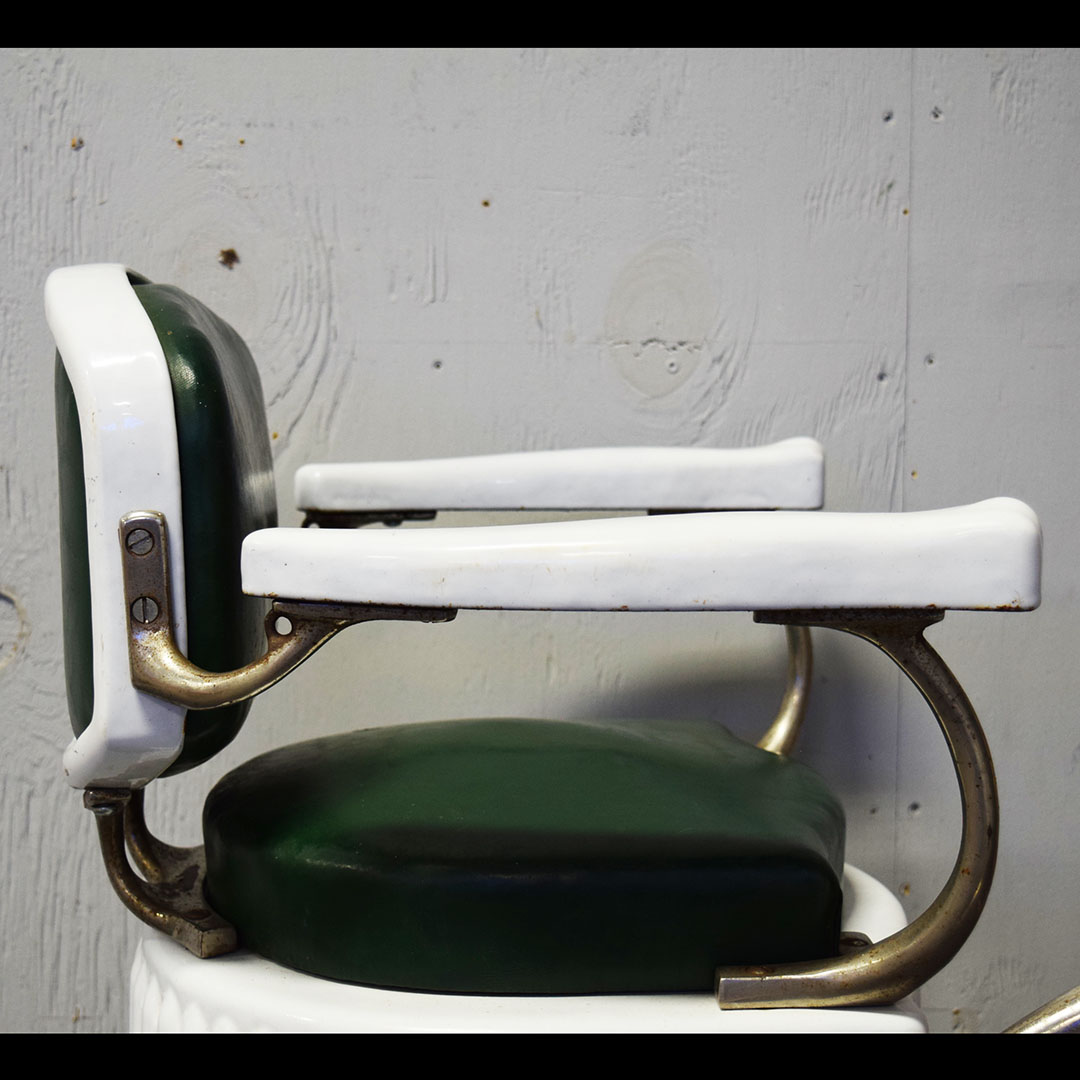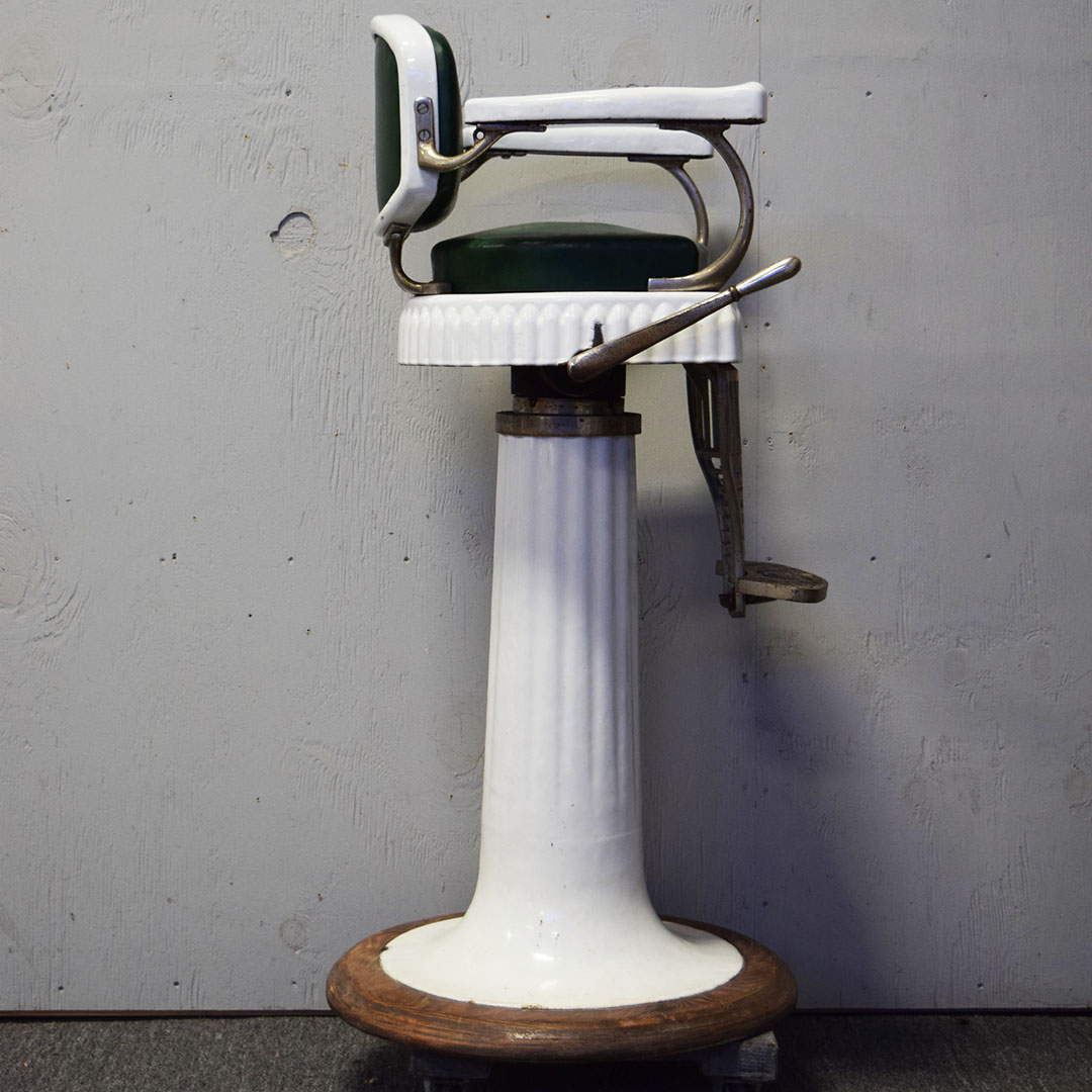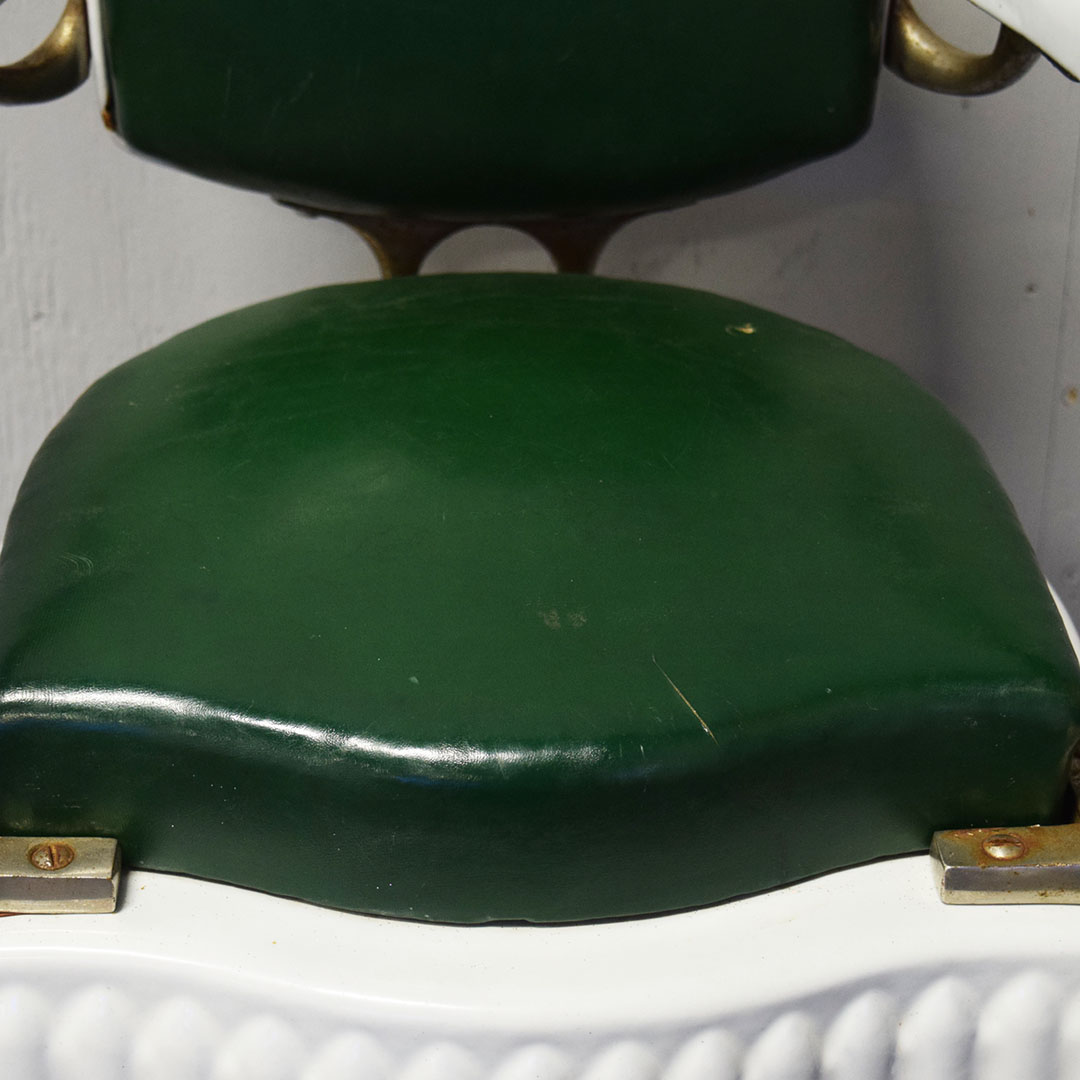 Are you Looking for a unique item to add to your barbershop collection? This Koken Child’s Barbershop Chair may be what you’re looking for! Finished in white porcelain, Koken produced it to fit a toddler exclusively when it was time for a haircut. The pedestal, seat base, arms, and back are white porcelain, and the seating surfaces are original leather. The back support, arm supports, and footrests are metal, as is the hydraulic arm on the right side. Chipping can be seen on the porcelain finish, most notably by the arm on the right side and some chips on the base. On the original leather seat, a small cut is on the front edge and a wear split on the back edge. The metal trim is all original and has typical wear for the age. The hydraulics do not work. A wooden base on the bottom completes the chair and adds stability. This child’s barber chair dates from the 1920s to 1930s and is in unrestored condition. Due to the size and weight, please get in touch with us for a shipping estimate. 20970-WPPP